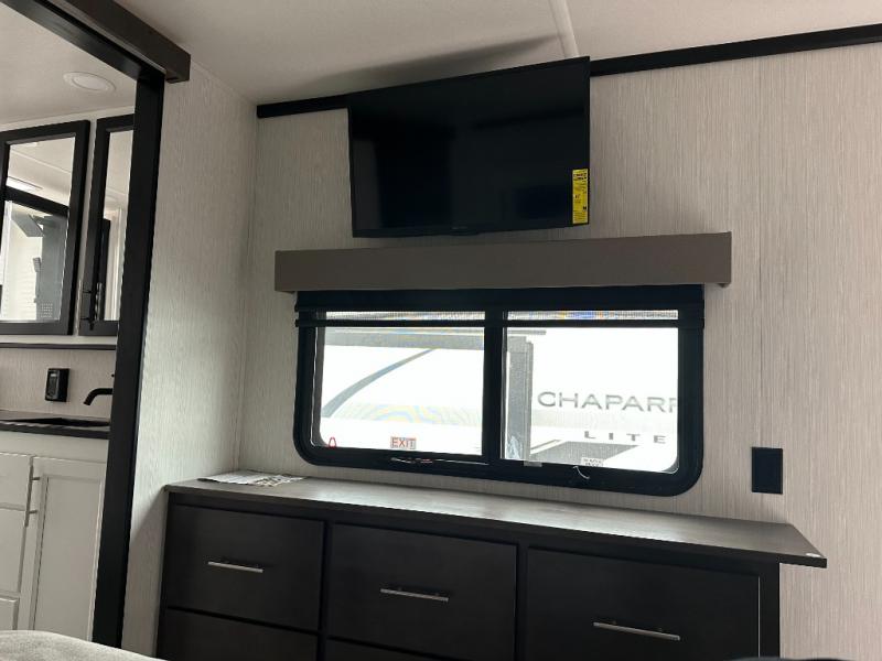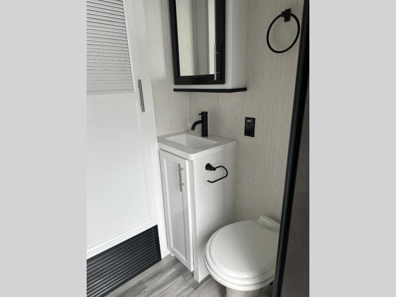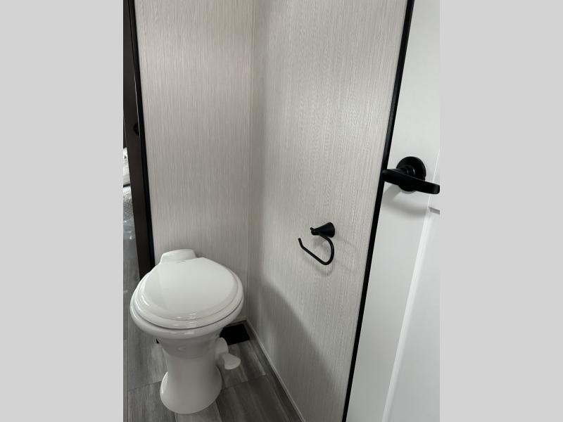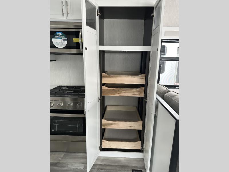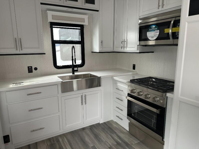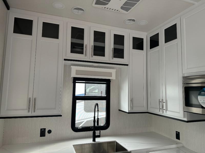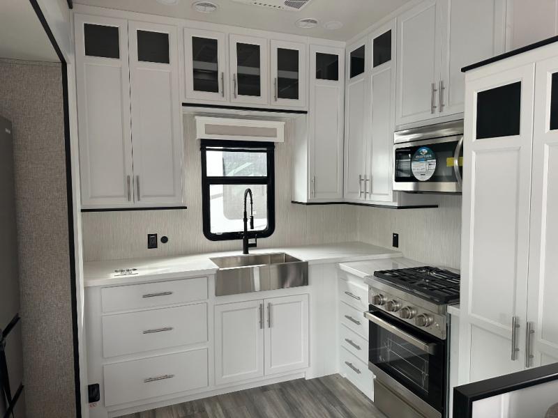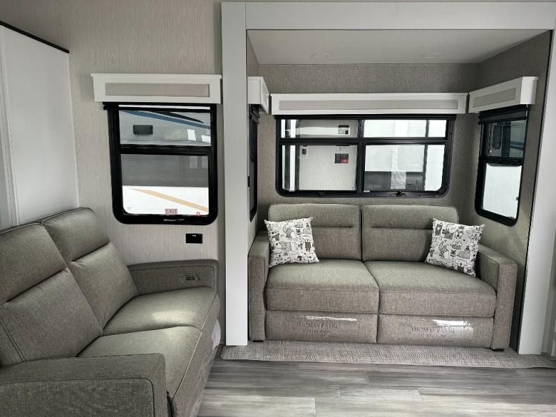 If you need to get some work done while you are camping in this fifth wheel then you will appreciate the desk with a chair! The rear kitchen has plenty of countertop space and a three burner cooktop to cook your best meals, a 20 cu. ft. 12V refrigerator with an ice maker to store any leftovers, and a wall mounted dining table with an extension and an ottoman. The hide-a-bed sofa slide opens up the living area which also has power theater seating across from an entertainment center with a fireplace and TV. The half bathroom has a closet with washer/dryer prep so you can have clean clothes throughout your entire trip. Inside the master suite is a king bed slide and access to the front full bathroom which has a walk-in closet, a shower with a seat, and a dual sink vanity for two to get ready at once.