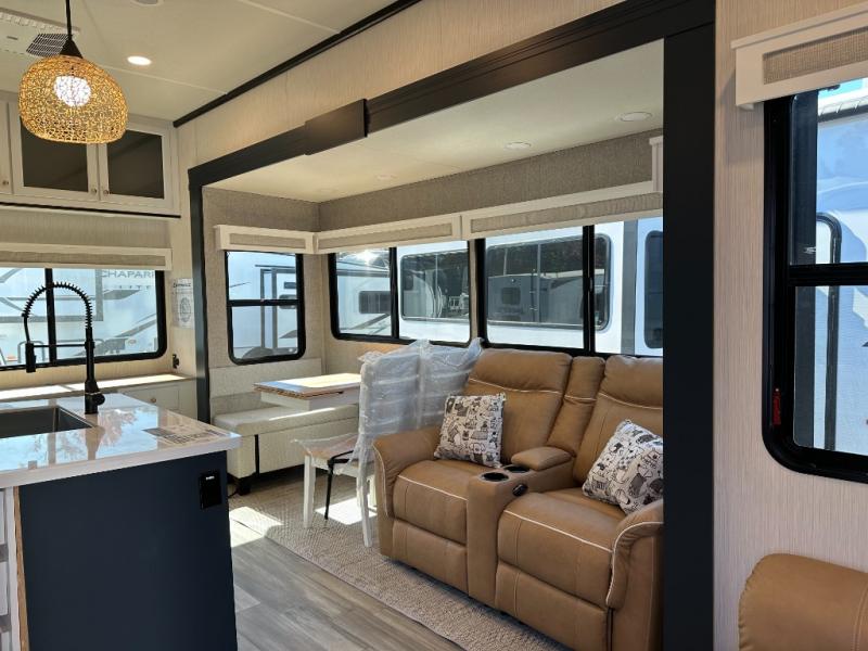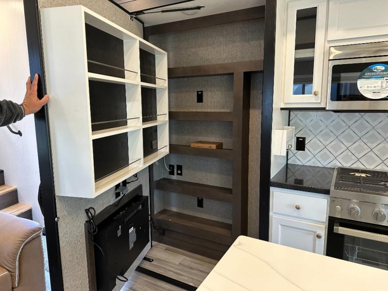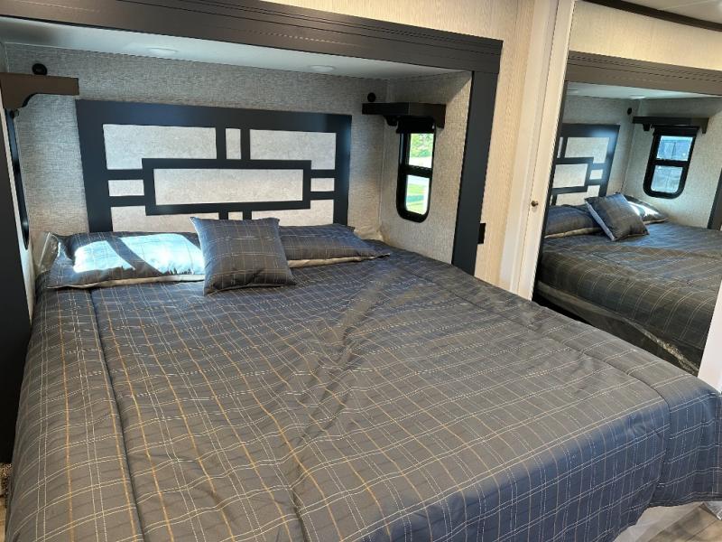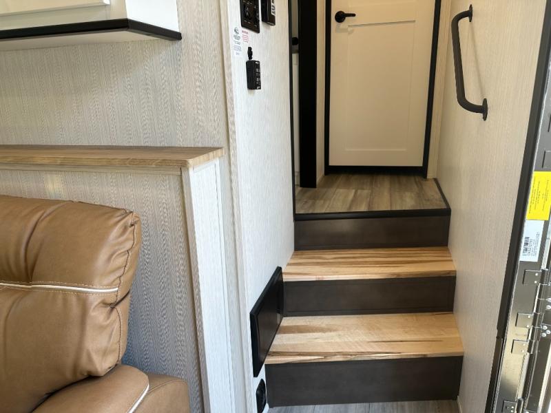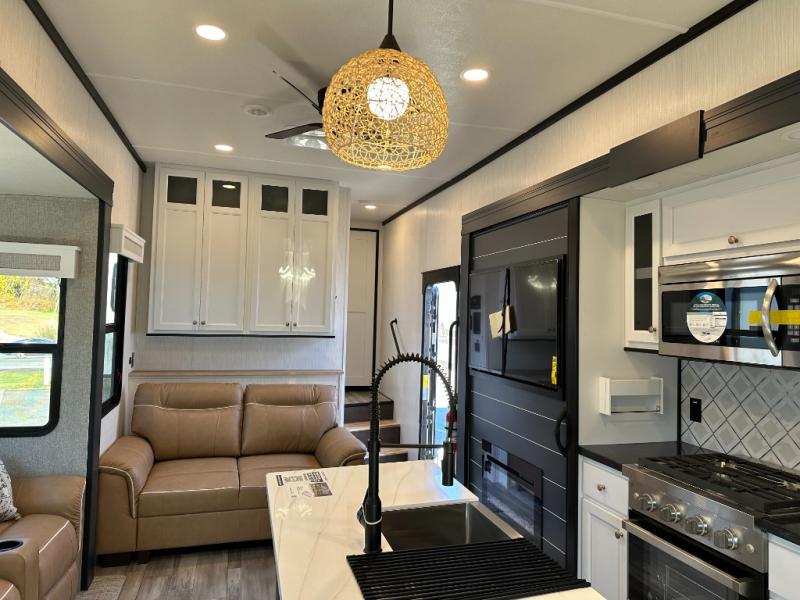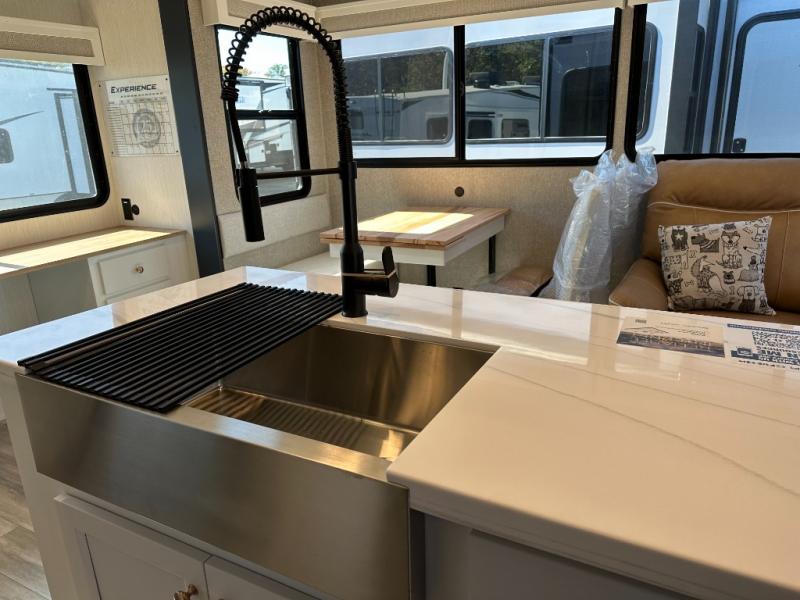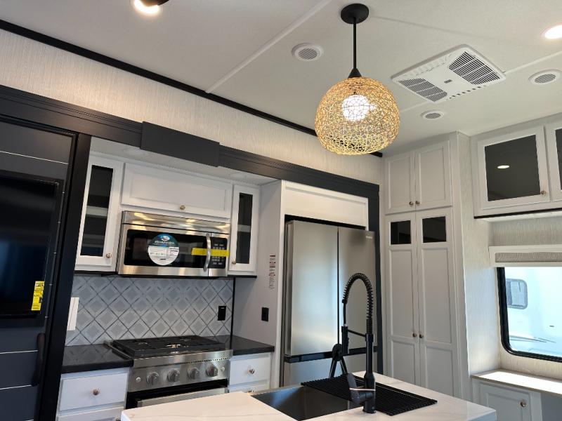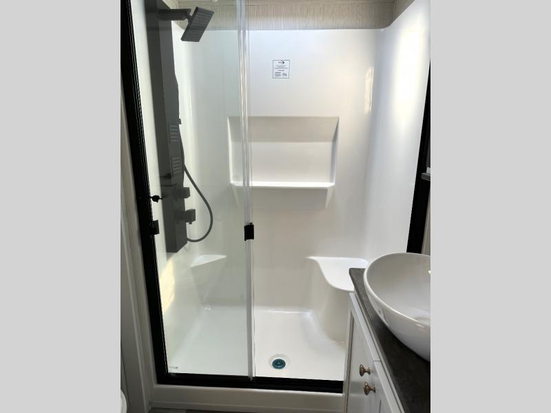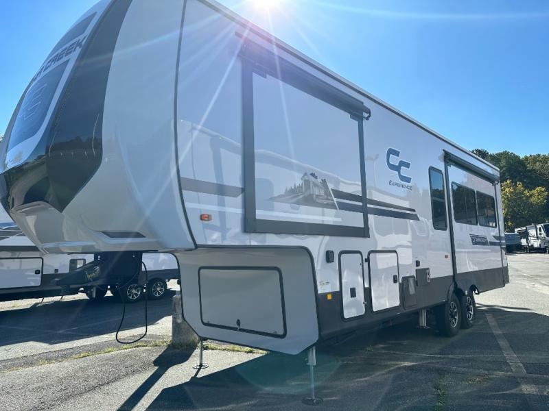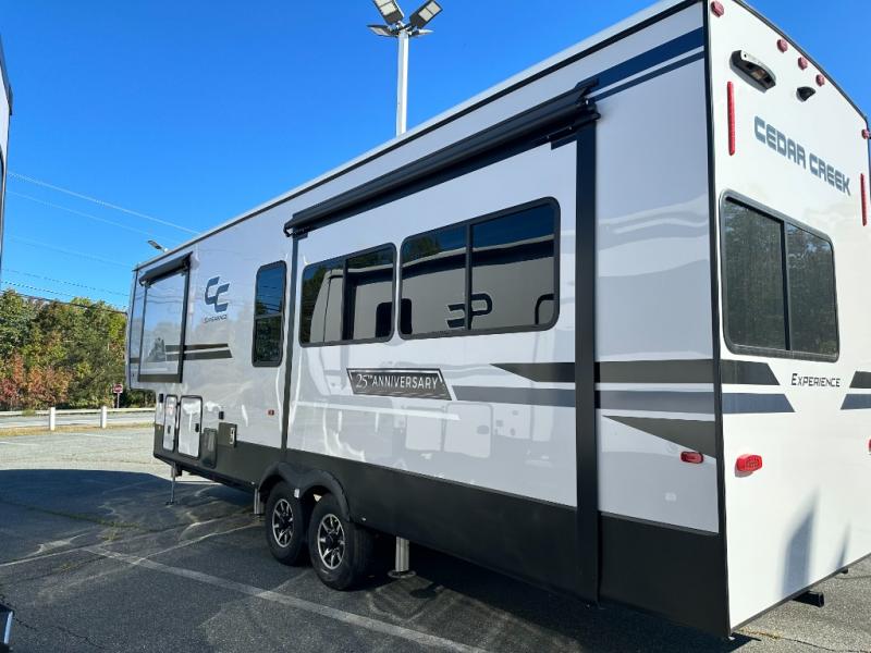 With any Cedar Creek Experience fifth wheel by Forest River, you will bet met with luxury features both inside and out! The True Gelcoat exterior is the best of the best in exteriors and the 3M bonded sidewalls will hold up over years of use. Each model includes Lippert 7,000 lb. axles with ABS brakes, Road Warrior suspension, plus TST tire pressure monitoring system to make towing that much easier. You will also find a 200 watt solar panel outside, along with a heated front storage compartment, a Nautilus P4 multi-function panel with an outside shower, black tank flush, and 12V battery disconnect, plus many more exterior conveniences. The interior will have you feeling like you haven't left home with vinyl floor coverings, Ashley furniture power theater seating, a cozy fireplace, a large bath counter, and the list of comforts goes on! Each model is also pre-wired for satellite to the roof, and you're sure to never go bored with a Smart TV in the living room and an added bedroom TV!