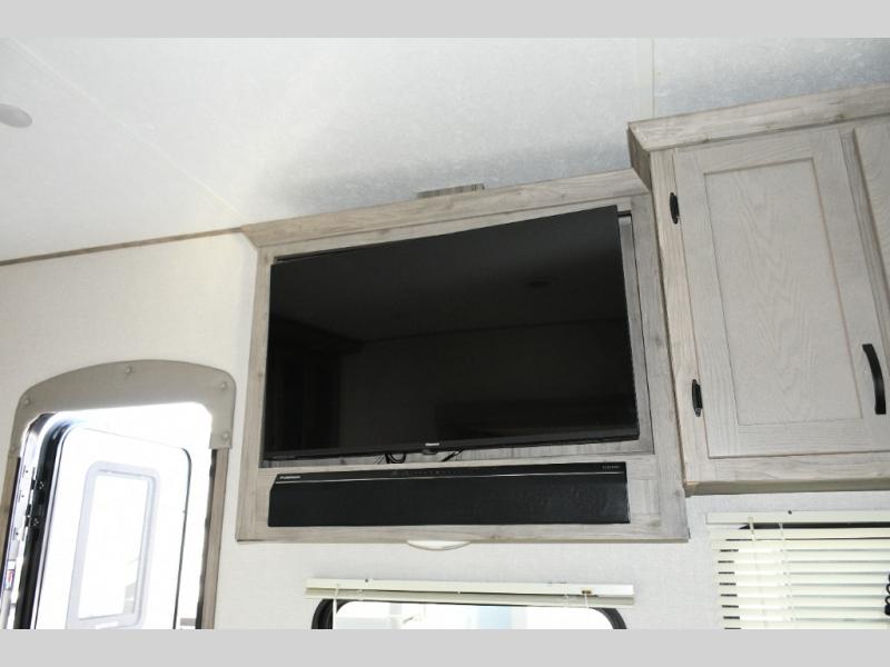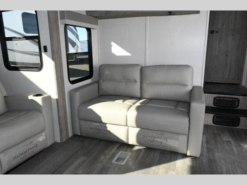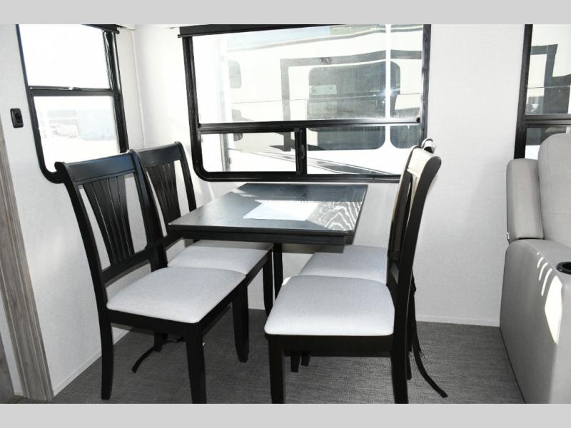 The open-concept living space invites relaxation and togetherness. The tri-fold hide-a-bed sofa adds extra sleeping capacity for guests, while the free-standing dinette offers the perfect spot for meals or game nights. A modern sound bar with stereo and a high BTU electric fireplace make it easy to unwind in comfort.