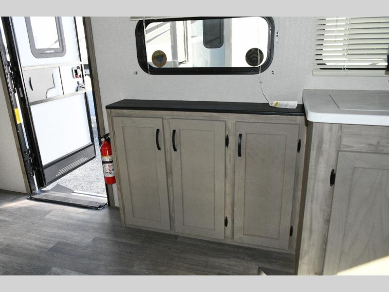 The kids will love having their own retreat in the private rear bunkhouse, featuring two sets of 30" x 74" bunks and plenty of wardrobe storage. Best of all, the bunkhouse includes its own full bathroom with an exterior entry door — perfect for keeping muddy feet and outdoor messes out of the main living space.