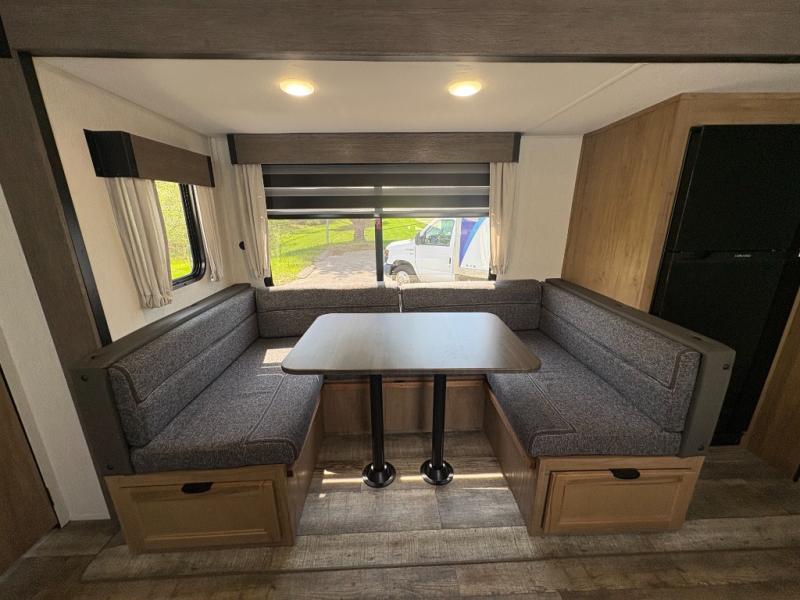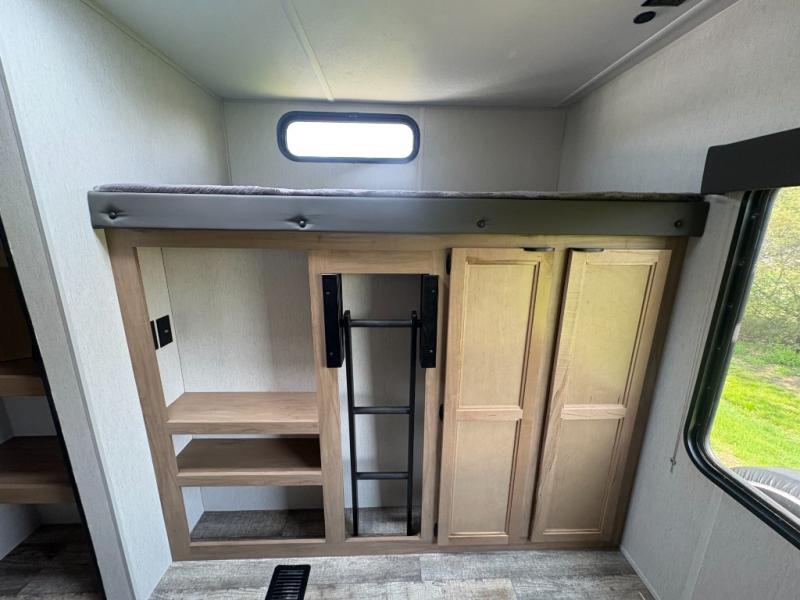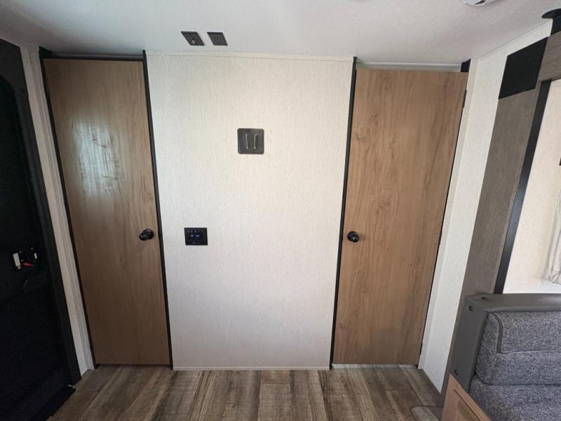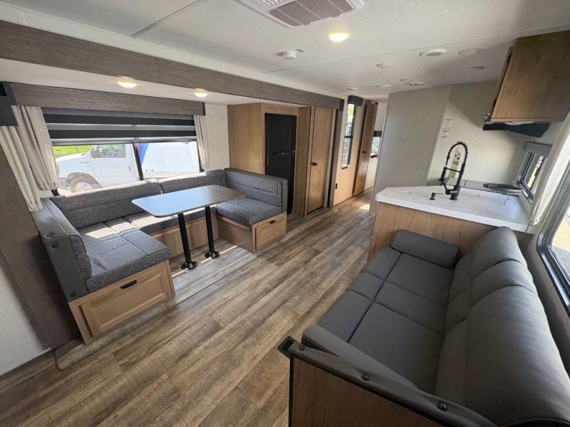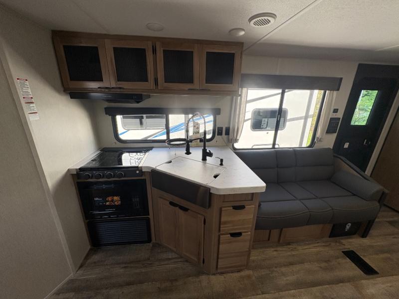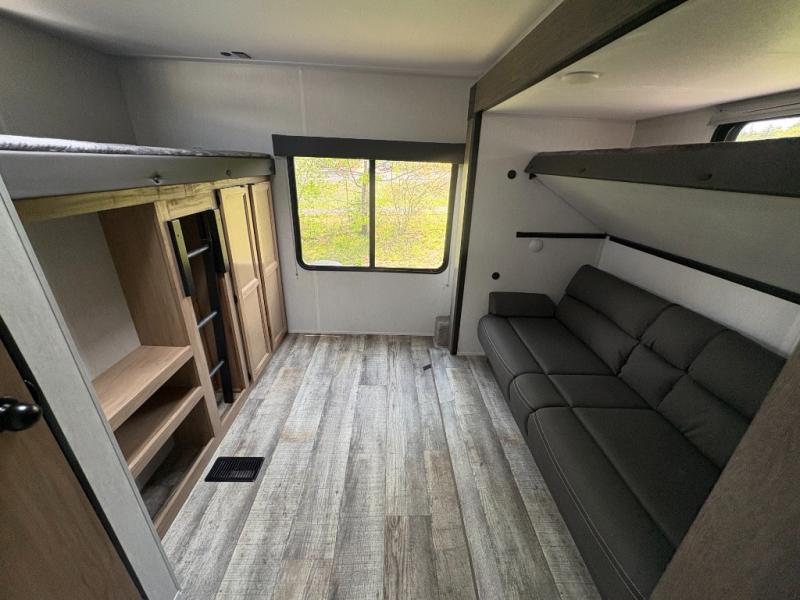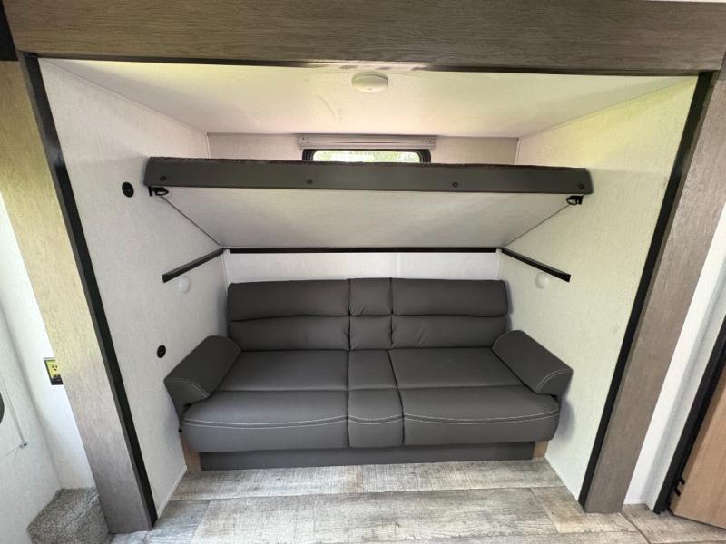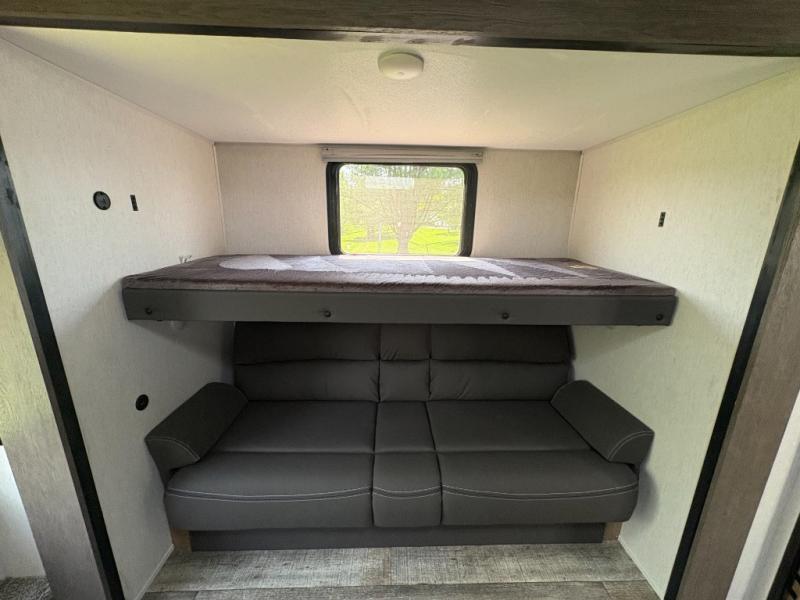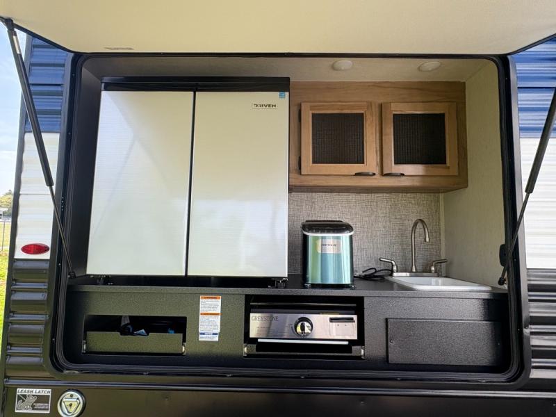 The whole family will love camping in this travel trailer! The kiddos or guests will have their own privacy with the rear private bunkhouse which has a bunk, a linen closet, and a flip up bunk above a sofa slide. And you will have your own privacy with the front private bedroom with a queen bed that has wardrobes on either side, a TV mount area, and an entrance into the dual entry bathroom. The bathroom also has one of the dual entry doors to the unit so you can get back to having fun outside fast. The kitchen has everything you need to prepare your best meals, and there is even an outside kitchen with a 5.6 cu. ft. refrigerator, a sink, and a pull out stove top to cook pancakes while watching the sunrise. Plus, an outside TV mount area to watch the big game under the stars!