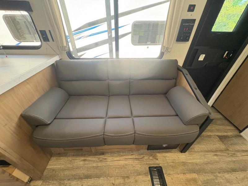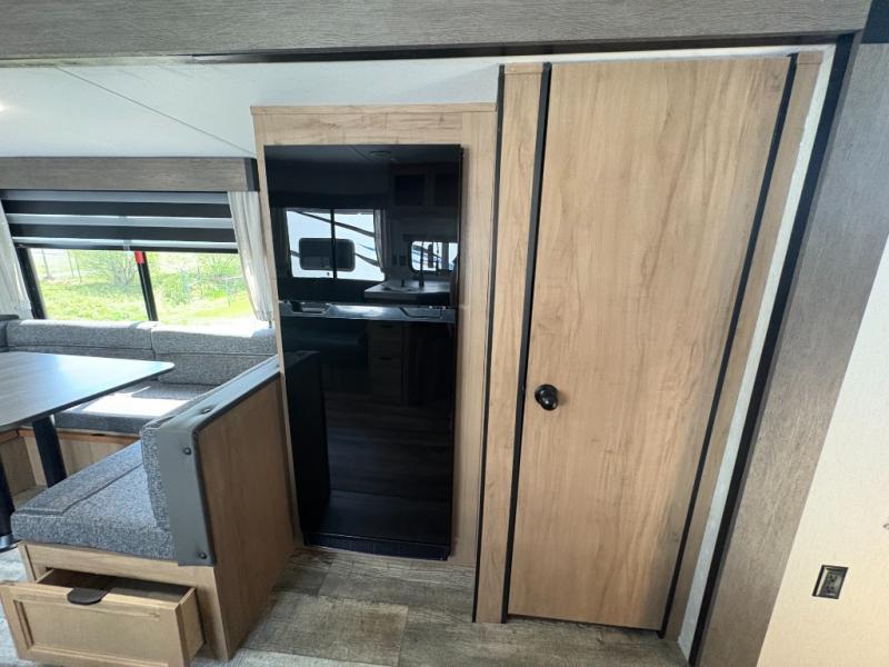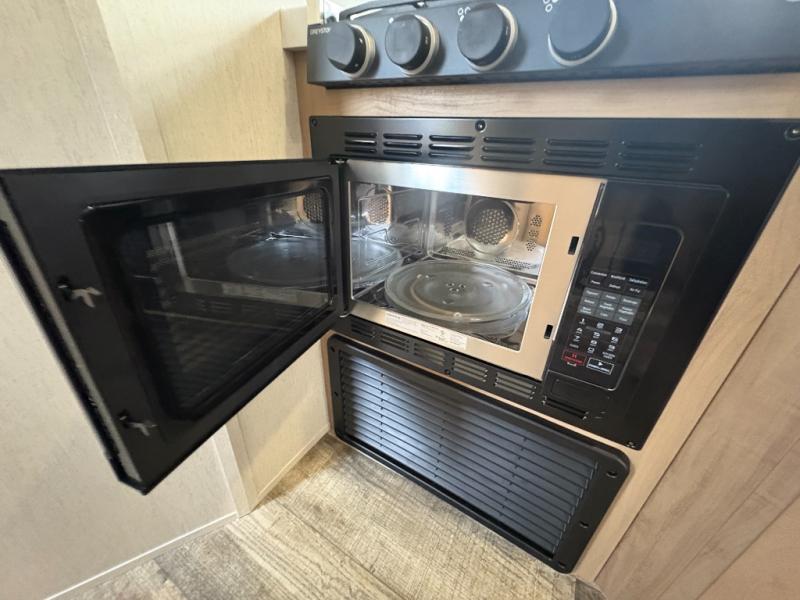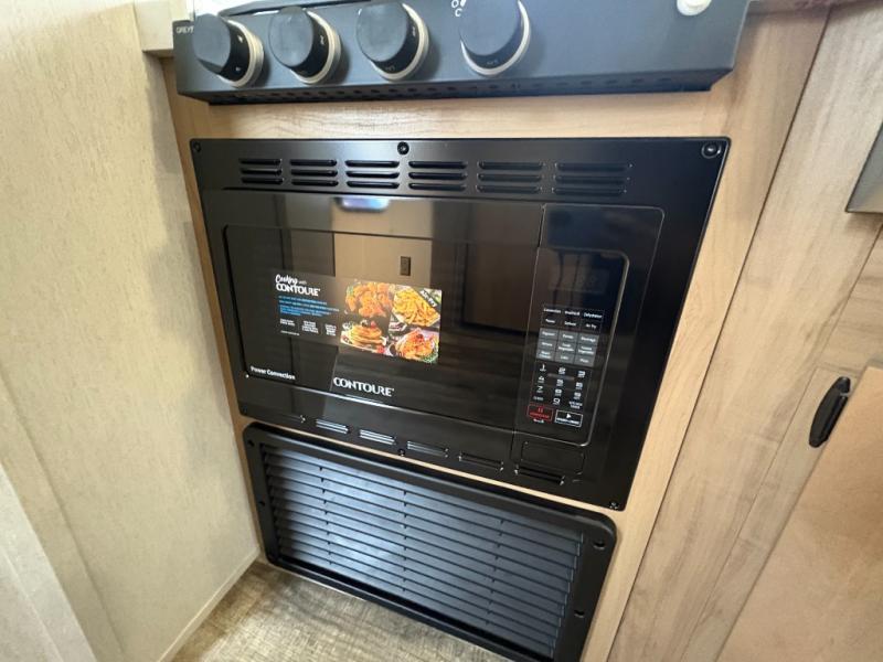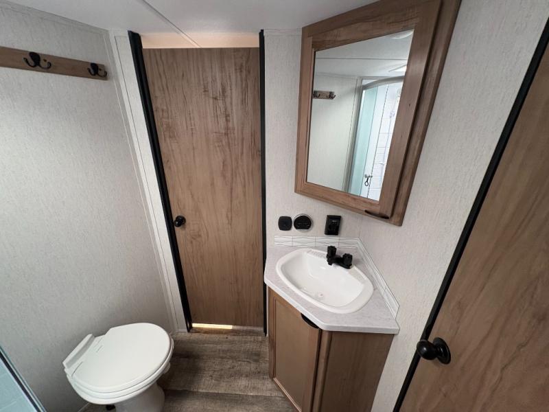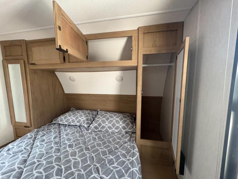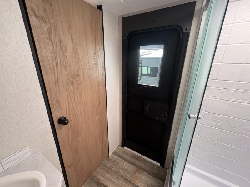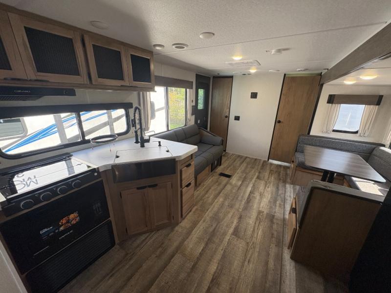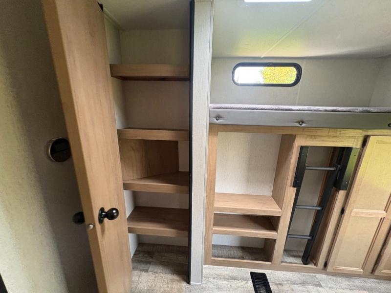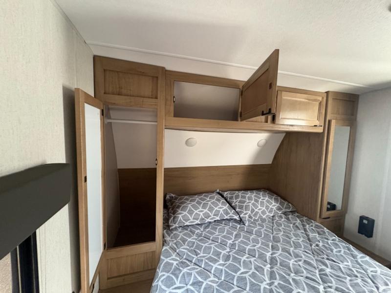 The whole family will love camping in this travel trailer! The kiddos or guests will have their own privacy with the rear private bunkhouse which has a bunk, a linen closet, and a flip up bunk above a sofa slide. And you will have your own privacy with the front private bedroom with a queen bed that has wardrobes on either side, a TV mount area, and an entrance into the dual entry bathroom. The bathroom also has one of the dual entry doors to the unit so you can get back to having fun outside fast. The kitchen has everything you need to prepare your best meals, and there is even an outside kitchen with a 5.6 cu. ft. refrigerator, a sink, and a pull out stove top to cook pancakes while watching the sunrise. Plus, an outside TV mount area to watch the big game under the stars!