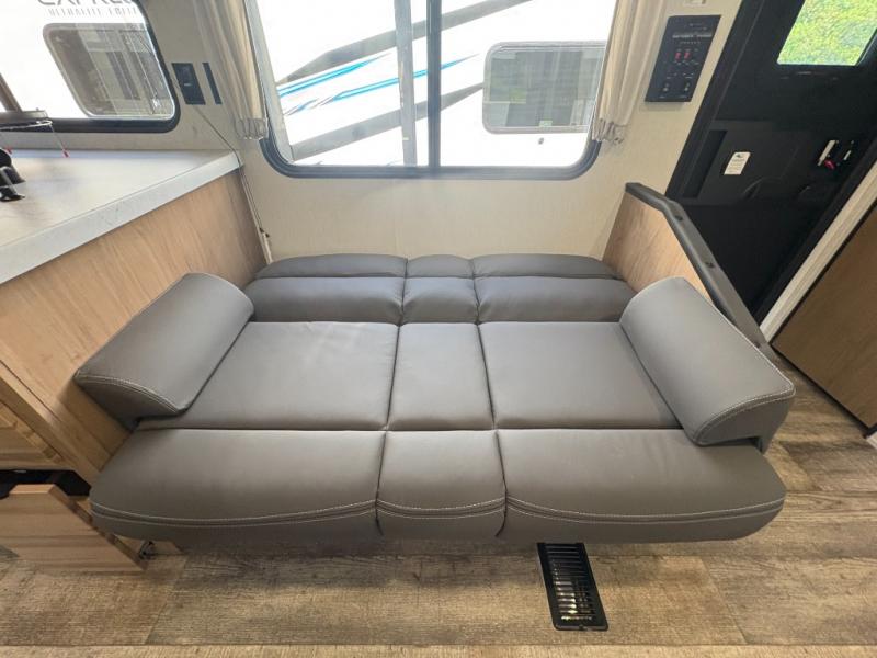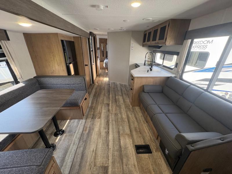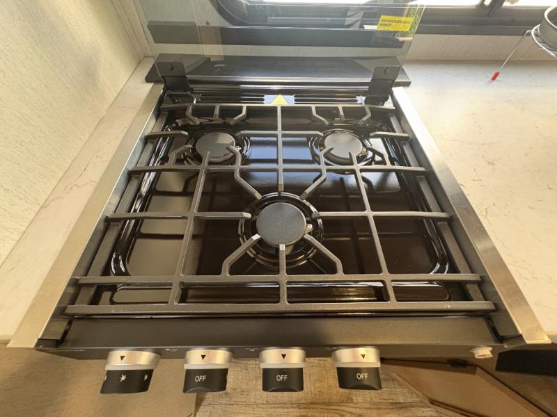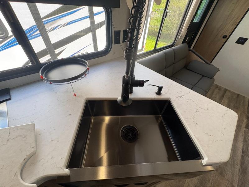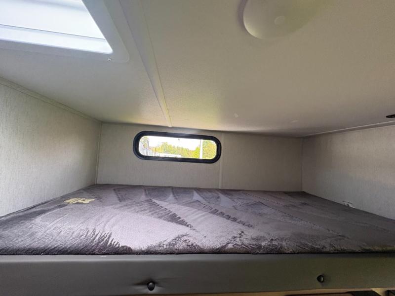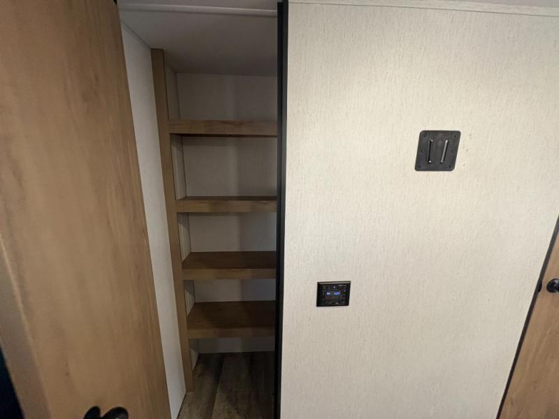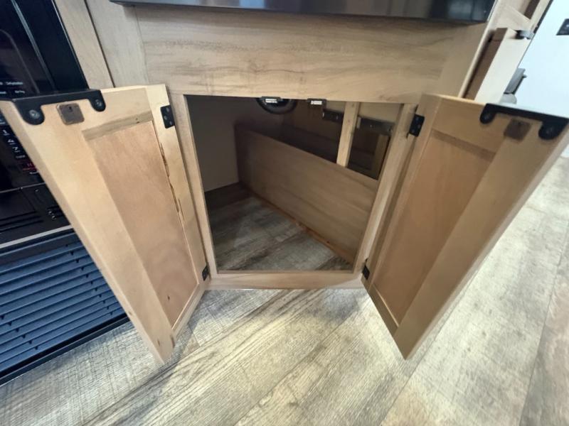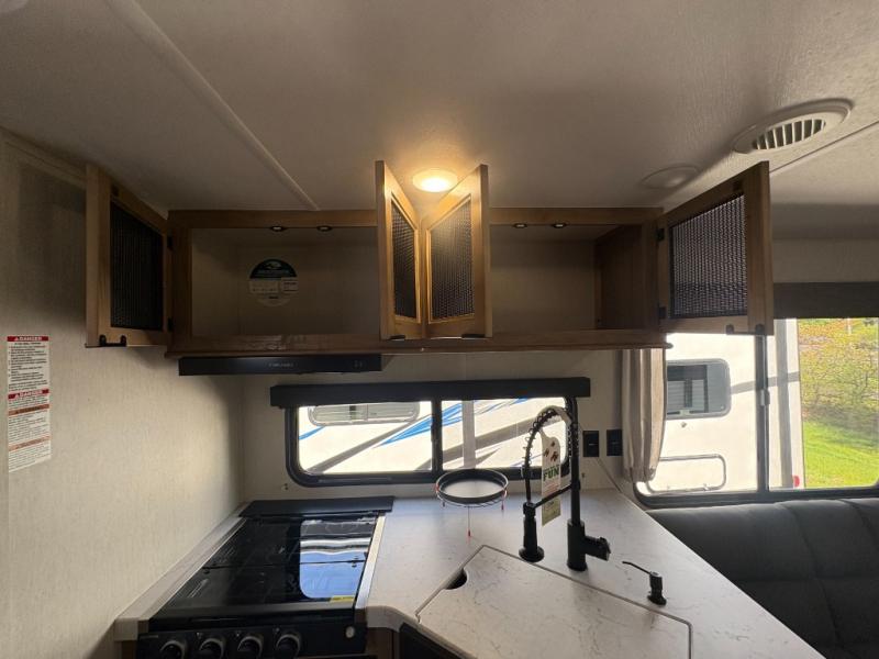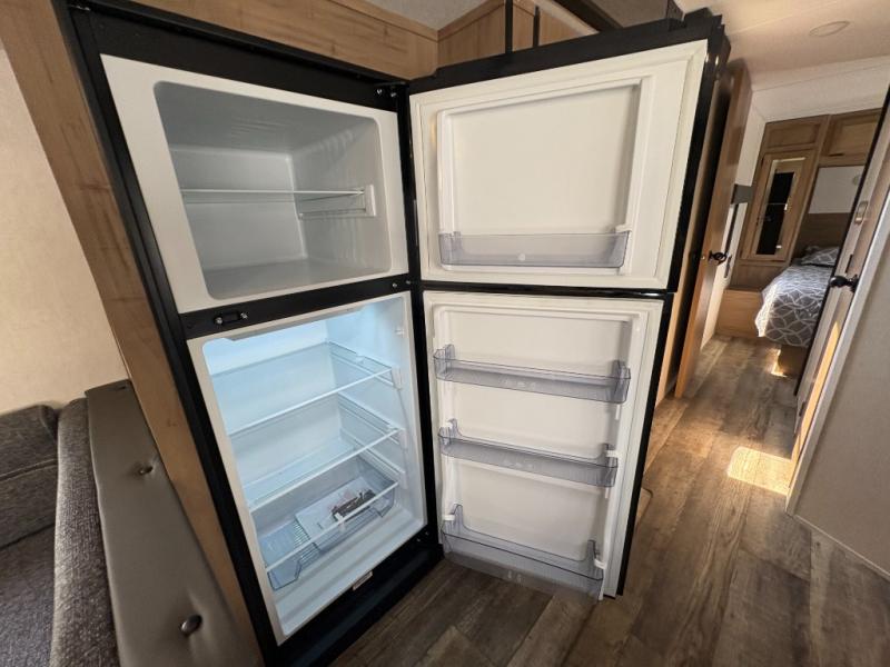 The whole family will love camping in this travel trailer! The kiddos or guests will have their own privacy with the rear private bunkhouse which has a bunk, a linen closet, and a flip up bunk above a sofa slide. And you will have your own privacy with the front private bedroom with a queen bed that has wardrobes on either side, a TV mount area, and an entrance into the dual entry bathroom. The bathroom also has one of the dual entry doors to the unit so you can get back to having fun outside fast. The kitchen has everything you need to prepare your best meals, and there is even an outside kitchen with a 5.6 cu. ft. refrigerator, a sink, and a pull out stove top to cook pancakes while watching the sunrise. Plus, an outside TV mount area to watch the big game under the stars!