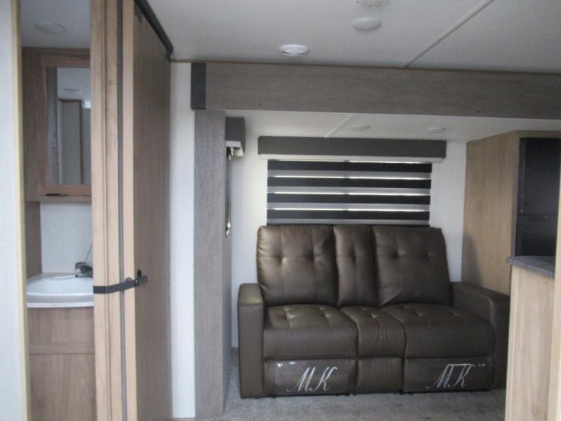 Looking for the perfect trailer for two with a spacious bathroom and bedroom? This Alpha Wolf provides a rear oversized bathroom complete with linen storage and a barn-style door that saves space and looks great. The front bedroom includes a walk-around queen bed, dual shirt closets and nightstands, a farm-style door plus windows for natural lighting and great views. The main living and kitchen area is spacious as well with a large slide out that includes theater seating with cupholders across from the entertainment center with a fireplace, a 12V residential refrigerator for lots of cold storage, and a pantry for your snacks and dry goods. You can decide to cook indoors on the three burner cooktop, or head outdoors to cook on the deluxe outside kitchen, complete with a two burner cooktop, a refrigerator, a sink, and ice!