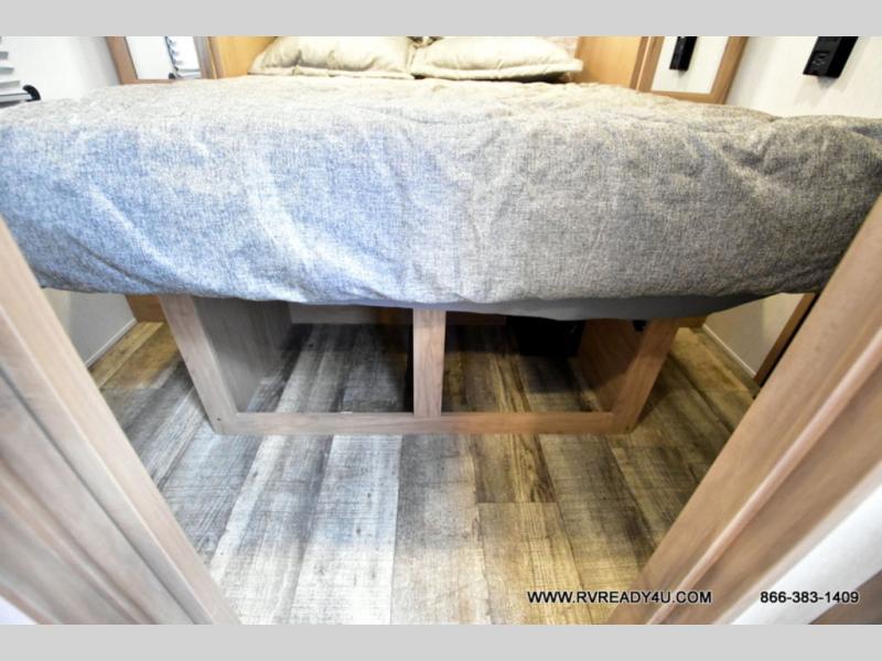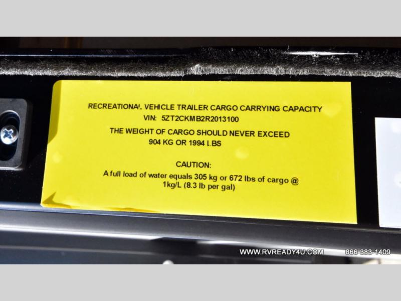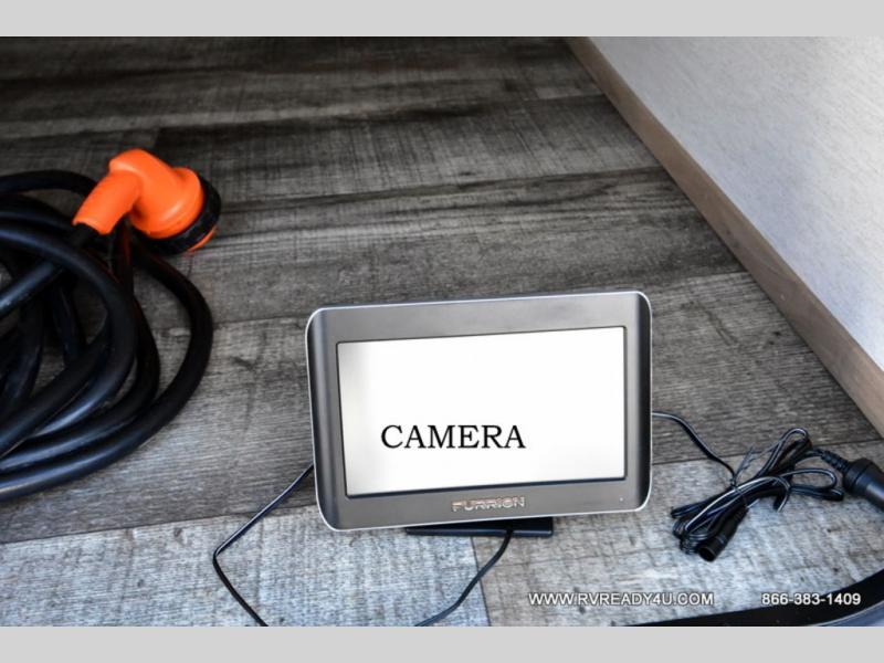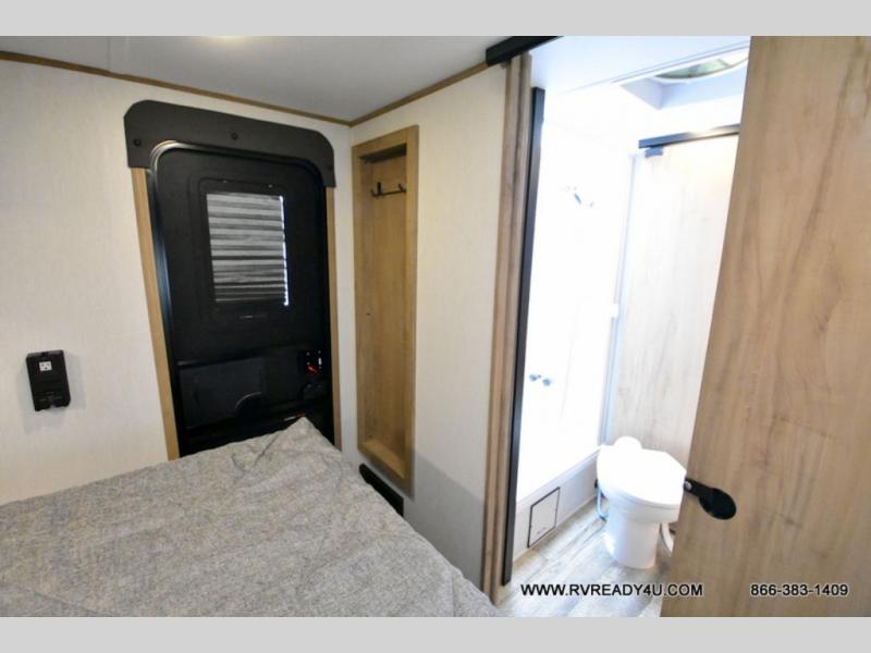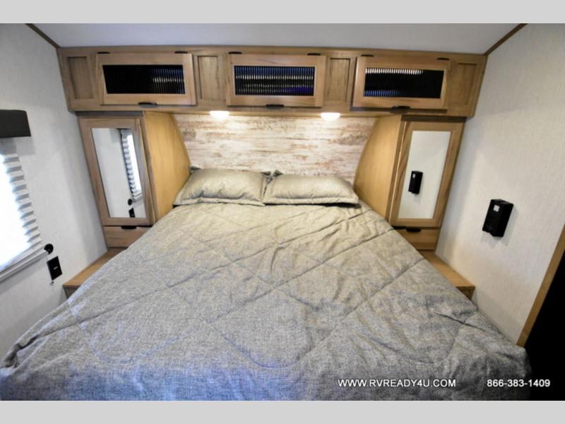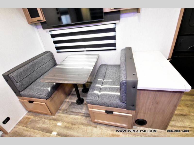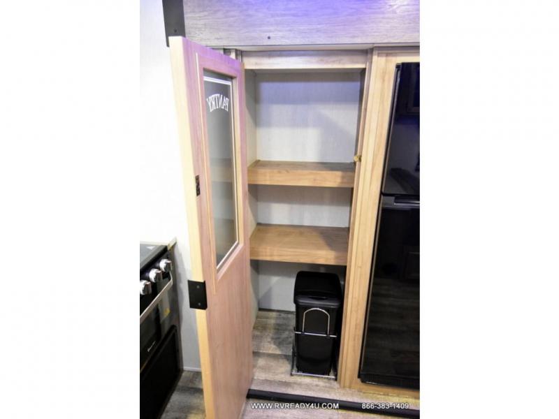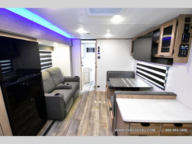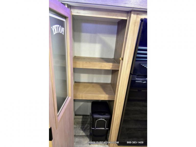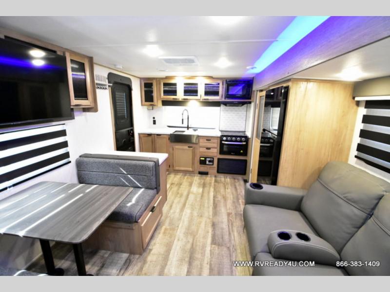 You and your spouse will have a comfortable time camping in this travel trailer! The front private bedroom has a queen bed with wardrobes on either side of it, plus one of the dual entry doors to the unit. As you leave the bedroom, you will enter the walk-through bathroom which has a shower with a skylight above and a removable clothes hanging rod to dry off your swimsuit after swimming in the lake. The chef can prepare their best home cooked meals in the rear kitchen, and you can enjoy them at the booth dinette before storing any leftovers in the 12V refrigerator. The theater seating has cupholders so you can enjoy a beverage while you read your favorite book!