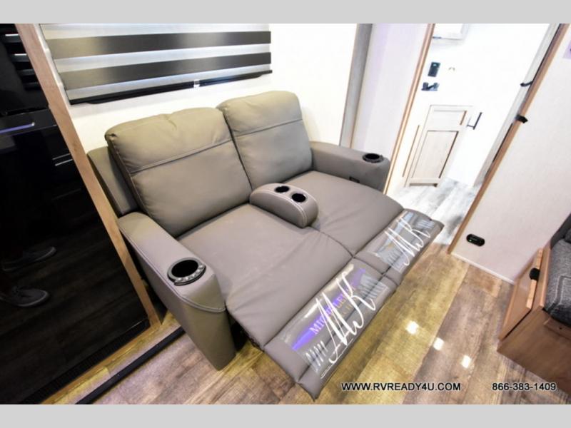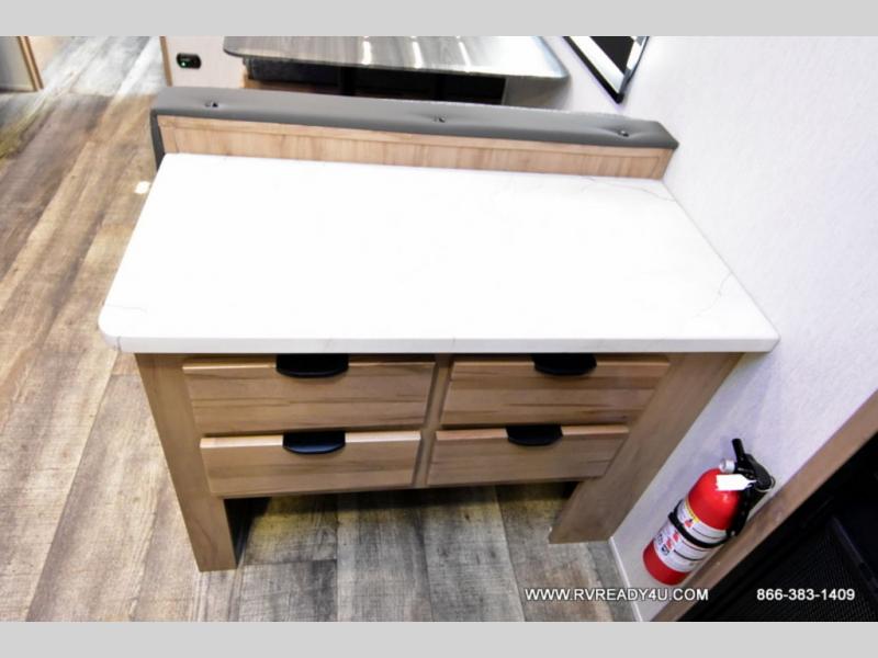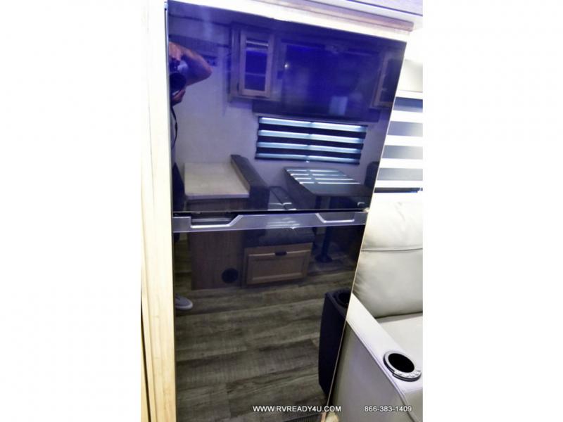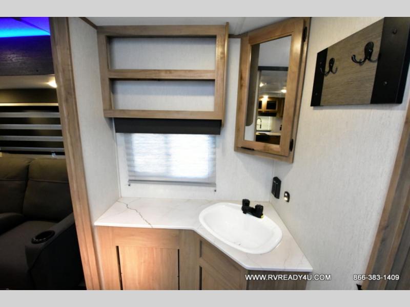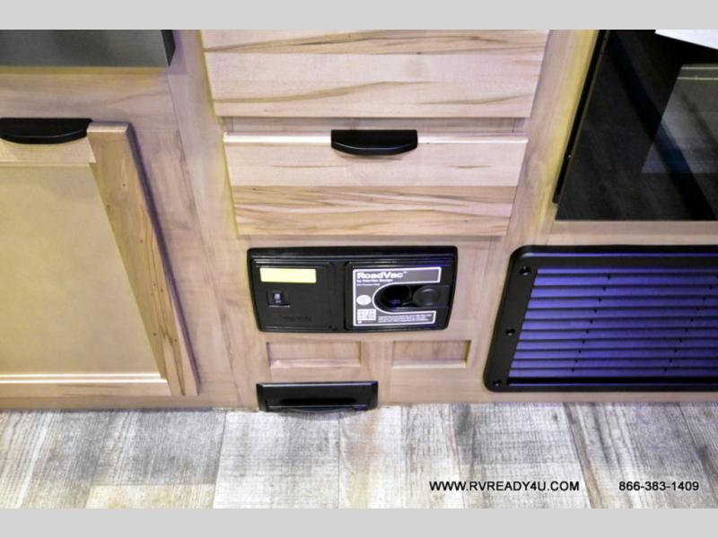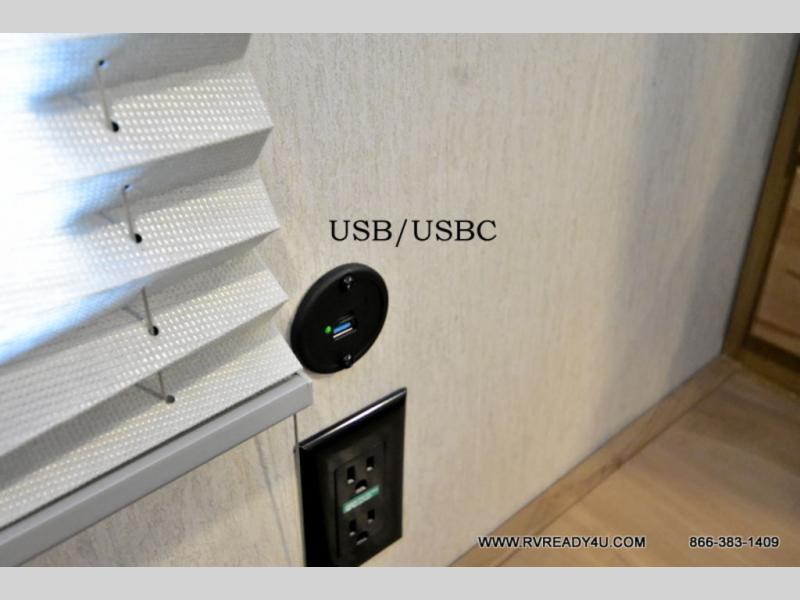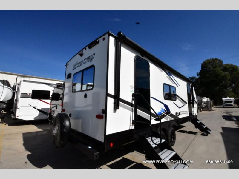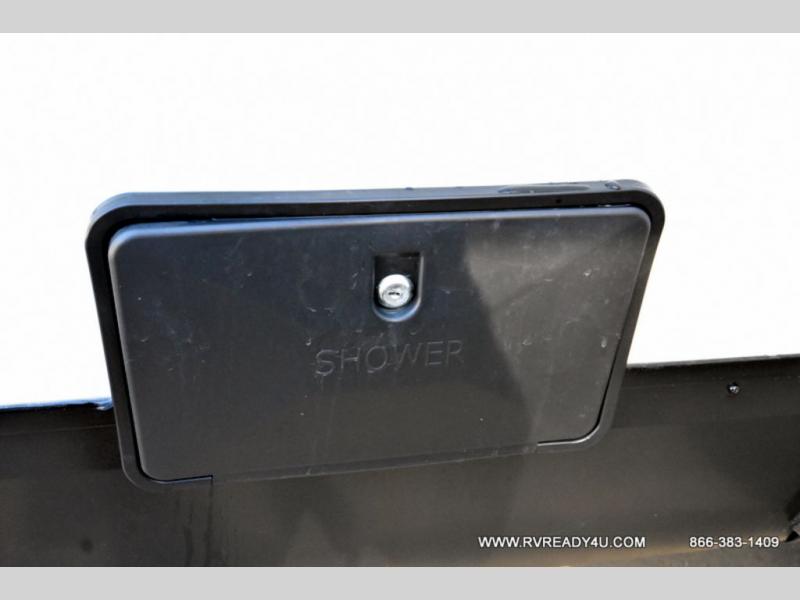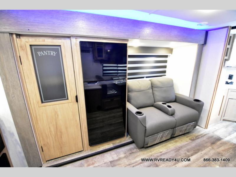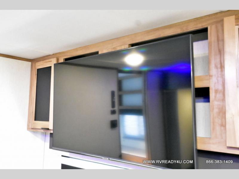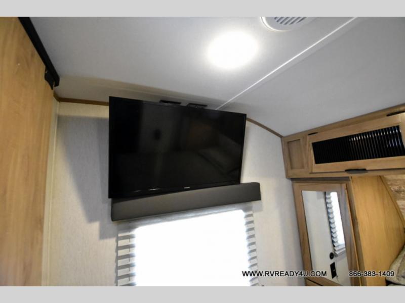 You and your spouse will have a comfortable time camping in this travel trailer! The front private bedroom has a queen bed with wardrobes on either side of it, plus one of the dual entry doors to the unit. As you leave the bedroom, you will enter the walk-through bathroom which has a shower with a skylight above and a removable clothes hanging rod to dry off your swimsuit after swimming in the lake. The chef can prepare their best home cooked meals in the rear kitchen, and you can enjoy them at the booth dinette before storing any leftovers in the 12V refrigerator. The theater seating has cupholders so you can enjoy a beverage while you read your favorite book!