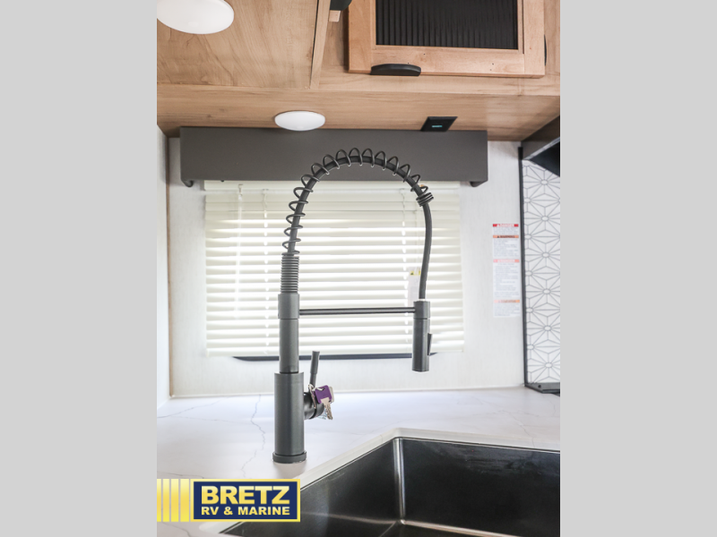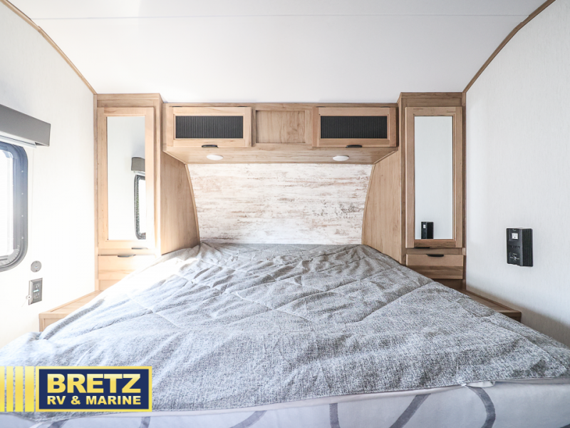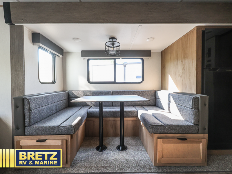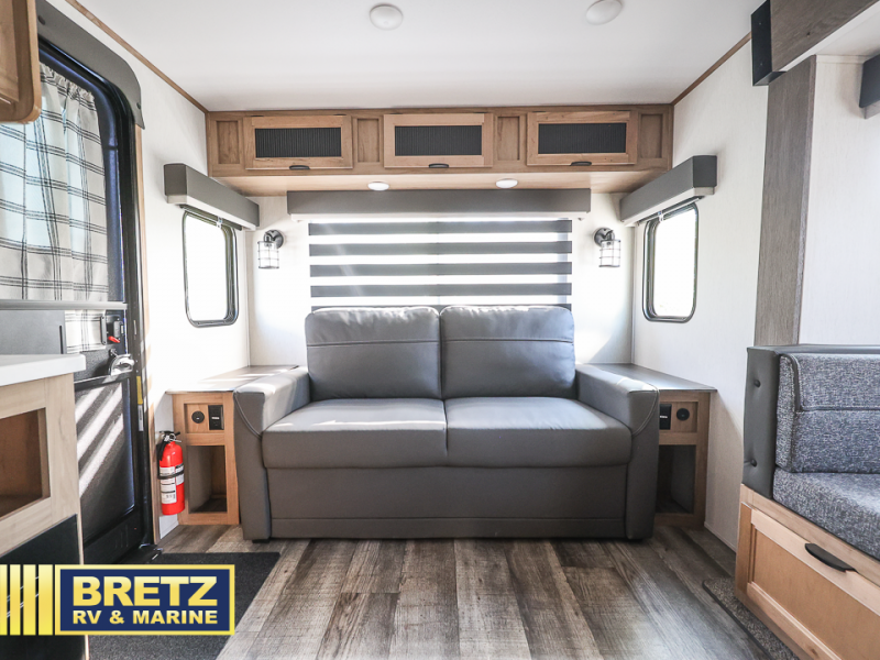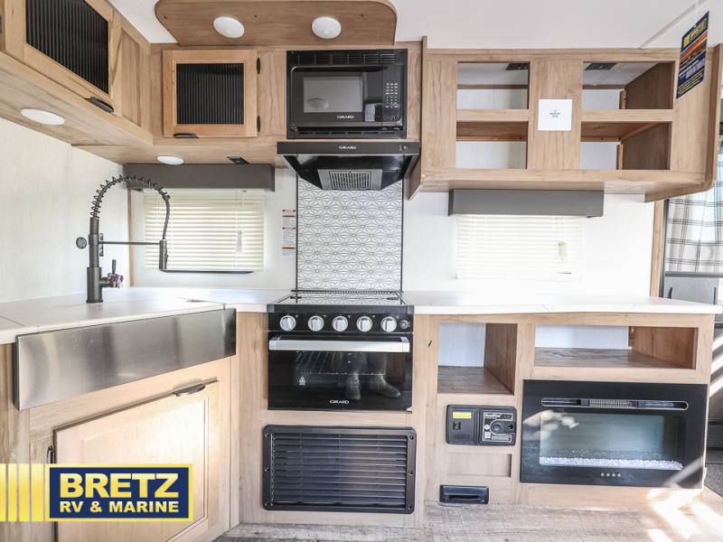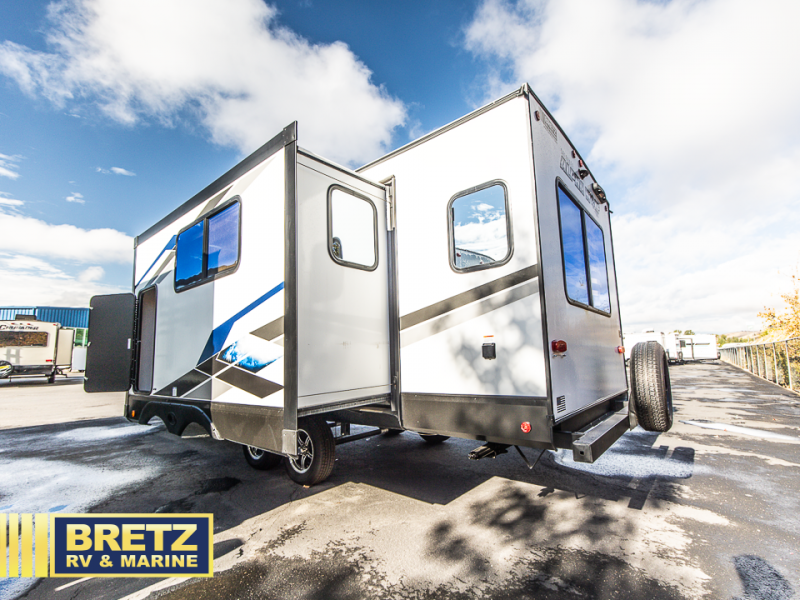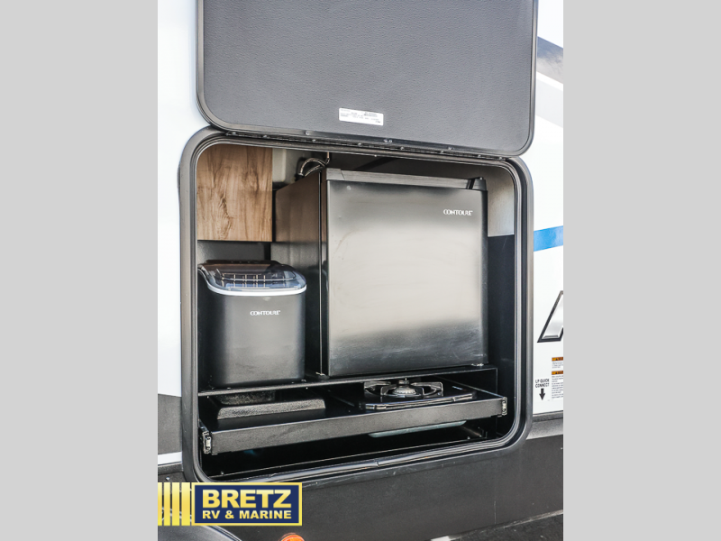 You will love all that this travel trailer has to offer! The rear living area includes a tri-fold sofa with overhead cabinets for your items and a rear window view of your beautiful surroundings. There is also an entertainment center with a fireplace for a cozy evening indoors while you play games at the U-shaped dinette. The kitchen has everything needed for food prep and serving, and the outside kitchen with ice and fridge will be a favorite as well. The 20' awning will provide an outdoor living area; just grab your camping chairs from the outside storage areas. When you want to call it a night, fall quickly to sleep on the queen bed in the front bedroom with easy access to the walk-through bathroom, plus the bedroom has one of the dual entry doors to the unit.