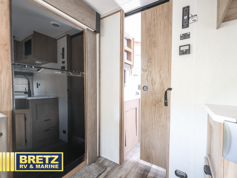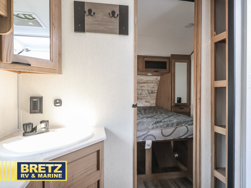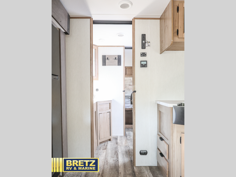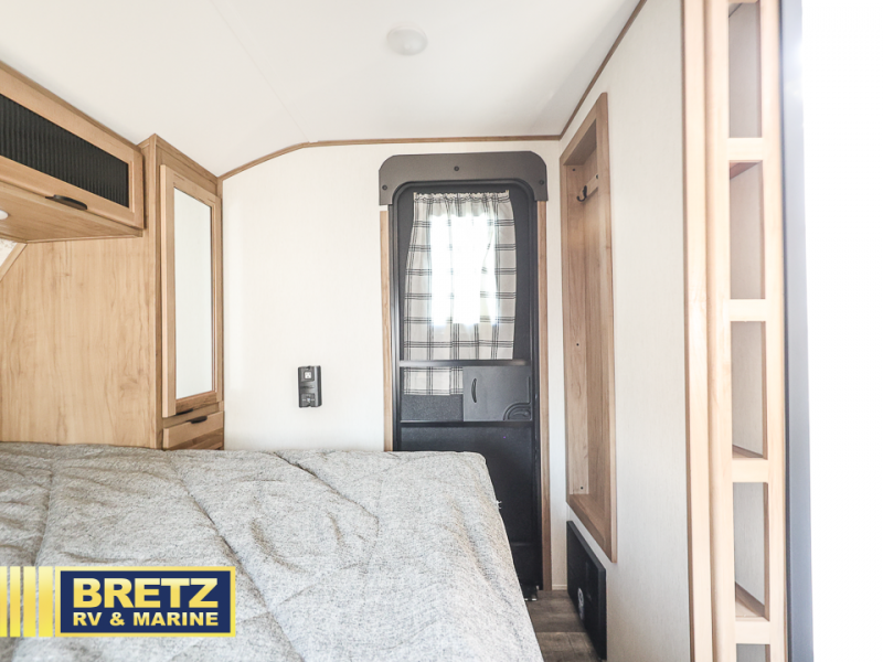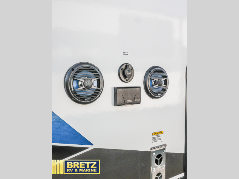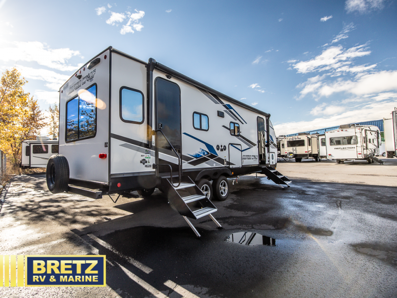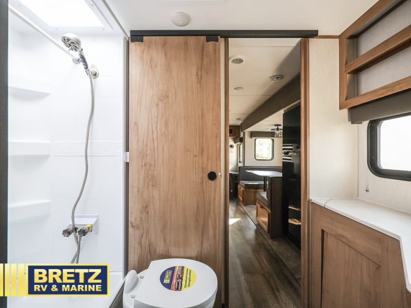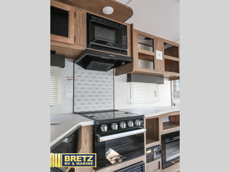 You will love all that this travel trailer has to offer! The rear living area includes a tri-fold sofa with overhead cabinets for your items and a rear window view of your beautiful surroundings. There is also an entertainment center with a fireplace for a cozy evening indoors while you play games at the U-shaped dinette. The kitchen has everything needed for food prep and serving, and the outside kitchen with ice and fridge will be a favorite as well. The 20' awning will provide an outdoor living area; just grab your camping chairs from the outside storage areas. When you want to call it a night, fall quickly to sleep on the queen bed in the front bedroom with easy access to the walk-through bathroom, plus the bedroom has one of the dual entry doors to the unit.