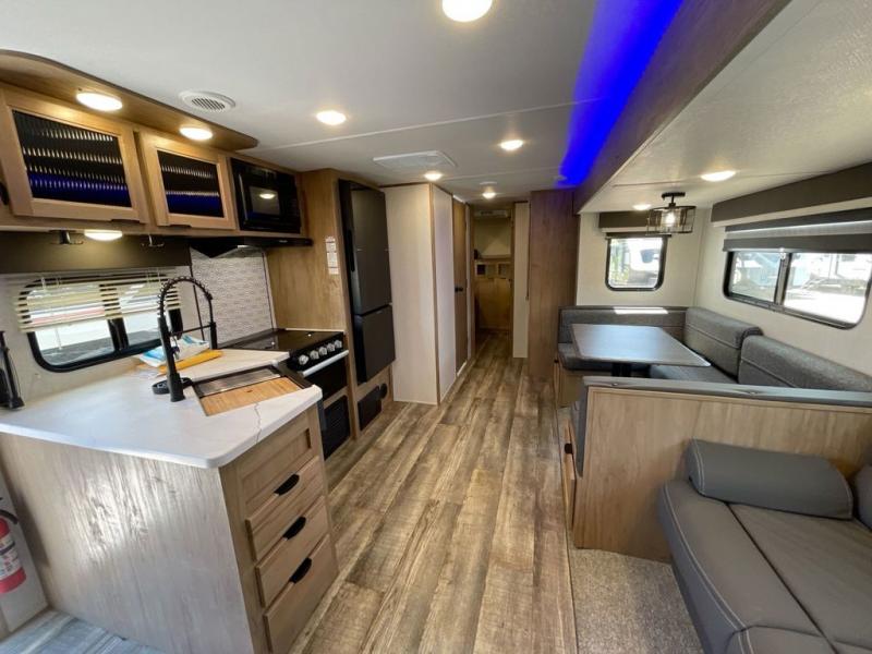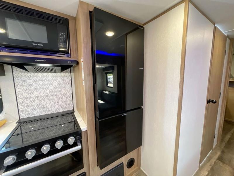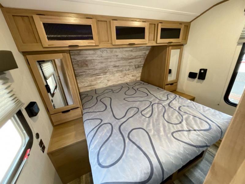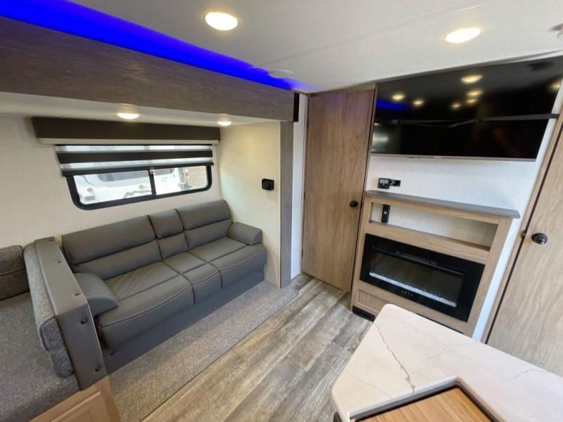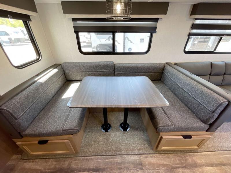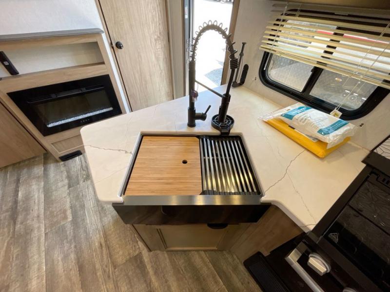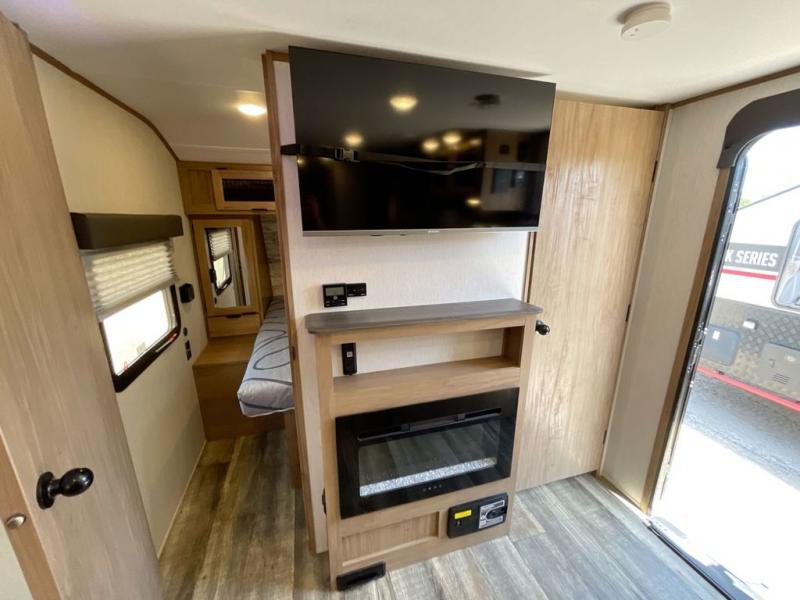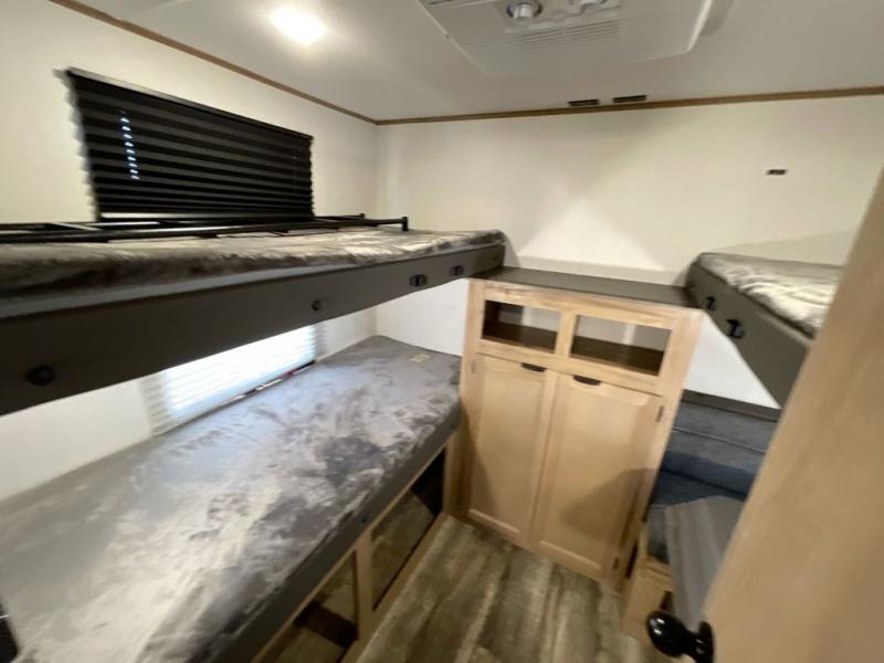 Looking for a spacious travel trailer to sleep nine or ten happy campers? You've found it in this Cherokee Alpha Wolf model with a handy outside kitchen, a bunkhouse with dinette, a front private bedroom, and a large slide out! The main living and kitchen area has a U-shaped dinette to utilize as a dining table, game table, work station, and/or an extra sleeping space. There is also a jackknife sofa for seating, TV watching, or sleeping. From any seating area you can easily view the entertainment center and fireplace which is centered in the unit with doors on either side to the front private bedroom. You will also find a nice pantry and full kitchen amenities including a farm-style sink, and residential refrigerator allowing you to easily create meals for your hungry crew. The exterior provides a 20' awning for an outdoor living area over the outside kitchen, and there is ample exterior storage for all of your camping gear like camp chairs, outside games, rugs, and more.