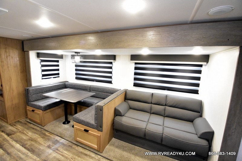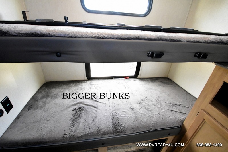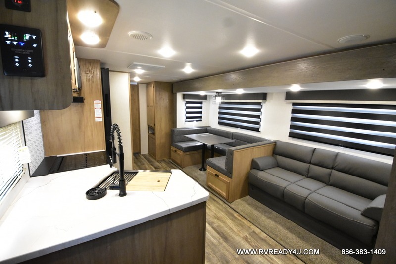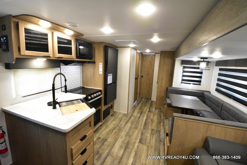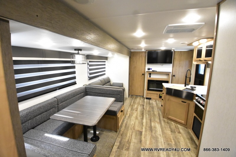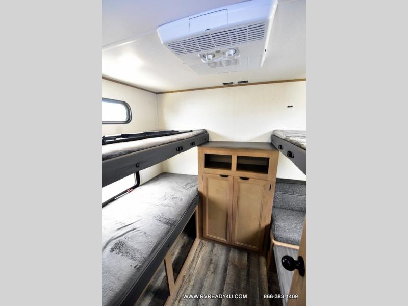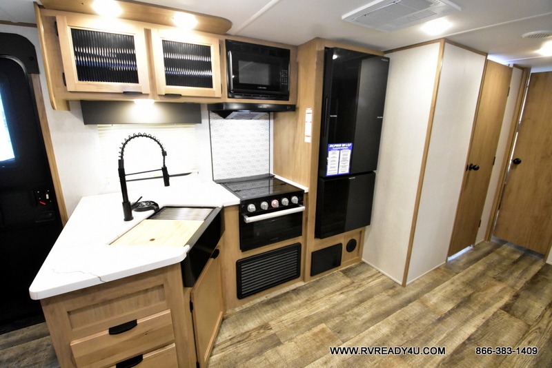 Looking for a spacious travel trailer to sleep nine or ten happy campers? You've found it in this Cherokee Alpha Wolf model with a handy outside kitchen, a bunkhouse with dinette, a front private bedroom, and a large slide out! The main living and kitchen area has a U-shaped dinette to utilize as a dining table, game table, work station, and/or an extra sleeping space. There is also a jackknife sofa for seating, TV watching, or sleeping. From any seating area you can easily view the entertainment center and fireplace which is centered in the unit with doors on either side to the front private bedroom. You will also find a nice pantry and full kitchen amenities including a farm-style sink, and residential refrigerator allowing you to easily create meals for your hungry crew. The exterior provides a 20' awning for an outdoor living area over the outside kitchen, and there is ample exterior storage for all of your camping gear like camp chairs, outside games, rugs, and more.