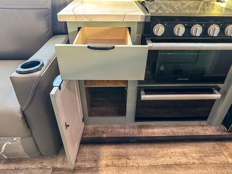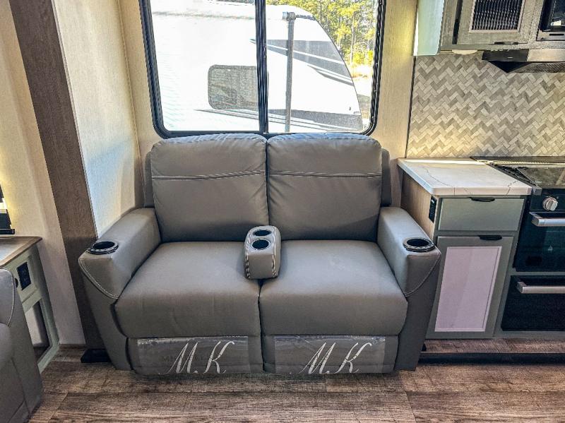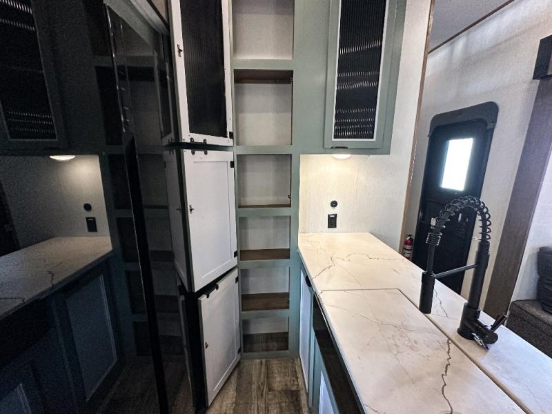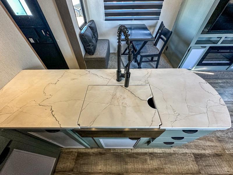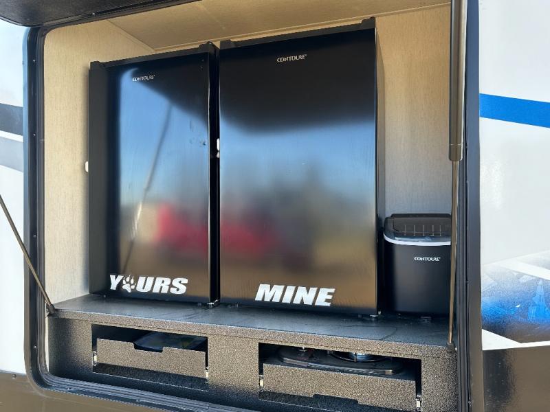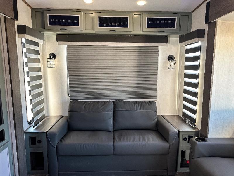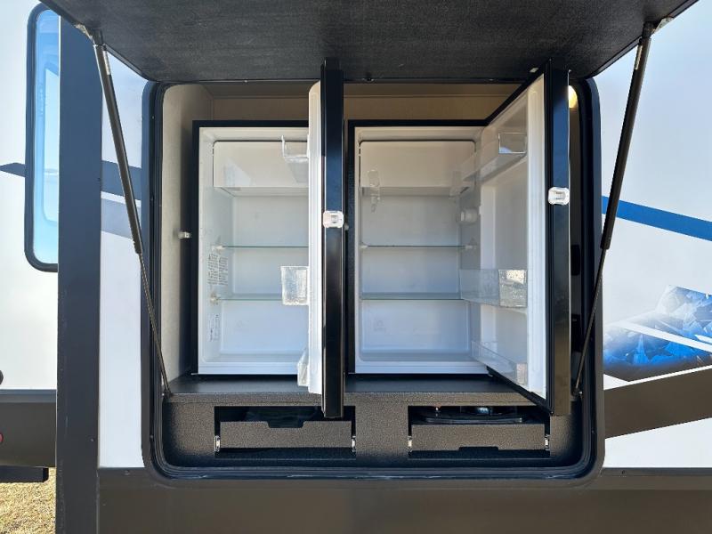 You have excellent sleeping accommodations on this Cherokee Arctic Wolf Suite fifth wheel! There is a private bedroom with a king-size bed at the front for you, and the second bedroom contains a 28" x 72" bunk and tri-fold sofa for any kids or friends you have traveling with you. But it doesn't stop there. There is also a loft above the bunk room and a tri-fold sofa in the living area that you can use as a sleeping space. The kitchen is ready for you to make meals on the three-burner range, and you can work freely around the peninsula countertop. You'll also love the outside kitchen, complete with two refrigerators! The ceiling fan will cool this area down if it gets too hot while you're cooking, and you can eat your meals at the free-standing table with chairs and a storage ottoman seat.