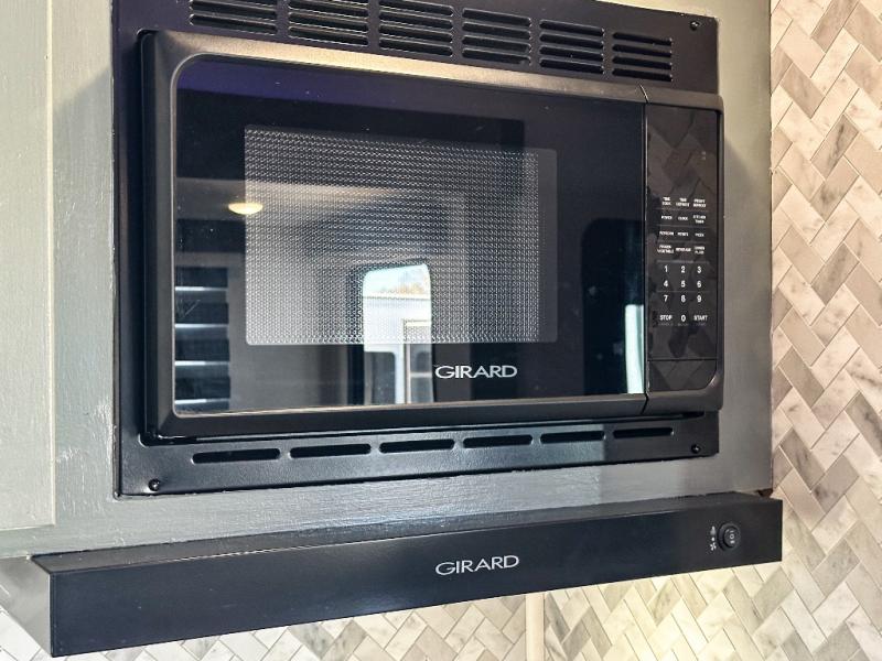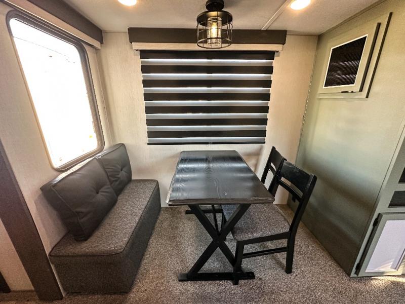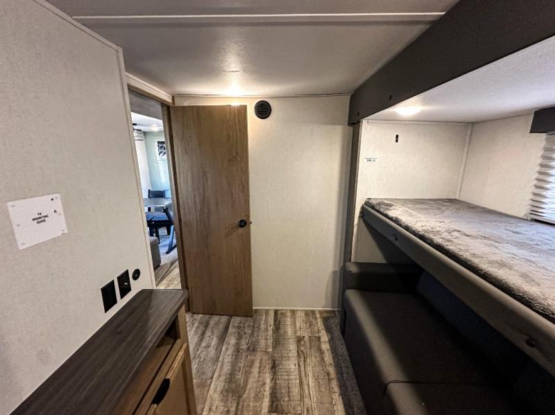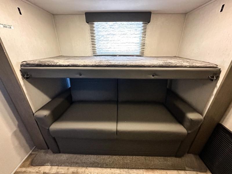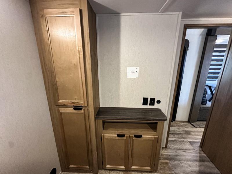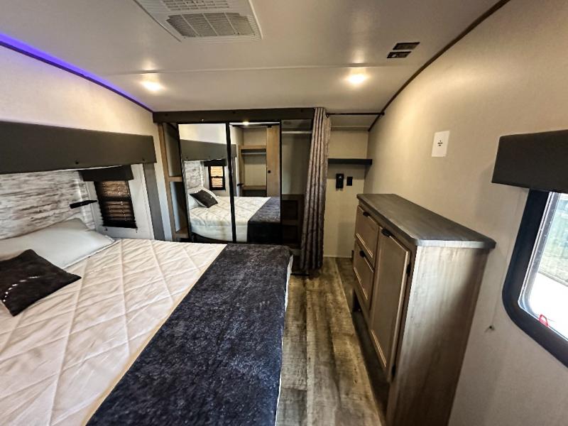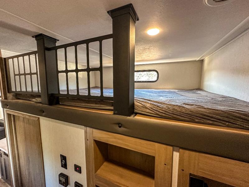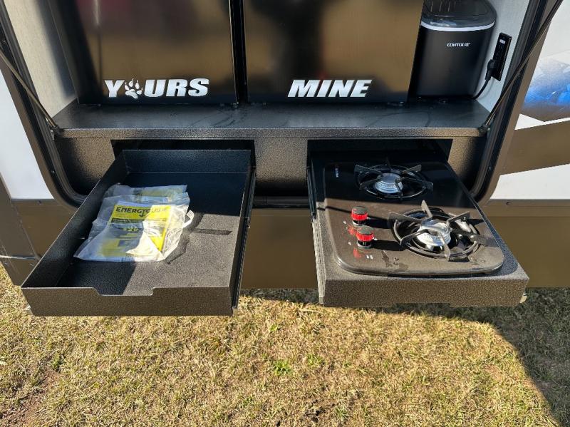 You have excellent sleeping accommodations on this Cherokee Arctic Wolf Suite fifth wheel! There is a private bedroom with a king-size bed at the front for you, and the second bedroom contains a 28" x 72" bunk and tri-fold sofa for any kids or friends you have traveling with you. But it doesn't stop there. There is also a loft above the bunk room and a tri-fold sofa in the living area that you can use as a sleeping space. The kitchen is ready for you to make meals on the three-burner range, and you can work freely around the peninsula countertop. You'll also love the outside kitchen, complete with two refrigerators! The ceiling fan will cool this area down if it gets too hot while you're cooking, and you can eat your meals at the free-standing table with chairs and a storage ottoman seat.