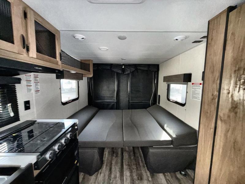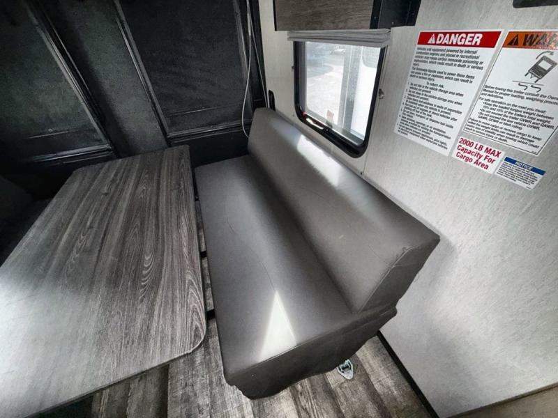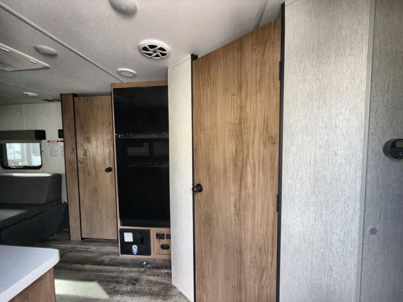 You will love this Cherokee Grey Wolf toy hauler with a rear ramp door for loading and unloading your toys and gear. If you position the fold-down sofas up against the wall, you will have even more room for extra gear when you are moving down the road. Set up camp and easily create a great dining area with the table between each fold-down sofa. You can also create your best meals in a breeze with the airy fryer or cooktop. A large pantry allows you to pack all of the snacks and canned goods you need for your adventure. You will appreciate the master suite up front for a great night's rest on the queen bed along with easy access into the dual-entry bath.
