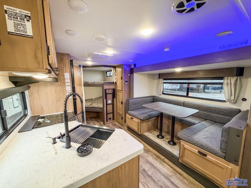 You will love the space provided in this dual entry Cherokee Grey Wolf travel trailer that has double-size bunks! The rear entry door leads right into the full bath allowing easy access from outside when you need to use the bathroom while you're enjoying the great outdoors. The large U-shaped dinette slide will not only seat everyone comfortably for a meal or a game, but since it also slides out, it opens up the interior even more to give you plenty of space for foot traffic. For all of your outdoor gear, you will find the outside storage compartments handy for stowing away your things when not in use. While the kids enjoy their bunk beds, you will enjoy a good night's rest in your queen bed with wardrobes on either side up in the front private bedroom!