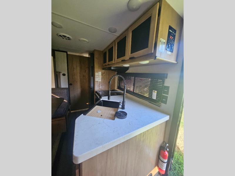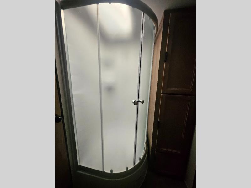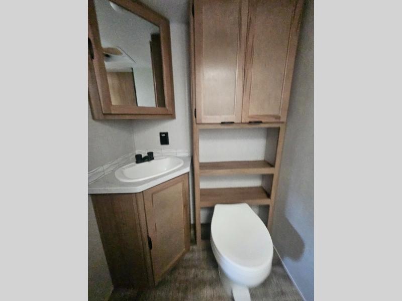 This Cherokee Grey Wolf travel trailer is perfect for your small family and will leave you planning your next outing before you are back from your current weekend away! You will find all of the comforts you need with plenty of livable space including a U-shaped dinette slide. There is also a sofa for more seating when company arrives, and there are end tables on either side to prevent spills. A spacious walk-through bath leads to a front private bedroom where you will enjoy a great night's rest on a comfortable queen-size bed. You will find ample storage for clothing in the wardrobes that are above handy nightstands for your personal things. There are even lights mounted above the bed on each side which makes it easy to read a couple of chapters before drifting off to sleep.