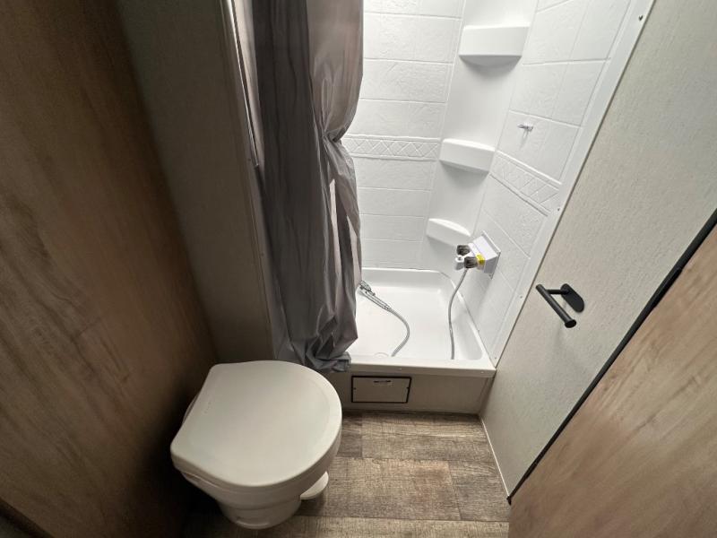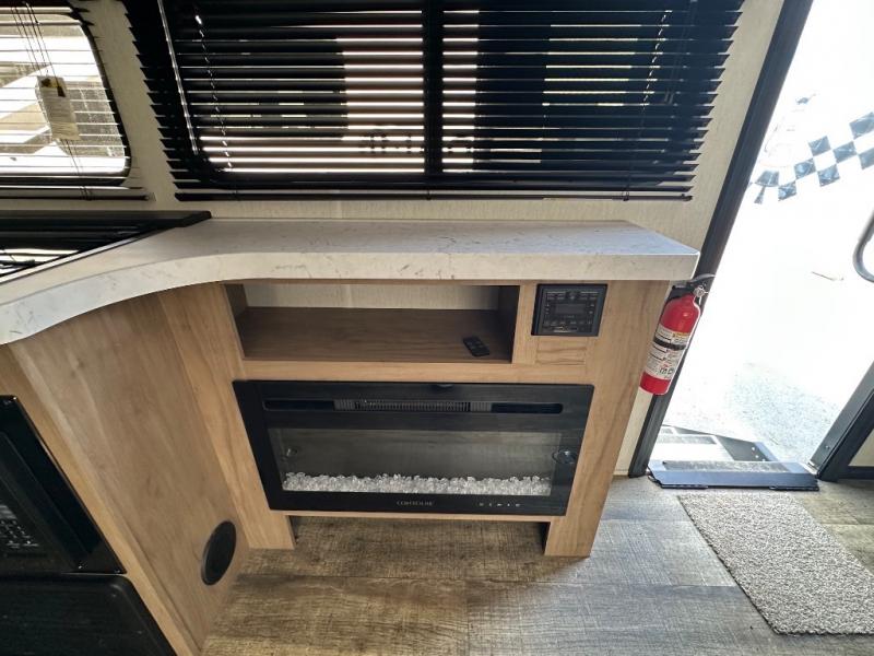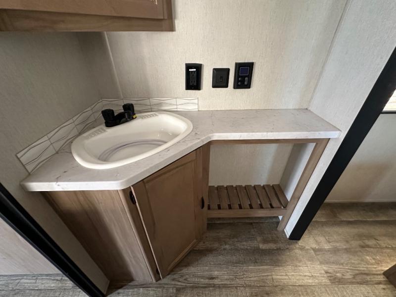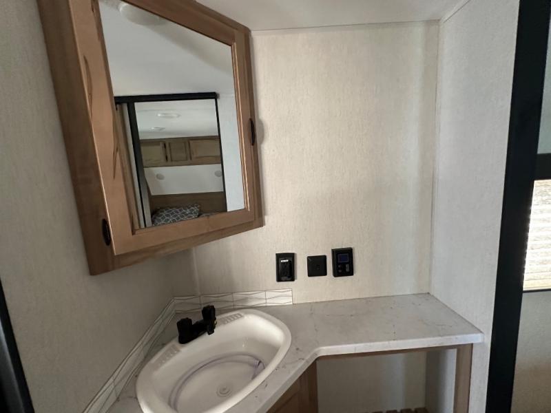 This dual entry toy hauler will allow you to enter in through the main living area or the front master bedroom for convenience! There is a walk-through bath that will be easily accessible for everyone, and there is plenty of storage space for personal belongings. Head to the full kitchen to prepare a home cooked meal, or head outdoors to enjoy the mini kitchen. There is also an outside TV mount if you brought a TV along, and a 15' power awning to provide shade. You can easily unload your toys using the ramp door, then relax on the fold-down sofas with a dinette.
