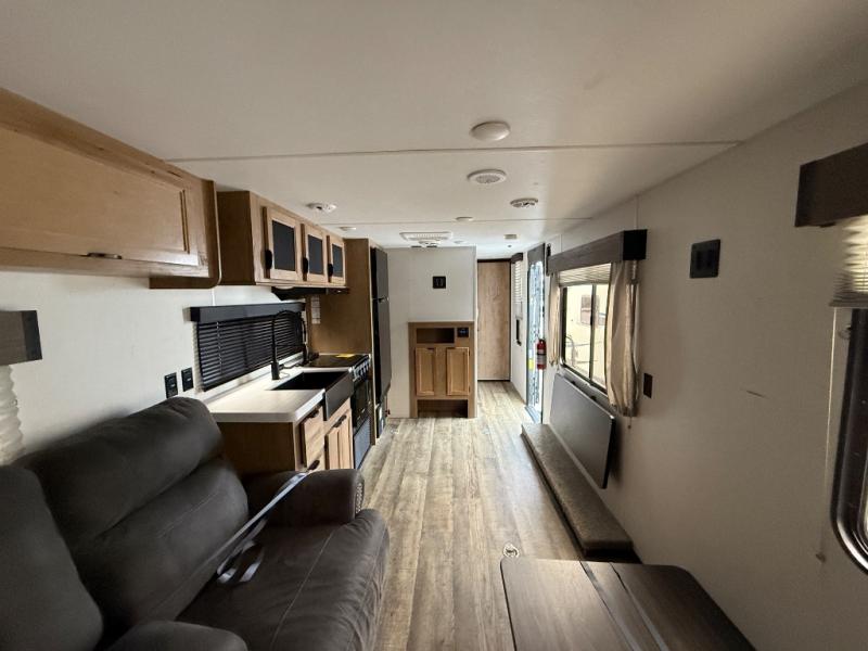 Take this Cherokee Grey Wolf toy hauler out to the campground of your choice for loads of outdoor fun! Create delicious dinners with the fabulous features found in the kitchen, like air fryer and residential farm-style stainless steel sink. For a comfortable night of rest, head to the front master suite where you will find a queen-size bed, dual wardrobes, and a TV mount. You will even be able to host any neighbors that drop by with the fold-down sofas and dinette table.