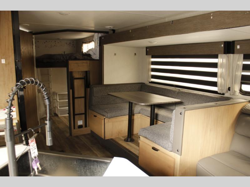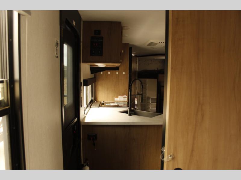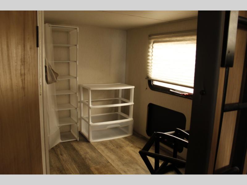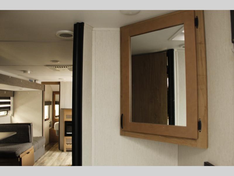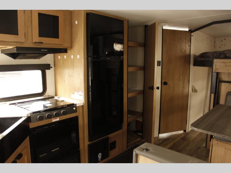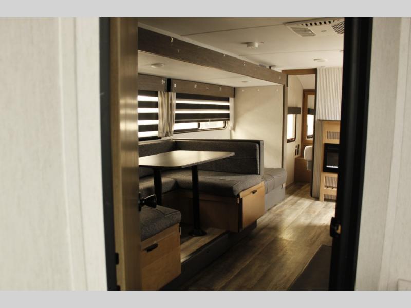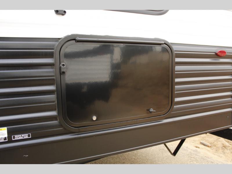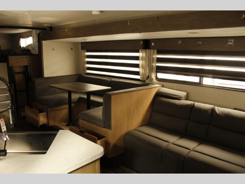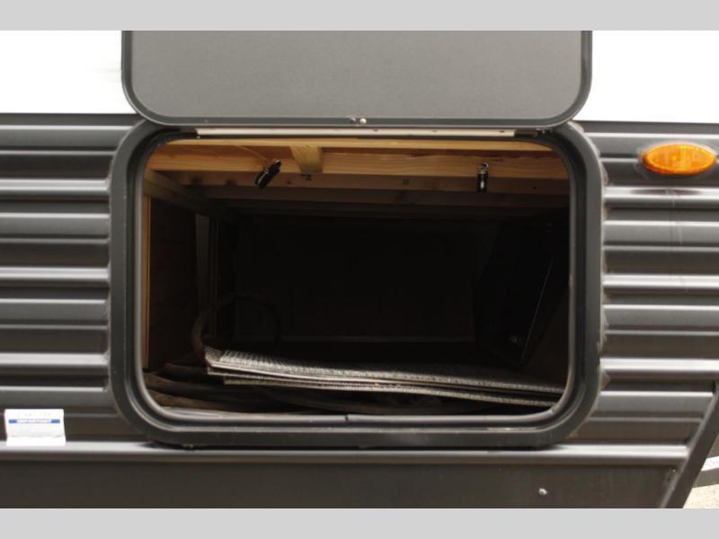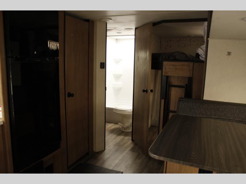 Come on inside this Cherokee Grey Wolf travel trailer and experience the convenience of a smooth flow of traffic in and out with two entry doors. The rear door leads into a full bath which is great for accessibility when outside and when you need to use the bathroom. Once inside, you will notice the large U-shaped dinette and the sofa which sit on the slide and create a spacious footprint for moving about, as well as great places to play games and socialize with your friends and family. A walk-in pantry provides plenty of storage allowing you to stock up on your favorite snacks and dry goods for your family adventure. At night, there is sleeping space for everyone between the double-size bunks and the queen-size bed, plus the furniture.