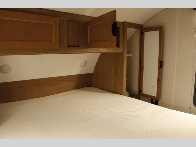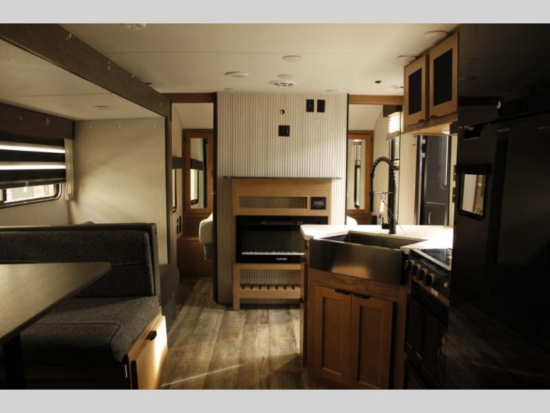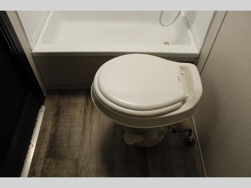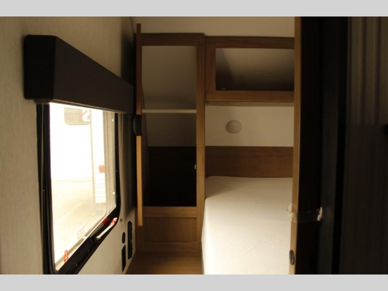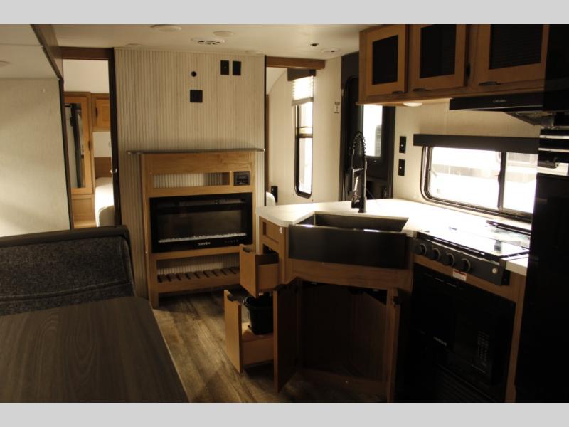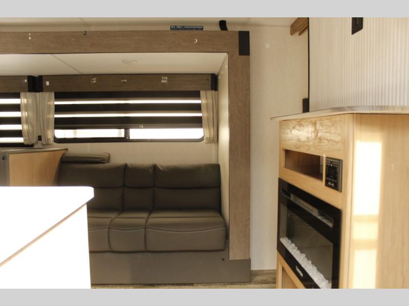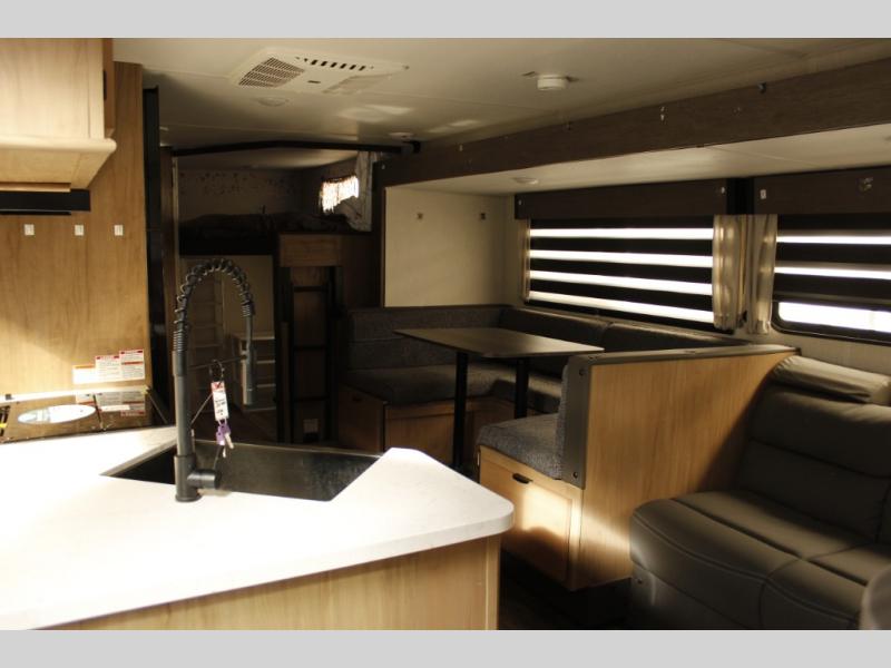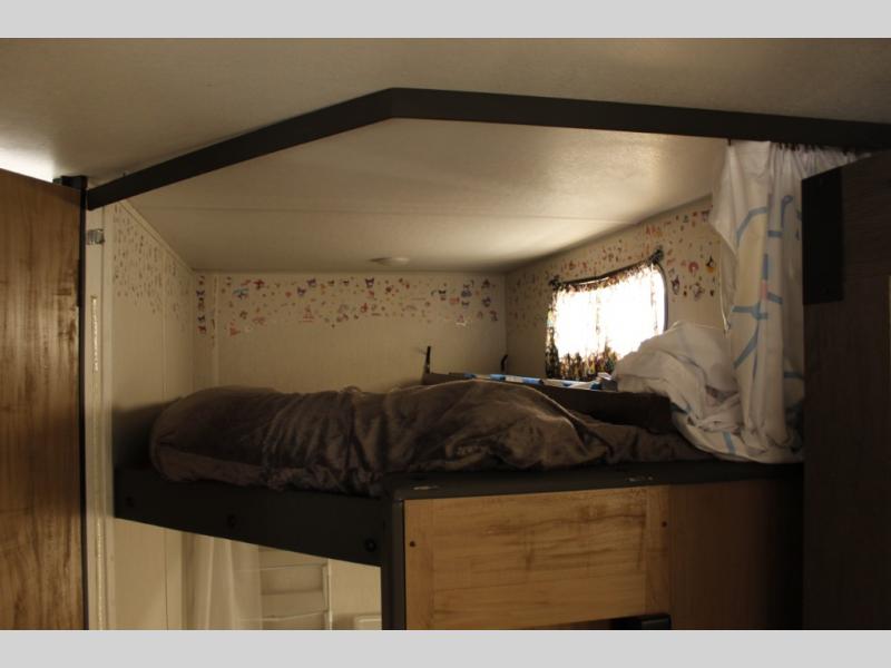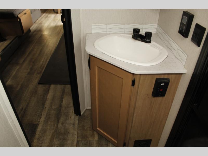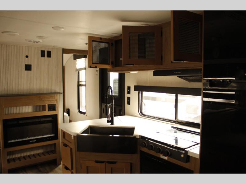 Come on inside this Cherokee Grey Wolf travel trailer and experience the convenience of a smooth flow of traffic in and out with two entry doors. The rear door leads into a full bath which is great for accessibility when outside and when you need to use the bathroom. Once inside, you will notice the large U-shaped dinette and the sofa which sit on the slide and create a spacious footprint for moving about, as well as great places to play games and socialize with your friends and family. A walk-in pantry provides plenty of storage allowing you to stock up on your favorite snacks and dry goods for your family adventure. At night, there is sleeping space for everyone between the double-size bunks and the queen-size bed, plus the furniture.