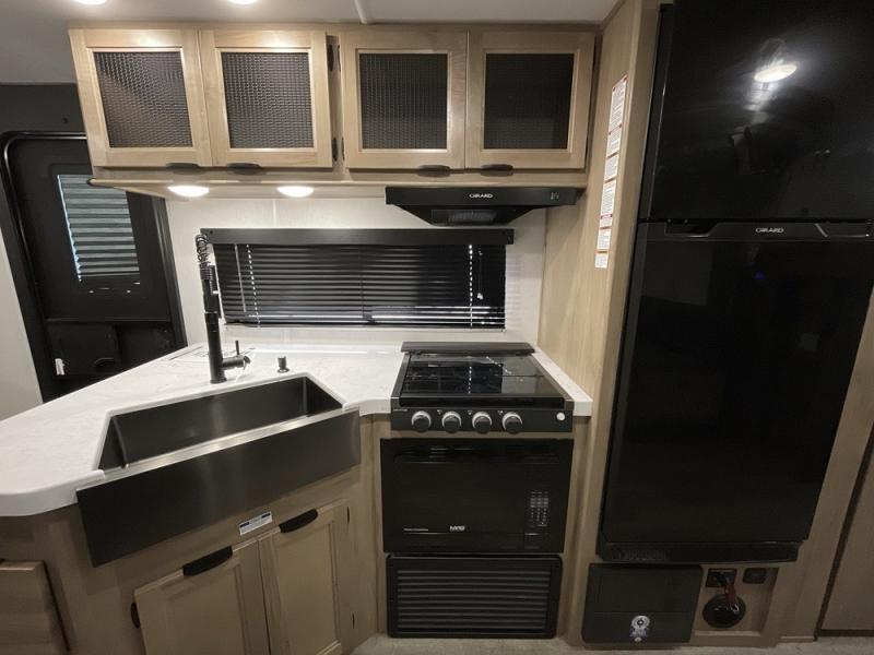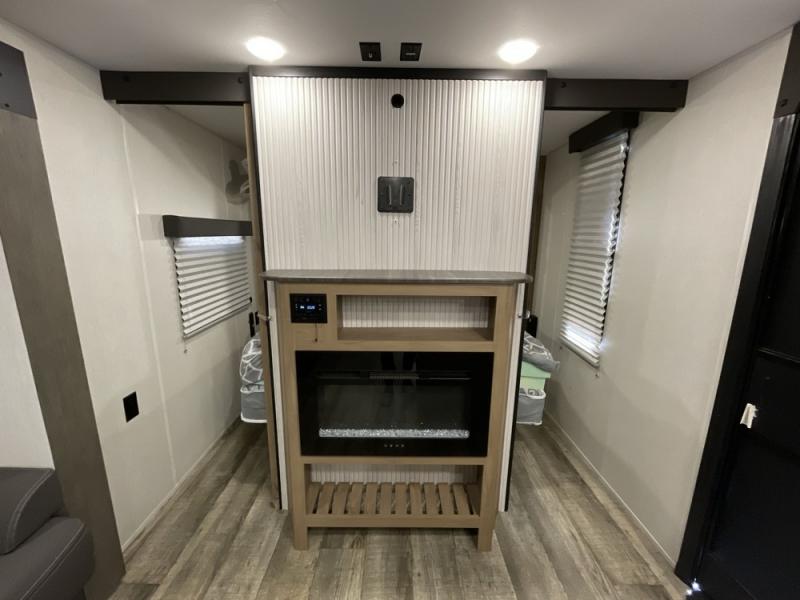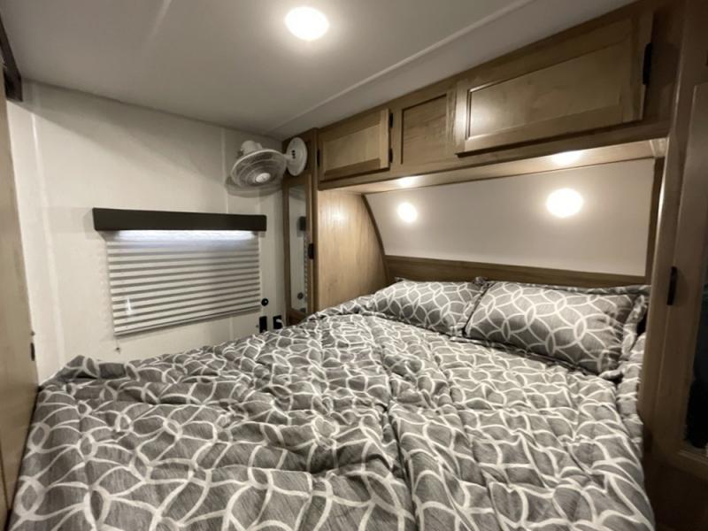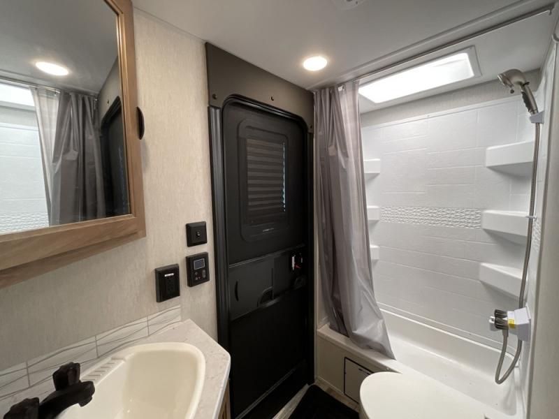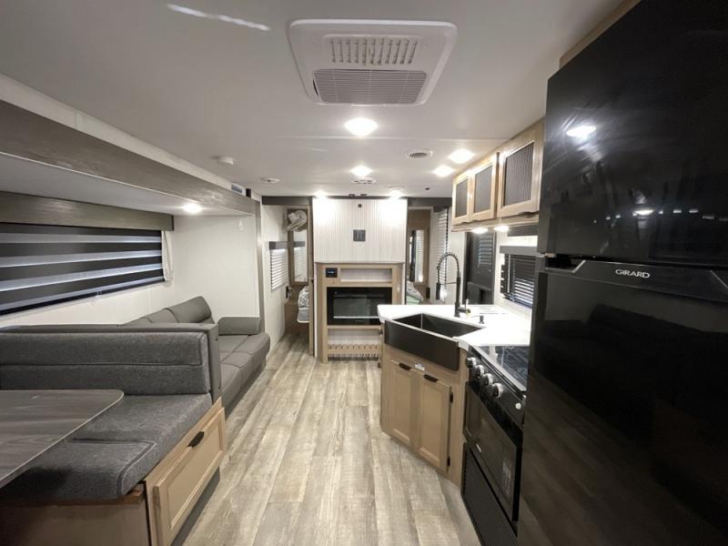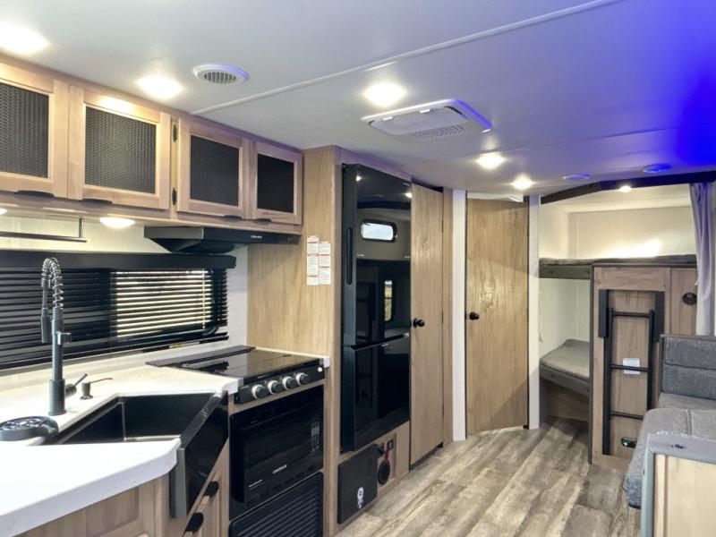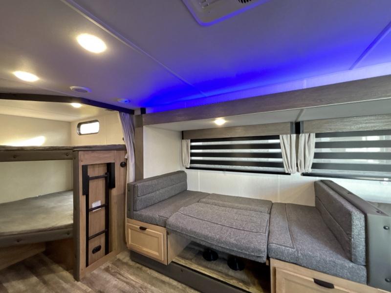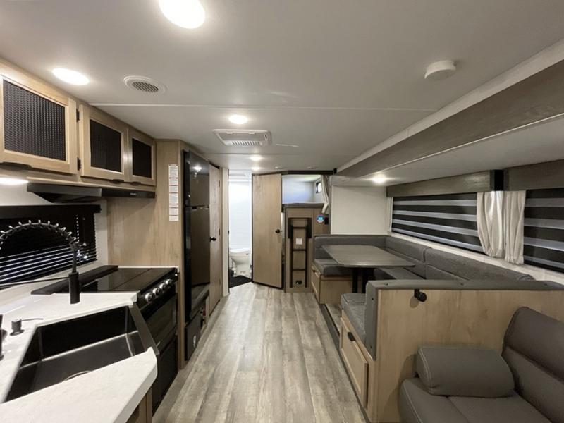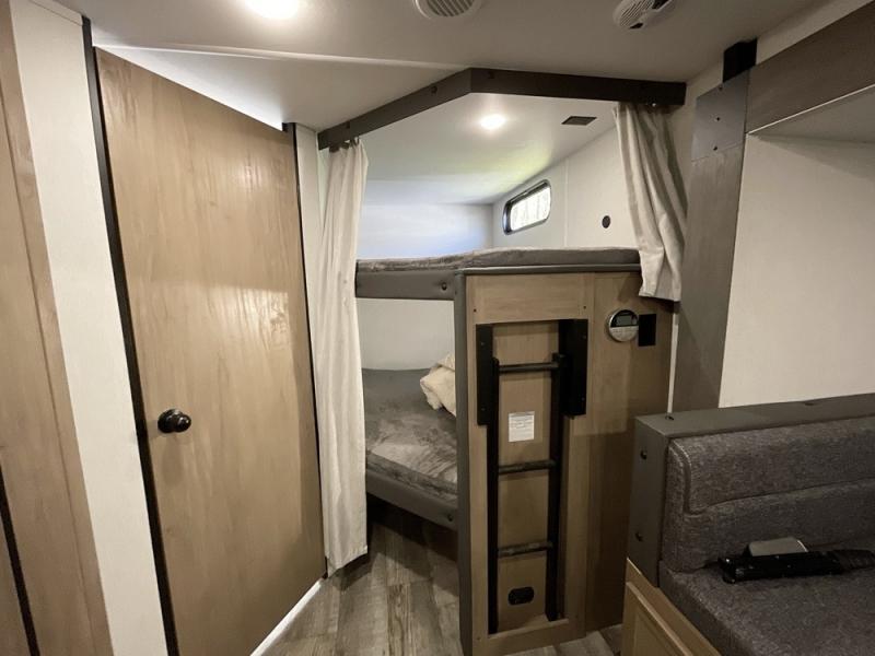 Come on inside this Cherokee Grey Wolf travel trailer and experience the convenience of a smooth flow of traffic in and out with two entry doors. The rear door leads into a full bath which is great for accessibility when outside and when you need to use the bathroom. Once inside, you will notice the large U-shaped dinette and the sofa which sit on the slide and create a spacious footprint for moving about, as well as great places to play games and socialize with your friends and family. A walk-in pantry provides plenty of storage allowing you to stock up on your favorite snacks and dry goods for your family adventure. At night, there is sleeping space for everyone between the double-size bunks and the queen-size bed, plus the furniture.