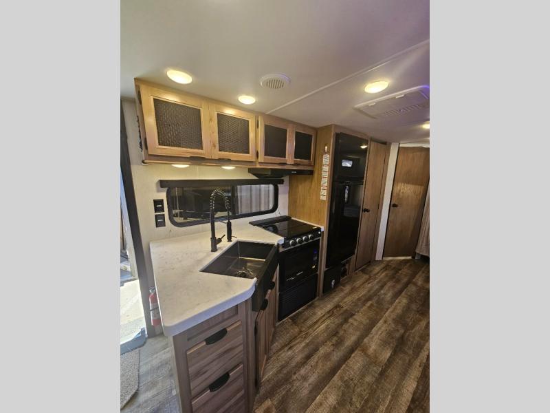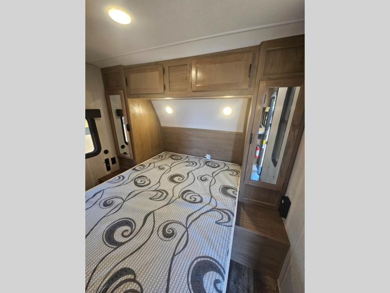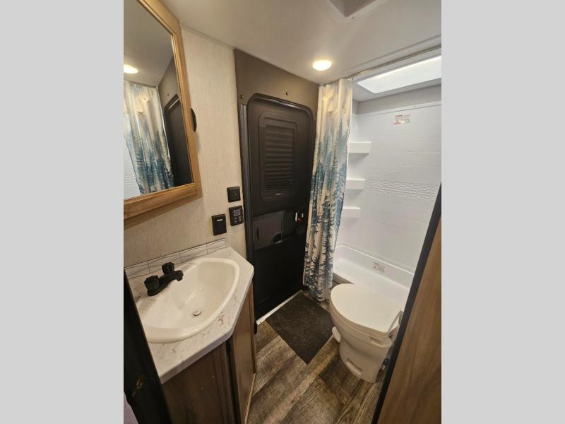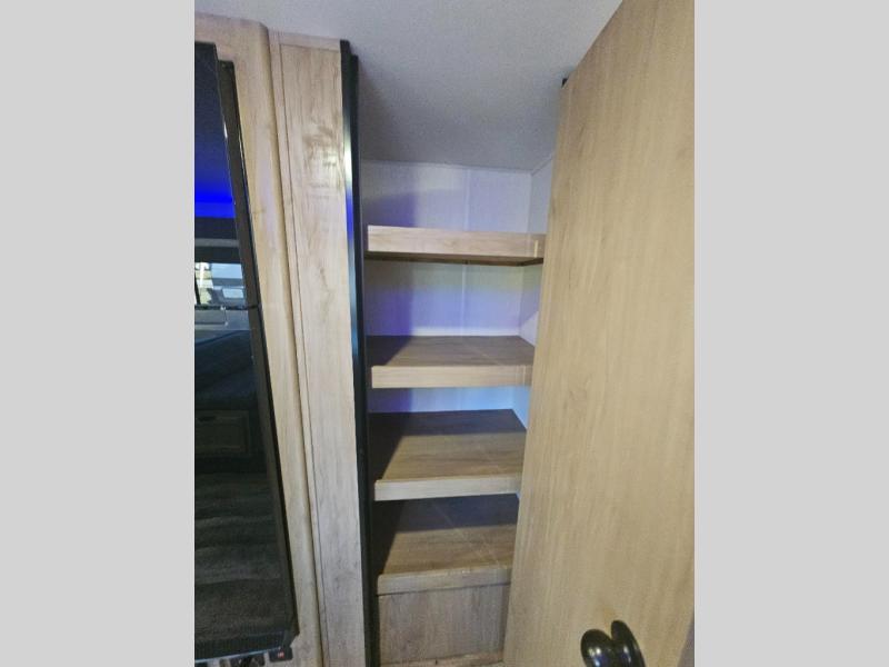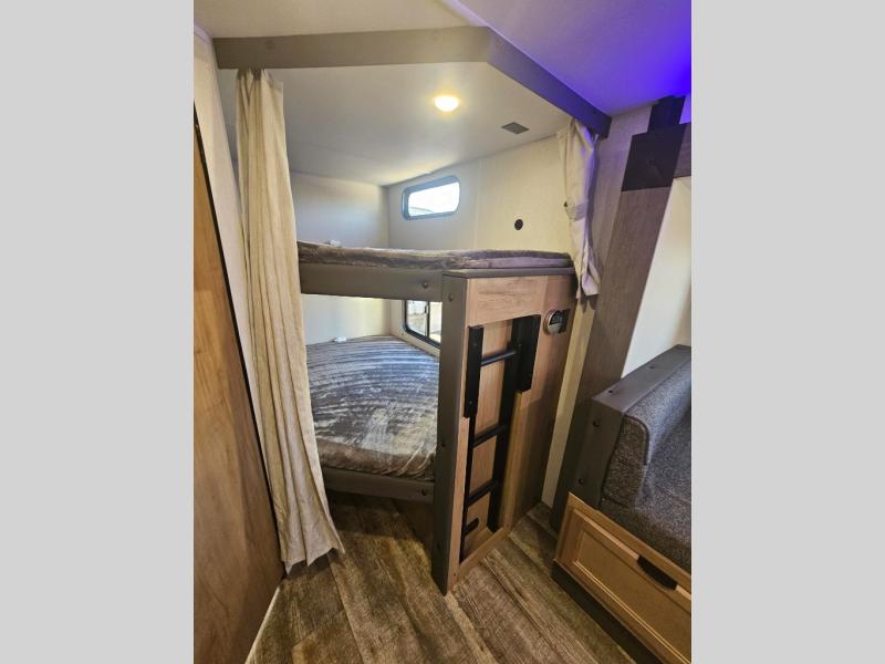 Come on inside this Cherokee Grey Wolf travel trailer and experience the convenience of a smooth flow of traffic in and out with two entry doors. The rear door leads into a full bath which is great for accessibility when outside and when you need to use the bathroom. Once inside, you will notice the large U-shaped dinette and the sofa which sit on the slide and create a spacious footprint for moving about, as well as great places to play games and socialize with your friends and family. A walk-in pantry provides plenty of storage allowing you to stock up on your favorite snacks and dry goods for your family adventure. At night, there is sleeping space for everyone between the double-size bunks and the queen-size bed, plus the furniture.