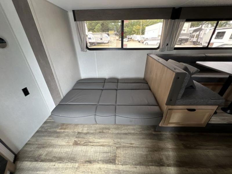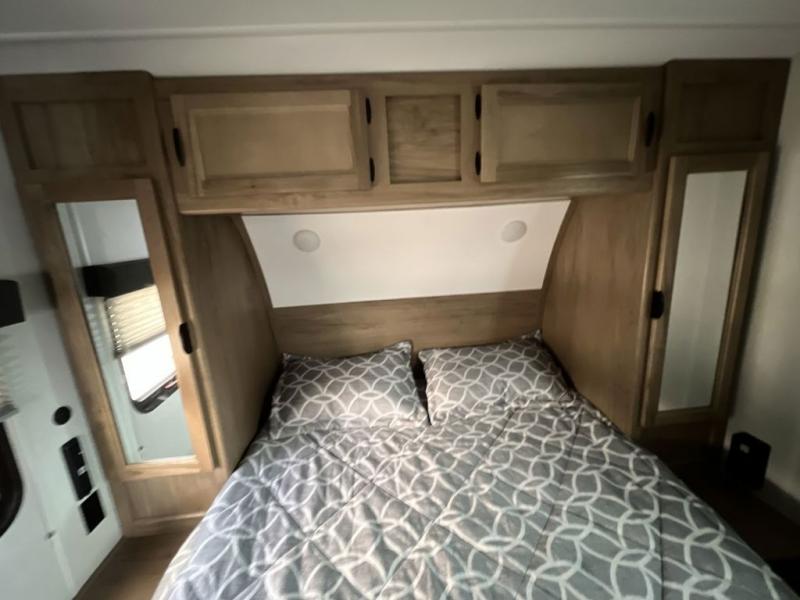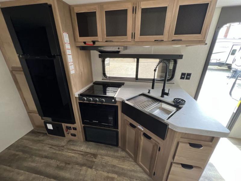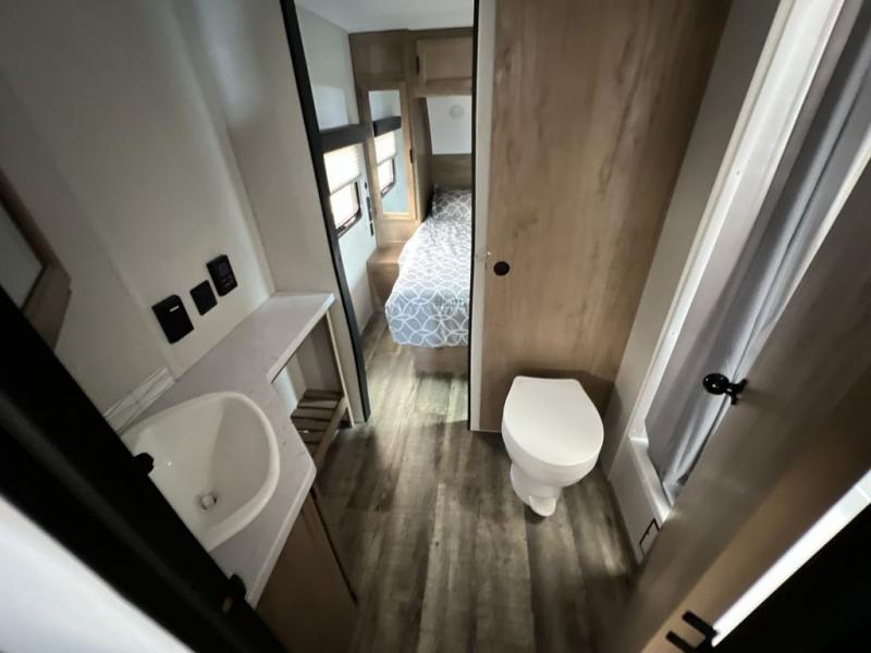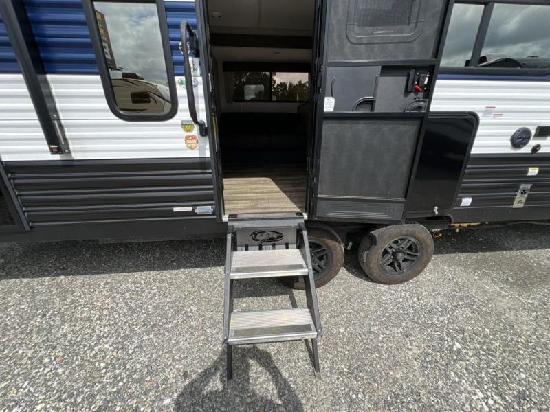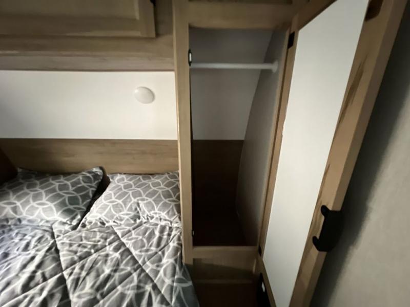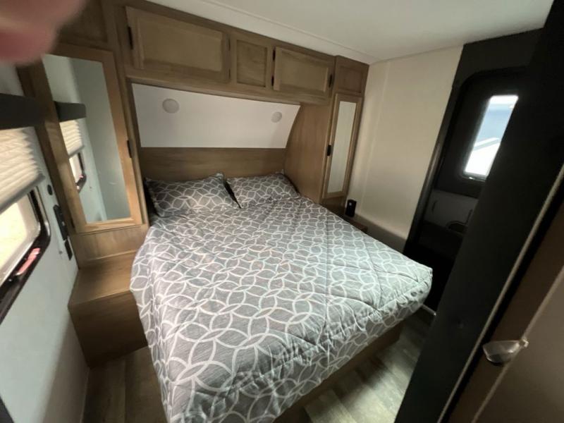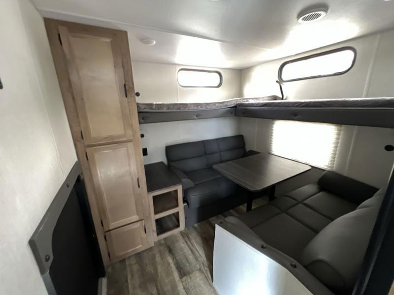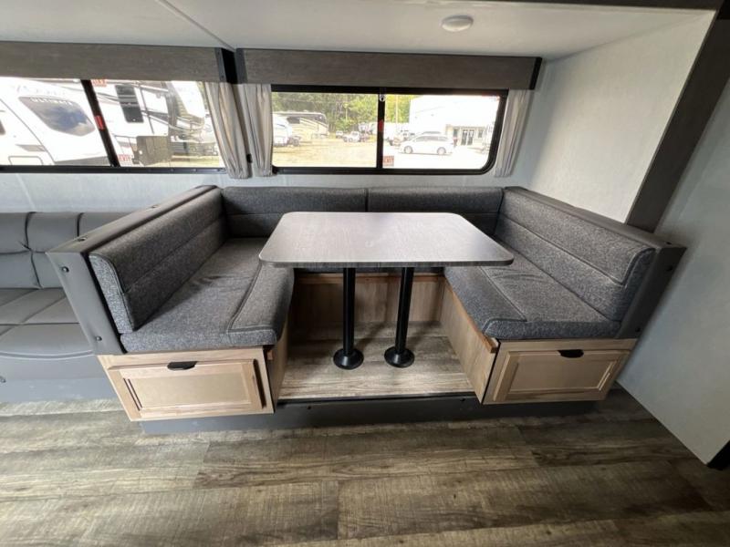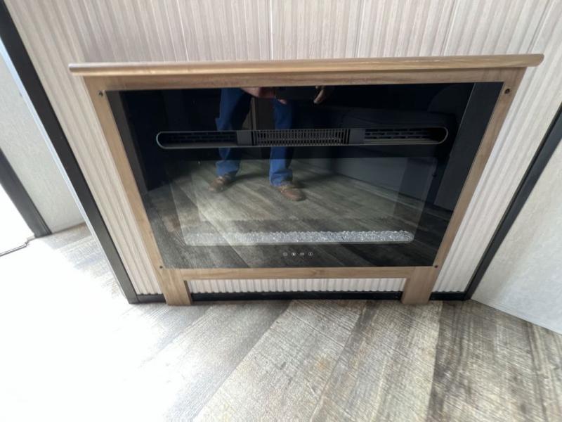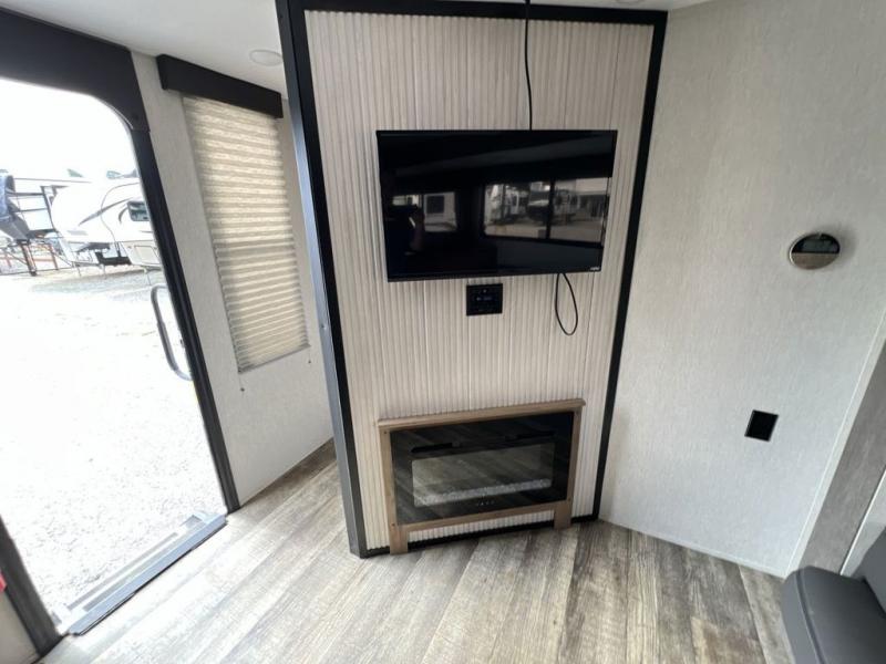 You will love how easy it is to enter/exit this travel trailer with dual entry doors! The rear door leads into the living/kitchen area where you will notice the large U-shaped dinette and the sofa which sit on the slide and create a spacious footprint for moving about, as well as great places to play games and socialize with your friends and family. Plus, there is an entertainment center with a fireplace and a fully equipped kitchen to keep everyone's bellies filled with delicious home cooked meals. At night, there is sleeping space for everyone between the bunks above the sofas with a table in the rear private bunkhouse and the queen-size bed in the front private bedroom, plus the furniture can convert into sleeping spaces. The walk-through bathroom leads directly into the bedroom too!