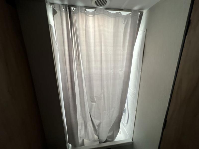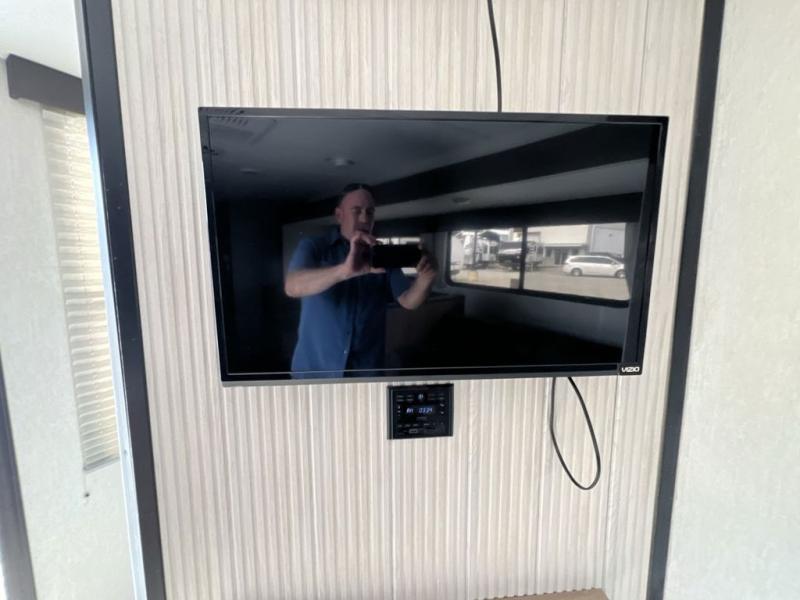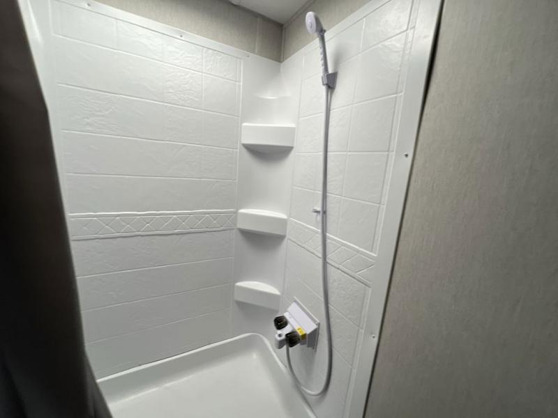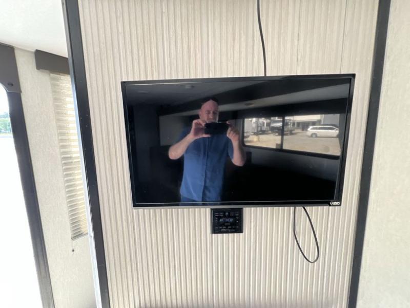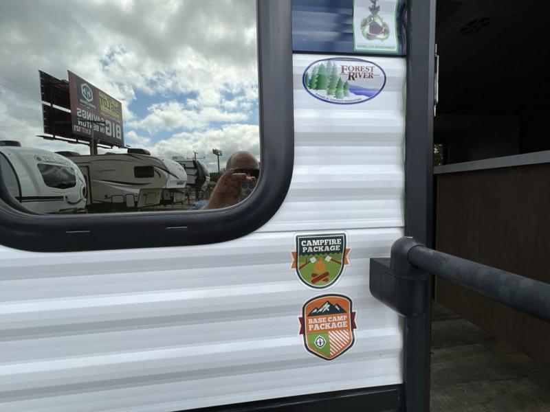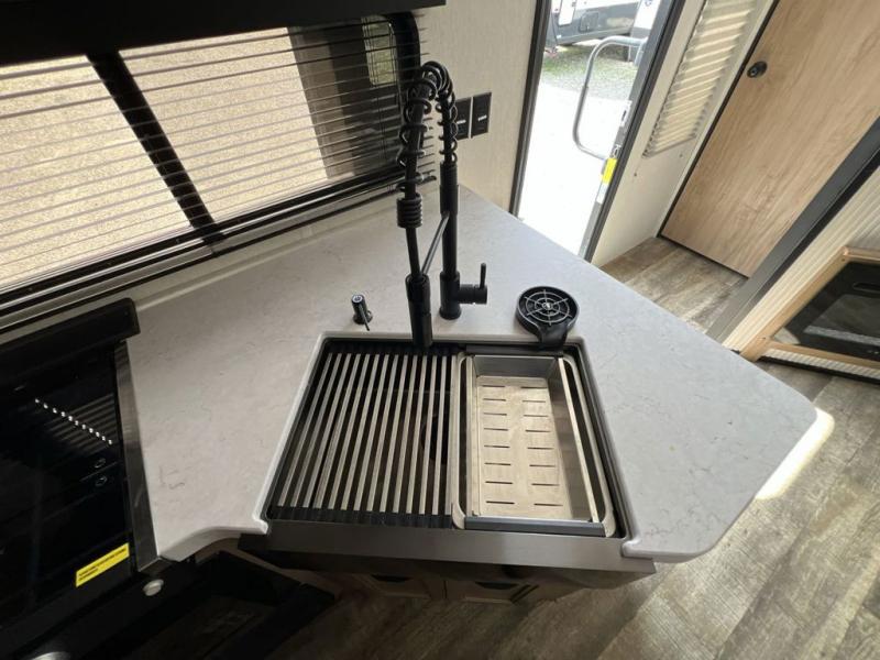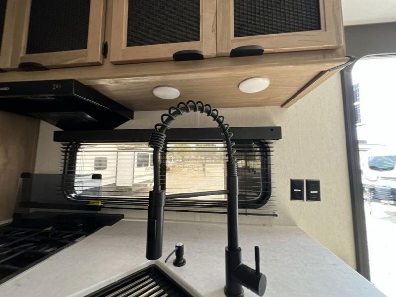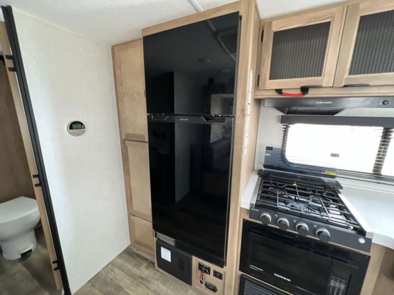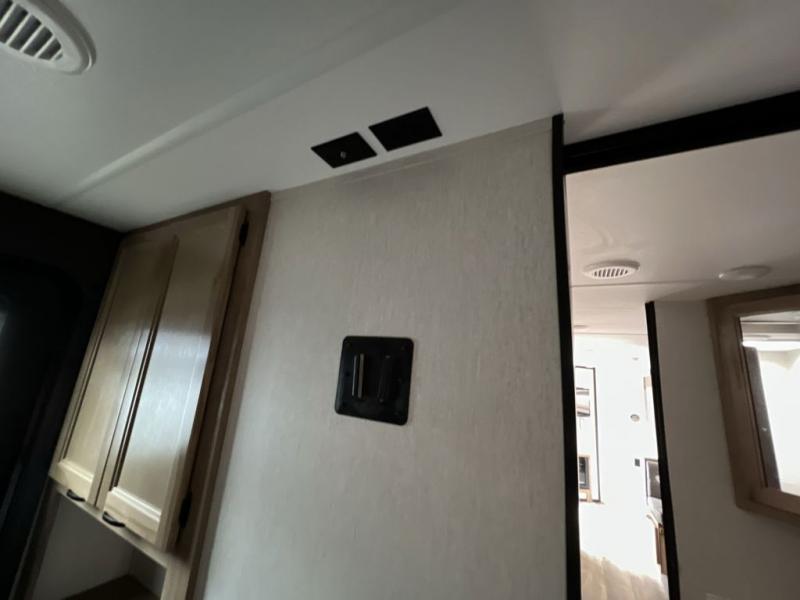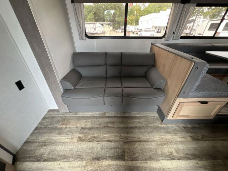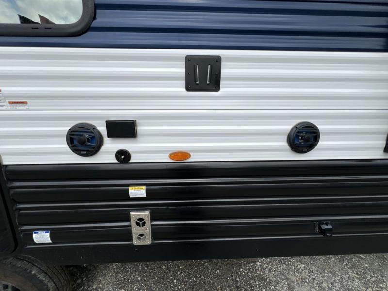 You will love how easy it is to enter/exit this travel trailer with dual entry doors! The rear door leads into the living/kitchen area where you will notice the large U-shaped dinette and the sofa which sit on the slide and create a spacious footprint for moving about, as well as great places to play games and socialize with your friends and family. Plus, there is an entertainment center with a fireplace and a fully equipped kitchen to keep everyone's bellies filled with delicious home cooked meals. At night, there is sleeping space for everyone between the bunks above the sofas with a table in the rear private bunkhouse and the queen-size bed in the front private bedroom, plus the furniture can convert into sleeping spaces. The walk-through bathroom leads directly into the bedroom too!