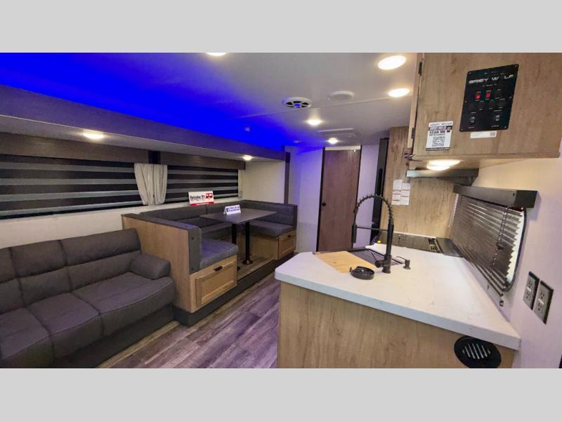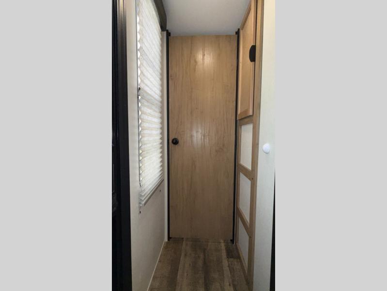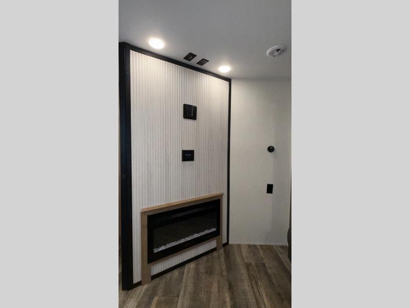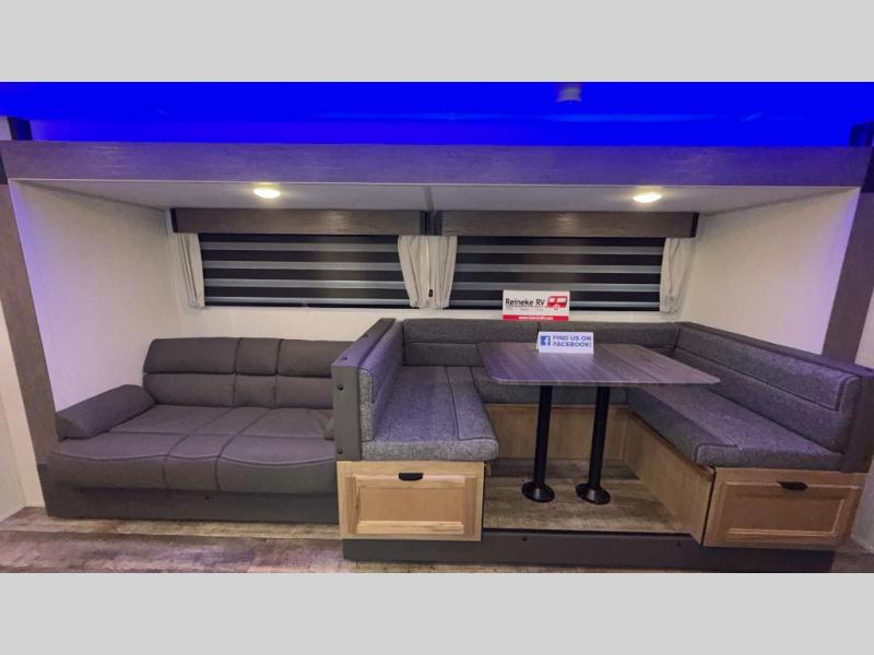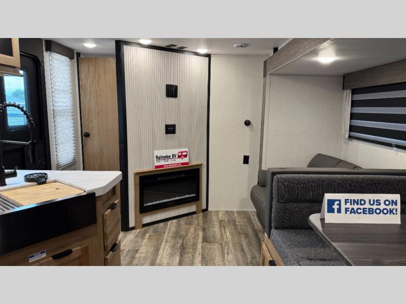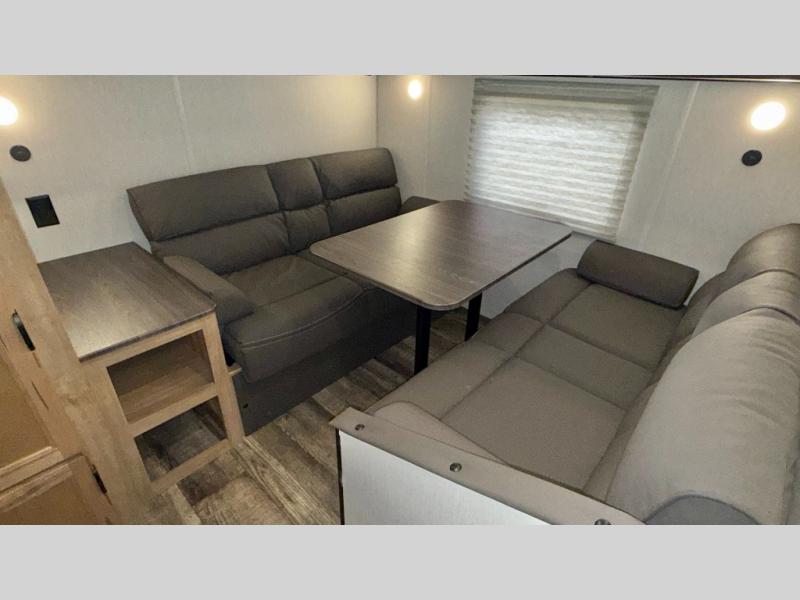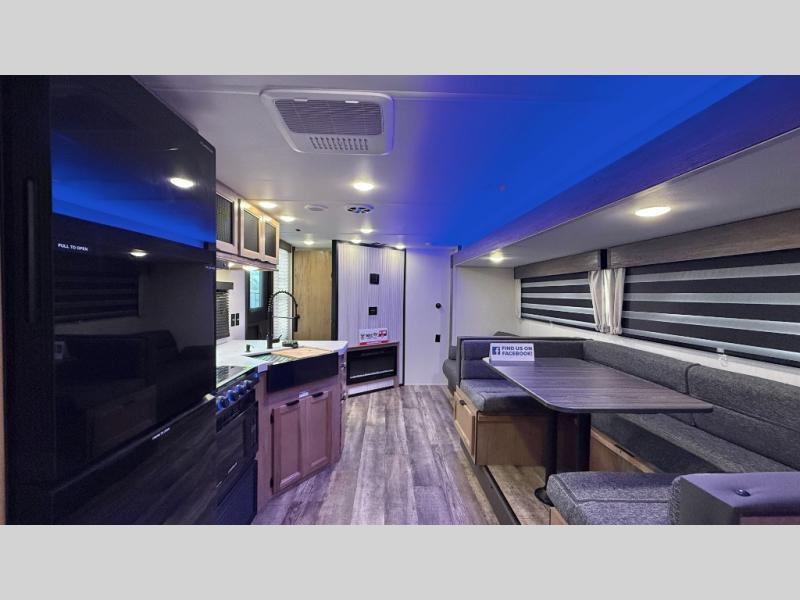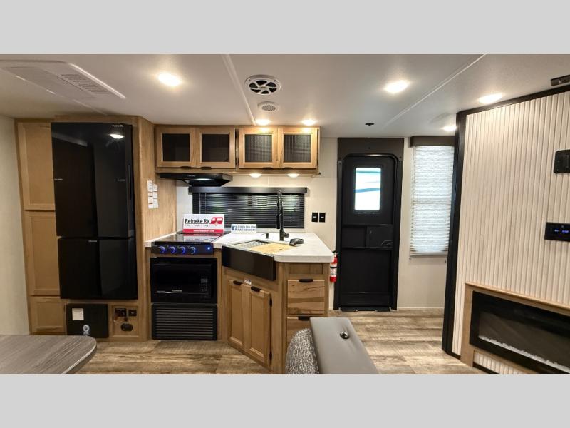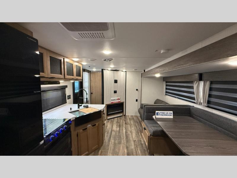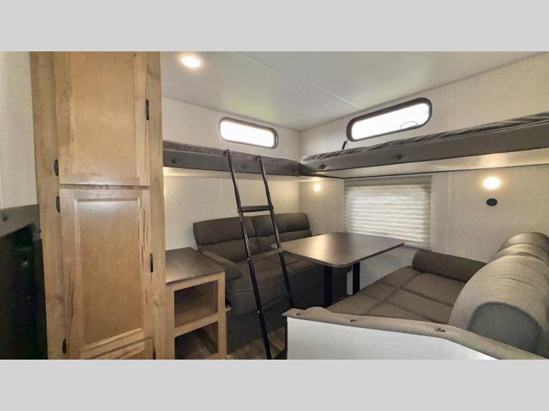 You will love how easy it is to enter/exit this travel trailer with dual entry doors! The rear door leads into the living/kitchen area where you will notice the large U-shaped dinette and the sofa which sit on the slide and create a spacious footprint for moving about, as well as great places to play games and socialize with your friends and family. Plus, there is an entertainment center with a fireplace and a fully equipped kitchen to keep everyone's bellies filled with delicious home cooked meals. At night, there is sleeping space for everyone between the bunks above the sofas with a table in the rear private bunkhouse and the queen-size bed in the front private bedroom, plus the furniture can convert into sleeping spaces. The walk-through bathroom leads directly into the bedroom too!