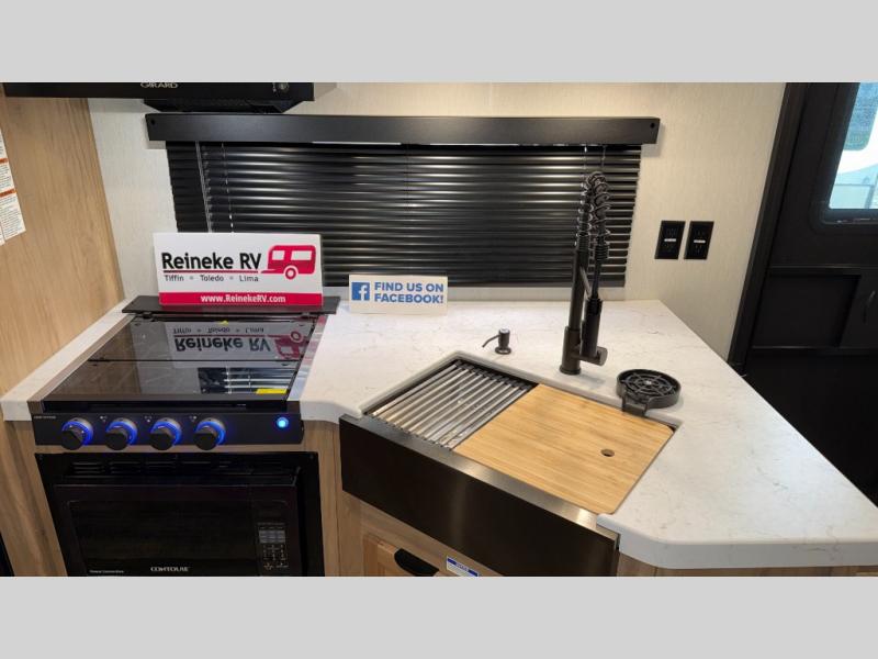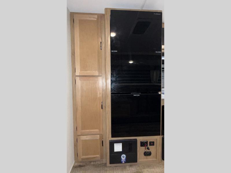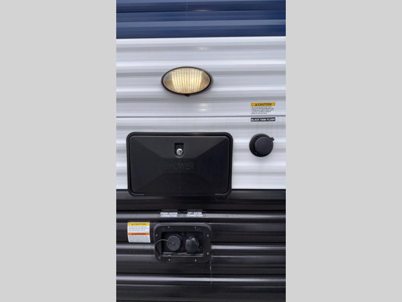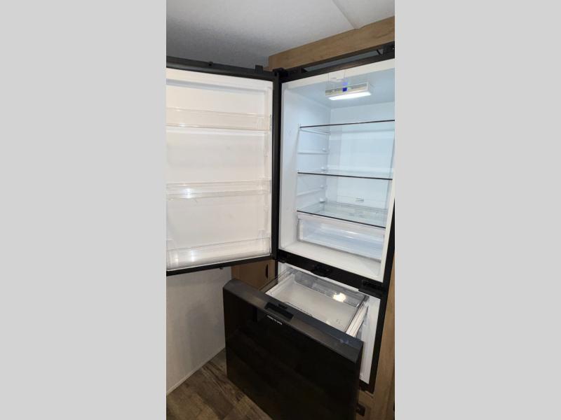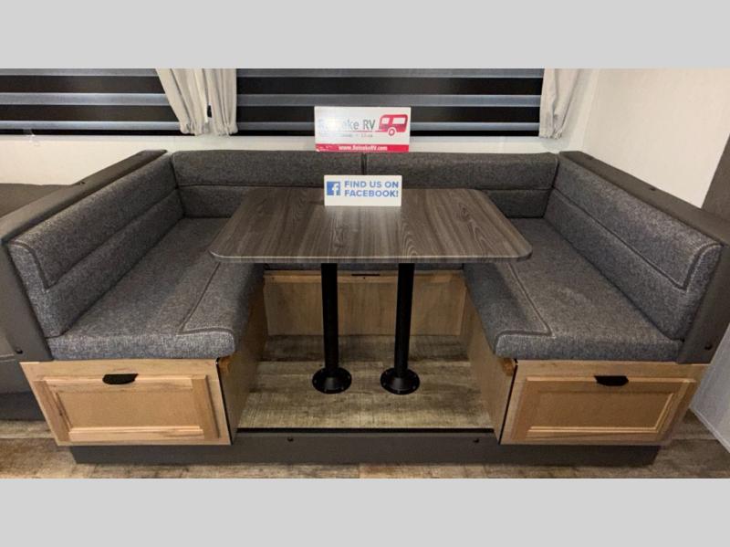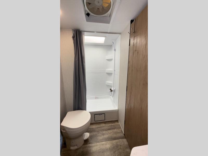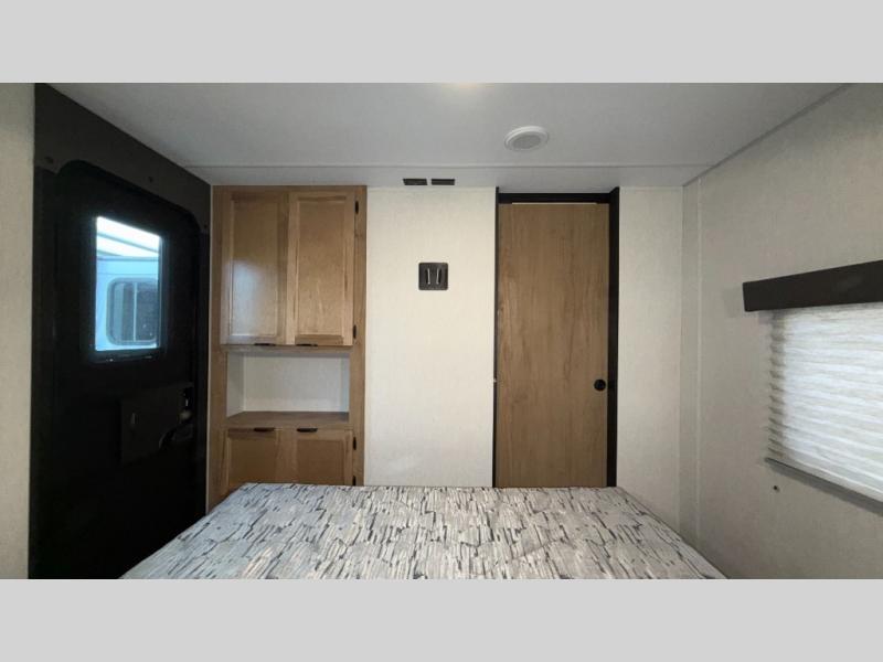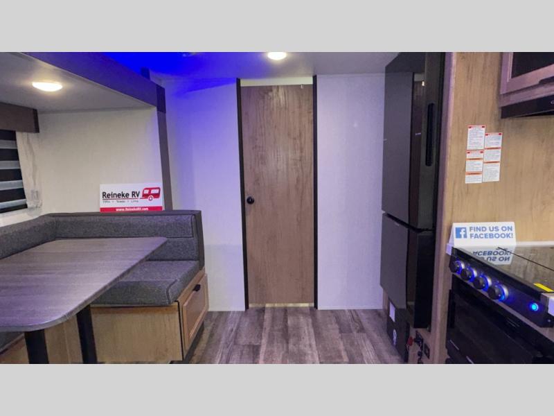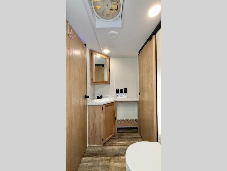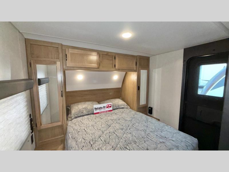 You will love how easy it is to enter/exit this travel trailer with dual entry doors! The rear door leads into the living/kitchen area where you will notice the large U-shaped dinette and the sofa which sit on the slide and create a spacious footprint for moving about, as well as great places to play games and socialize with your friends and family. Plus, there is an entertainment center with a fireplace and a fully equipped kitchen to keep everyone's bellies filled with delicious home cooked meals. At night, there is sleeping space for everyone between the bunks above the sofas with a table in the rear private bunkhouse and the queen-size bed in the front private bedroom, plus the furniture can convert into sleeping spaces. The walk-through bathroom leads directly into the bedroom too!