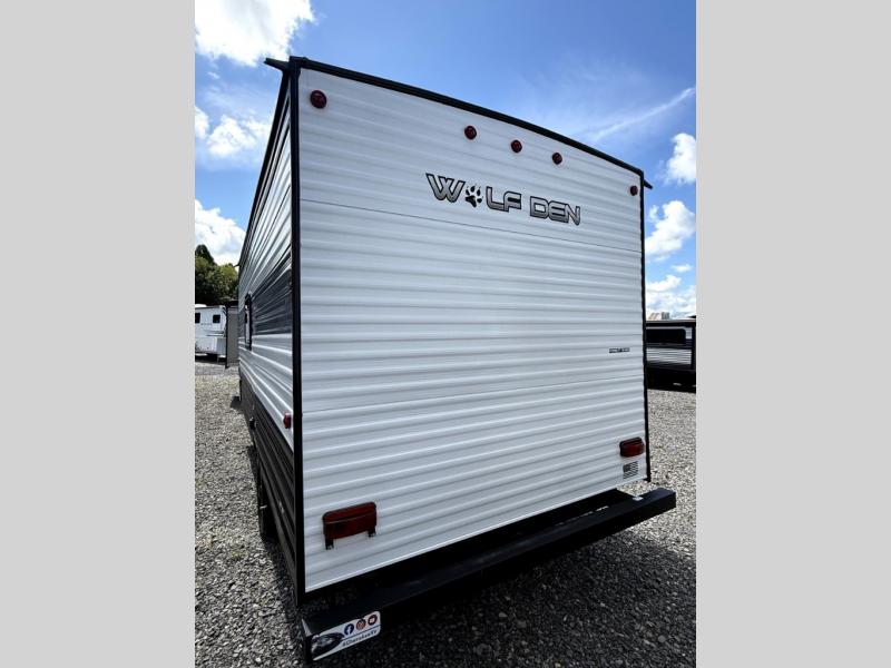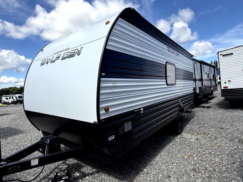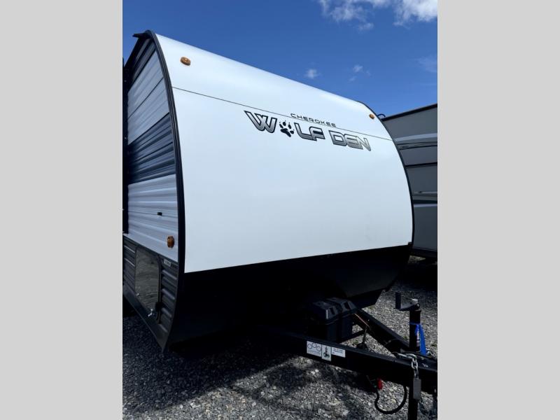 The Cherokee Wolf Den travel trailers by Forest River are lightweight for easy towing, while still including the camping essentials you're looking for! There are a variety of floorplans to choose from, including bunkhouse models, couple's units, and even all-electric floorplans! You'll find a tub/shower in each travel trailer, a comfortable queen bed, seating spaces to relax on, and kitchen amenities that will make your space feel more like home. There are storage spaces inside for your belongings plus outdoor storage for fishing gear, camp chairs, tools, and more! Start a new adventure today in a Cherokee Wolf Den travel trailer today!