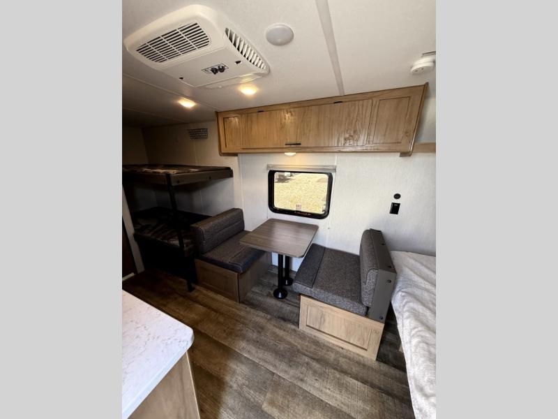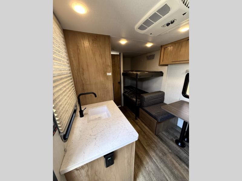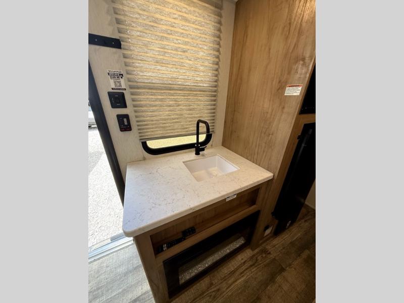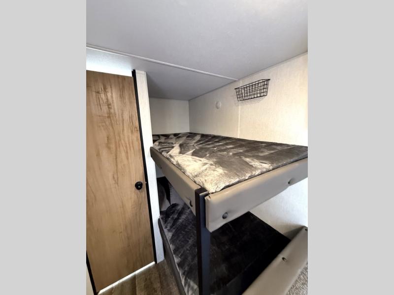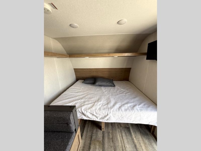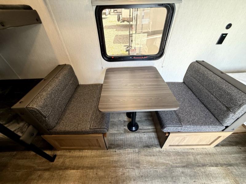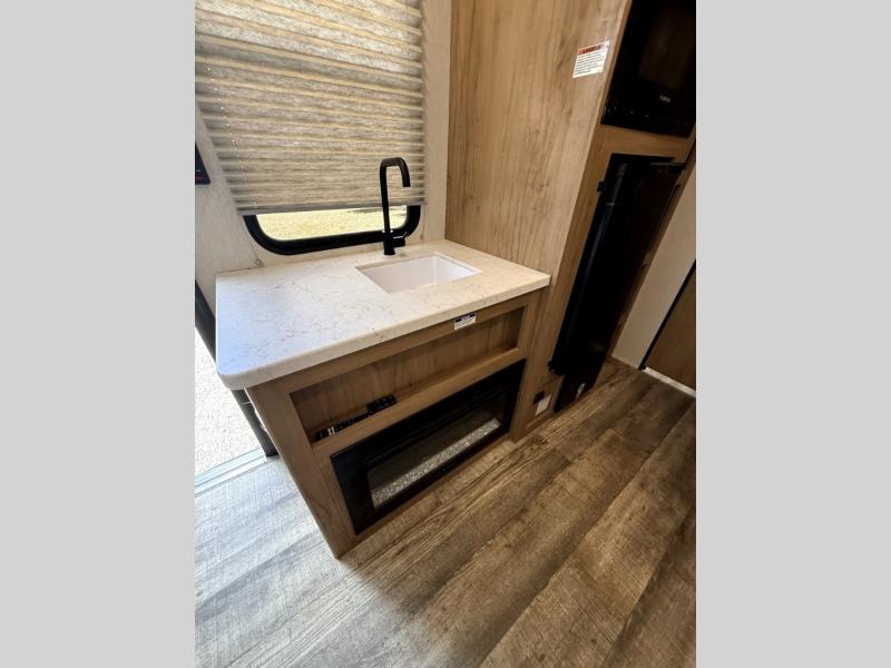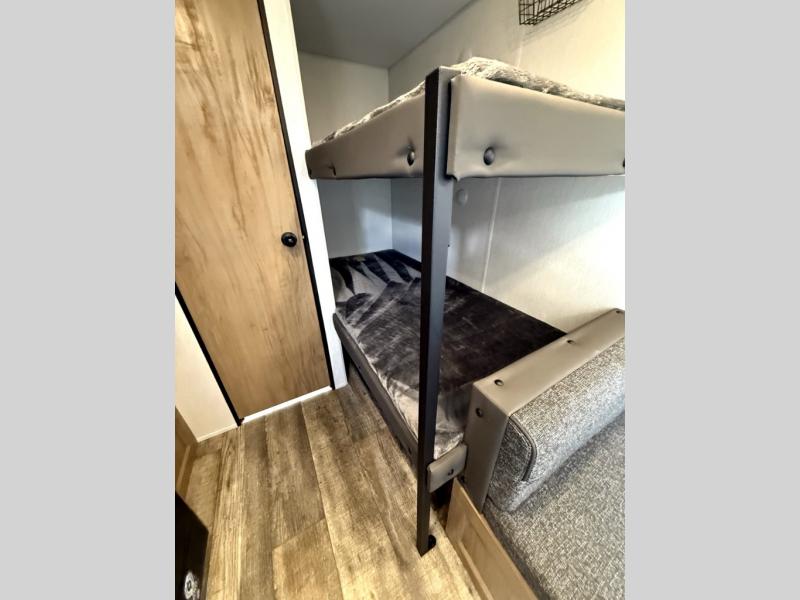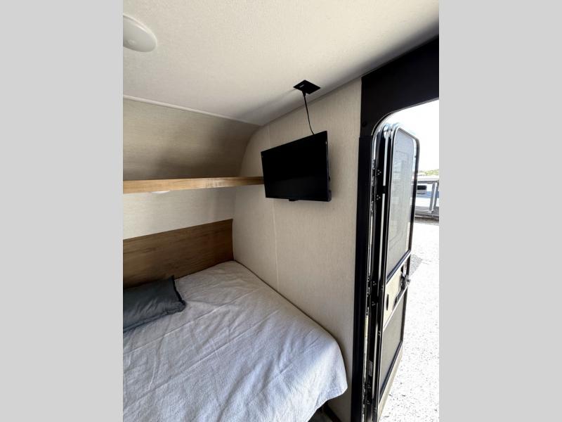 Enjoy family adventures in this all-electric bunk model which features sleeping for four or six depending on size with a queen bed up front, oversized bunks in the rear roadside corner, and you could even convert the booth dinette to sleep more. Inside, you will find ample storage with overhead cabinets and a large shelf above the queen bed, plus four shelves next to the refrigerator and microwave/air fryer that feature decorative storage bins for your things. Use this space for pantry items, towels, or clothing storage. There is even a 5,000 BTU electric fireplace below the counter and sink to bring you a bit of heat on those chilly nights, and you will find TV prep both inside and out if you wish to add TVs for more entertainment. On the outside, you will also find a 12' awning and plenty of outside storage for your camping gear, plus more!