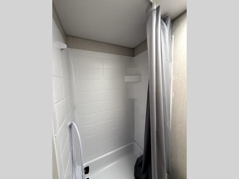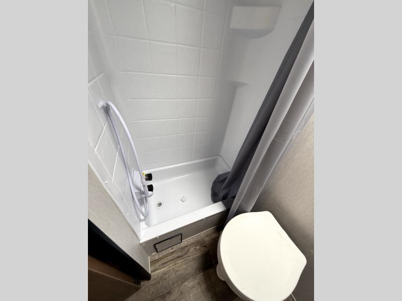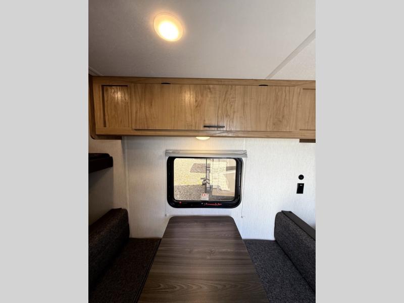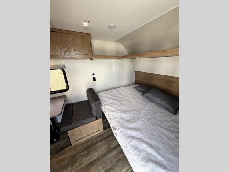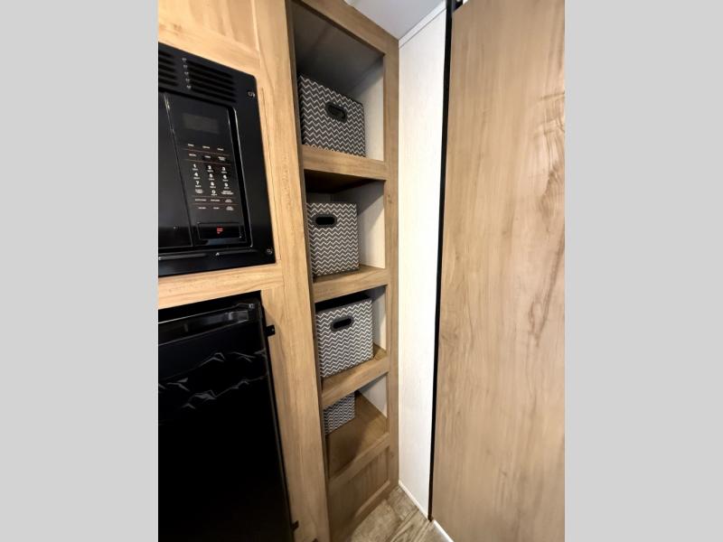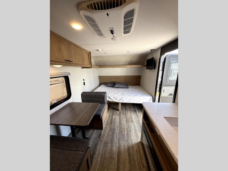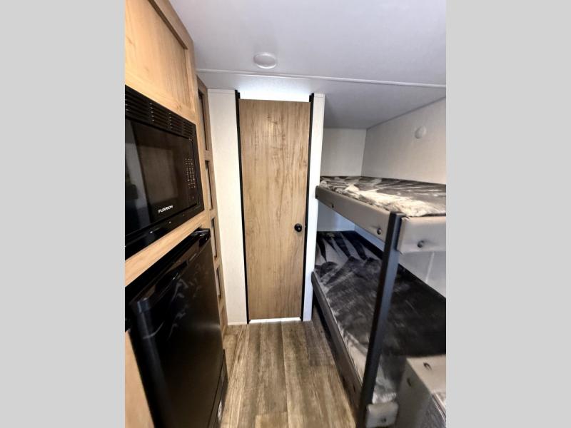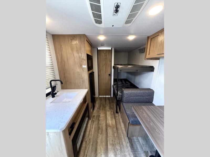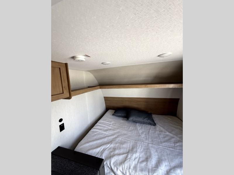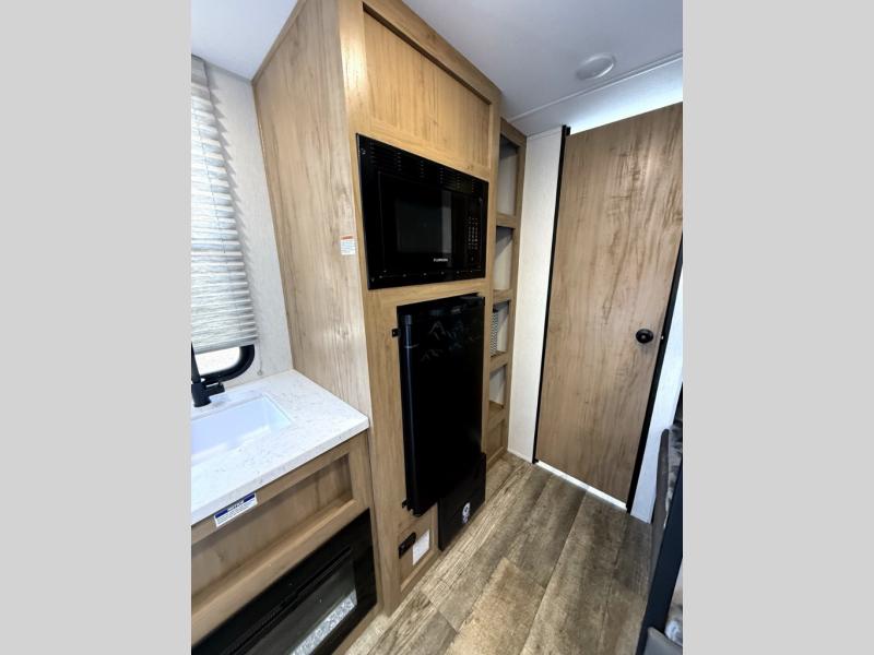 Enjoy family adventures in this all-electric bunk model which features sleeping for four or six depending on size with a queen bed up front, oversized bunks in the rear roadside corner, and you could even convert the booth dinette to sleep more. Inside, you will find ample storage with overhead cabinets and a large shelf above the queen bed, plus four shelves next to the refrigerator and microwave/air fryer that feature decorative storage bins for your things. Use this space for pantry items, towels, or clothing storage. There is even a 5,000 BTU electric fireplace below the counter and sink to bring you a bit of heat on those chilly nights, and you will find TV prep both inside and out if you wish to add TVs for more entertainment. On the outside, you will also find a 12' awning and plenty of outside storage for your camping gear, plus more!