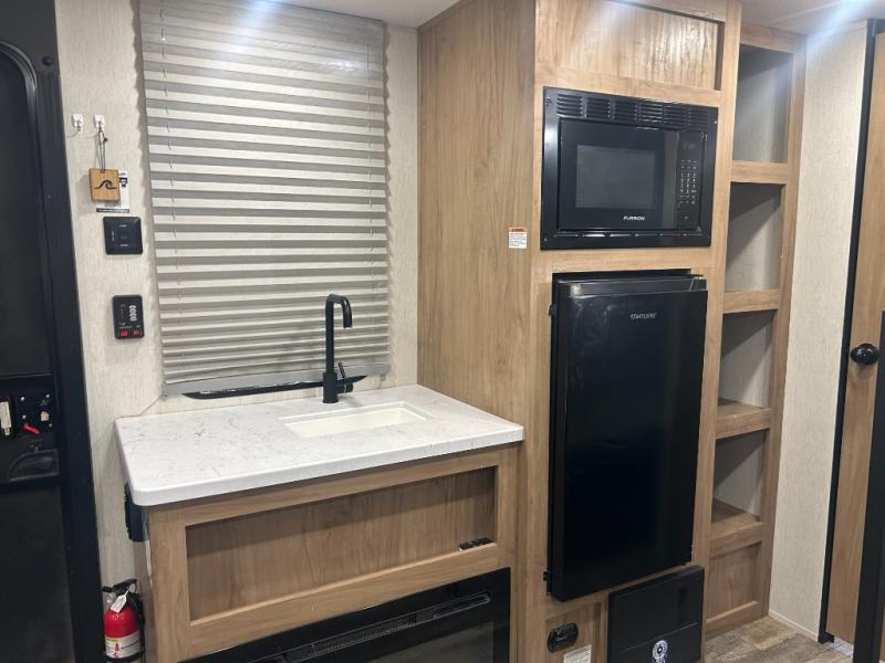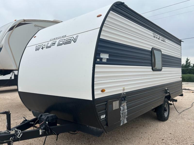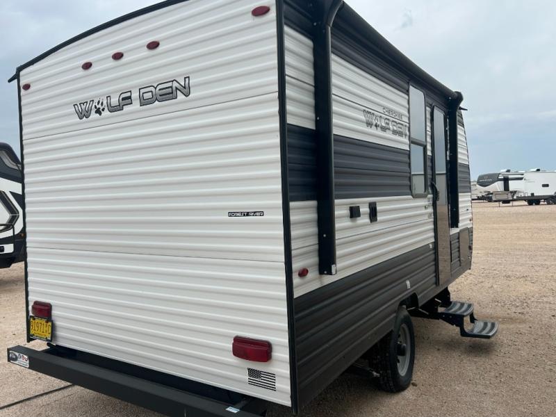 The Cherokee Wolf Den travel trailers by Forest River are lightweight for easy towing, while still including the camping essentials you're looking for! There are a variety of floorplans to choose from, including bunkhouse models, couple's units, and even all-electric floorplans! You'll find a tub/shower in each travel trailer, a comfortable queen bed, seating spaces to relax on, and kitchen amenities that will make your space feel more like home. There are storage spaces inside for your belongings plus outdoor storage for fishing gear, camp chairs, tools, and more! Start a new adventure today in a Cherokee Wolf Den travel trailer today!