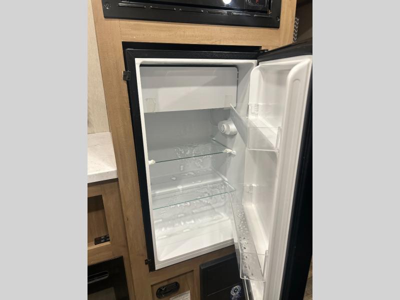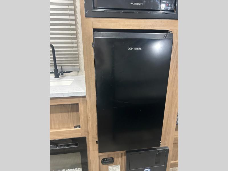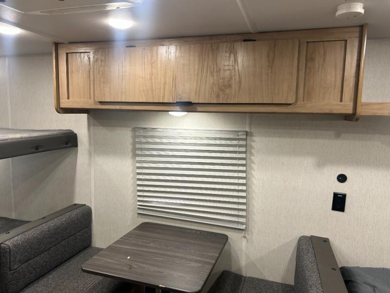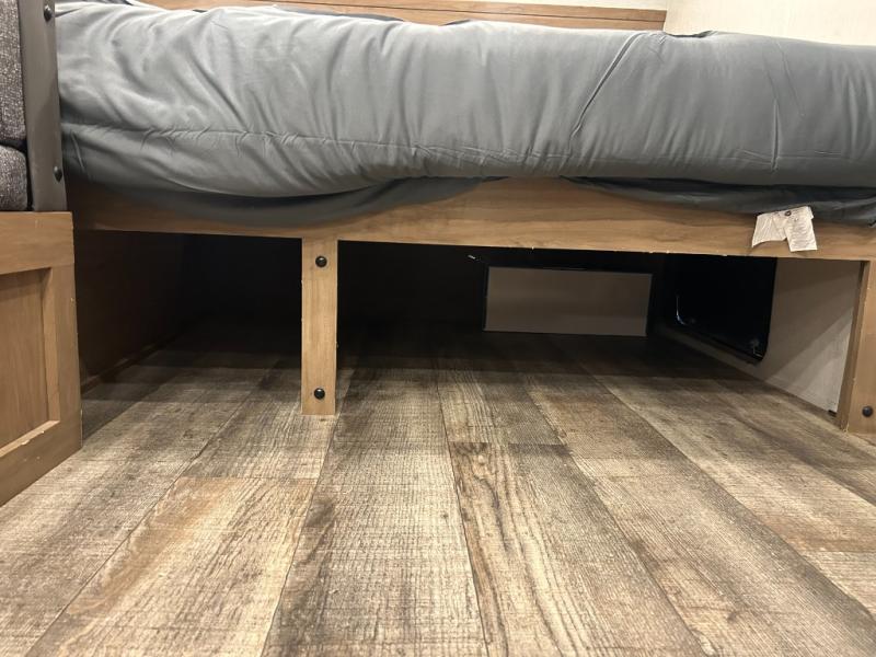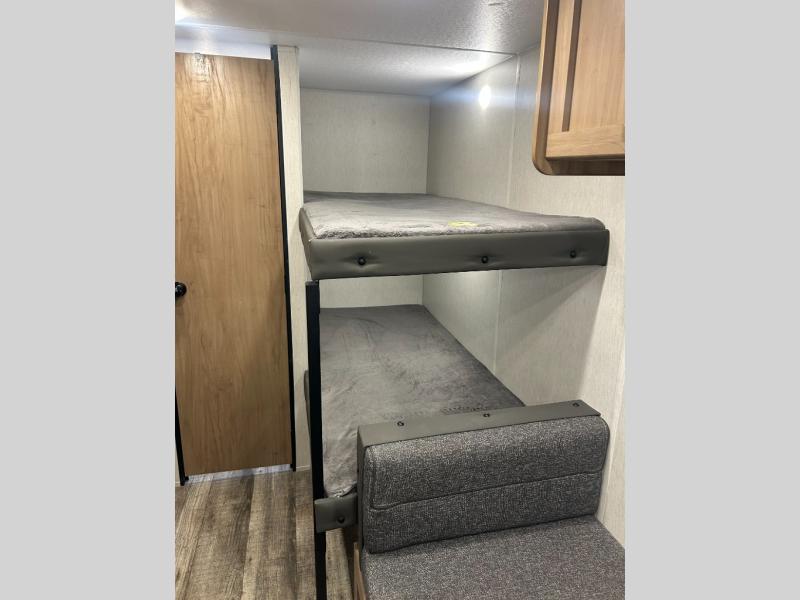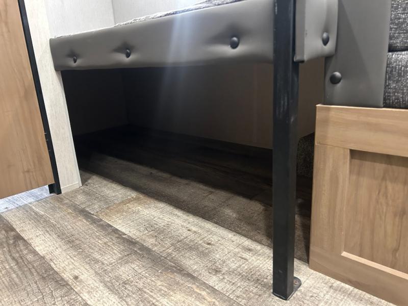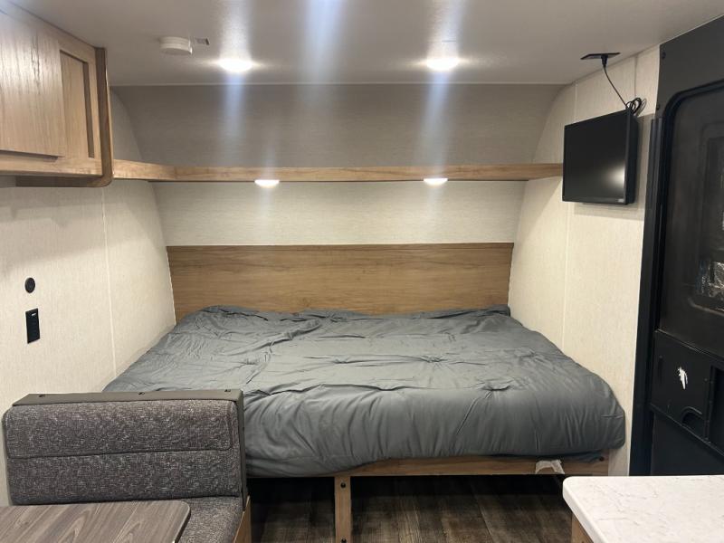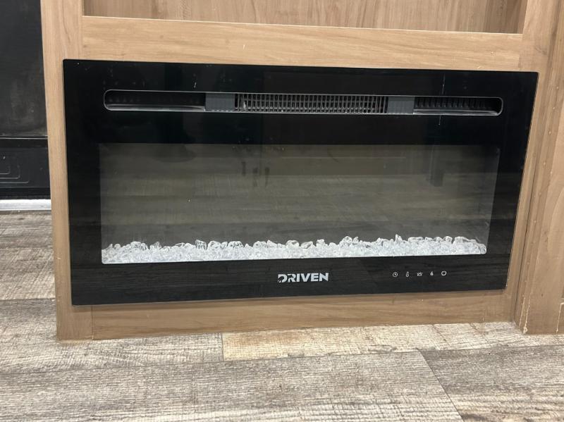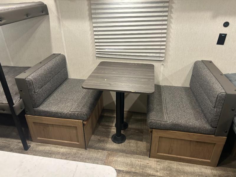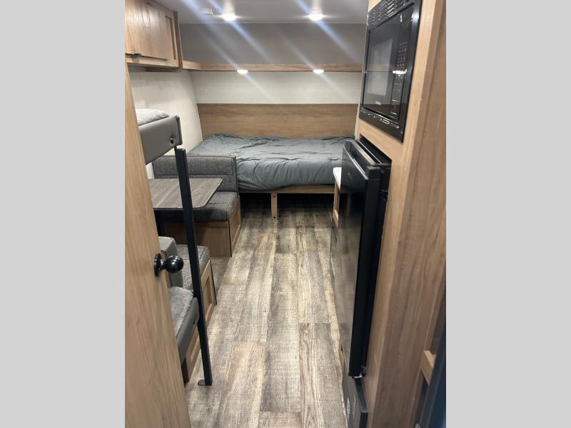 Enjoy family adventures in this all-electric bunk model which features sleeping for four or six depending on size with a queen bed up front, oversized bunks in the rear roadside corner, and you could even convert the booth dinette to sleep more. Inside, you will find ample storage with overhead cabinets and a large shelf above the queen bed, plus four shelves next to the refrigerator and microwave/air fryer that feature decorative storage bins for your things. Use this space for pantry items, towels, or clothing storage. There is even a 5,000 BTU electric fireplace below the counter and sink to bring you a bit of heat on those chilly nights, and you will find TV prep both inside and out if you wish to add TVs for more entertainment. On the outside, you will also find a 12' awning and plenty of outside storage for your camping gear, plus more!