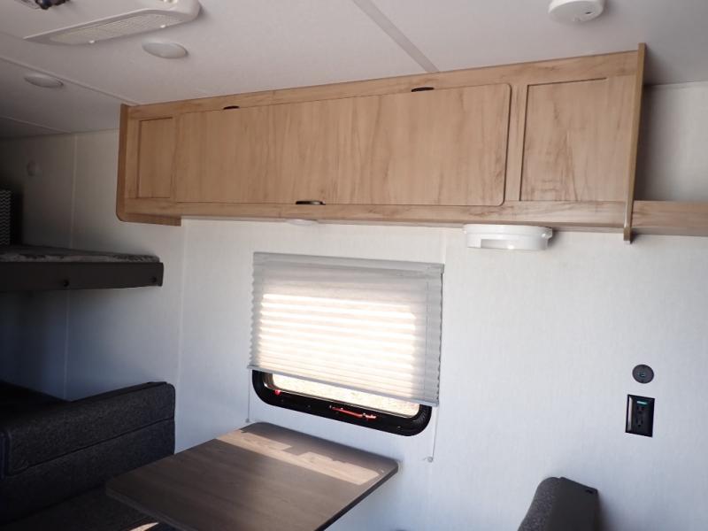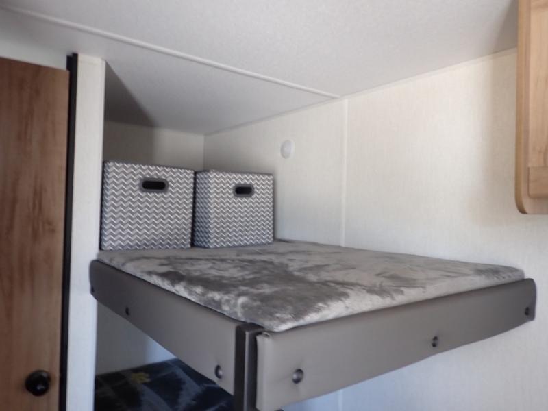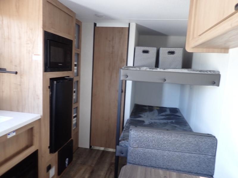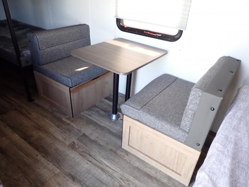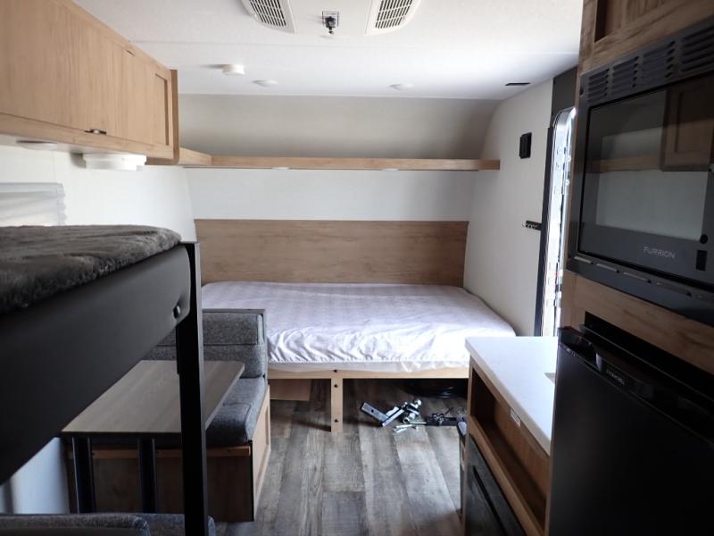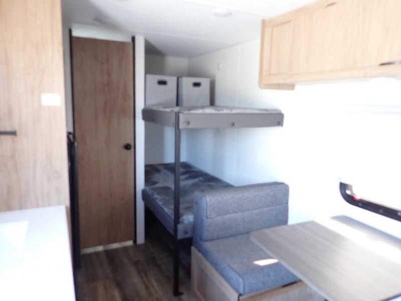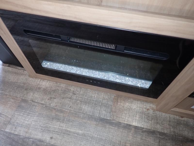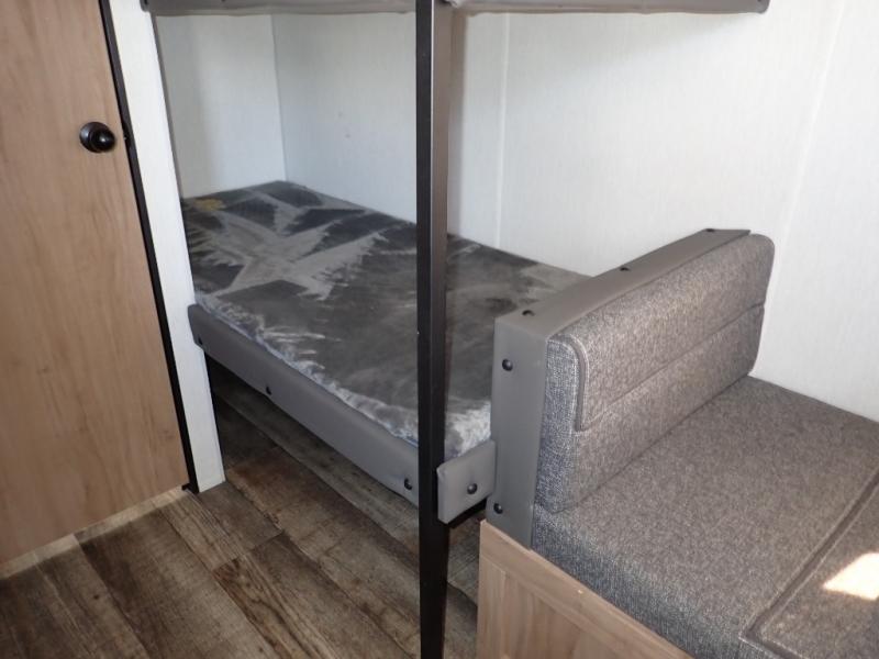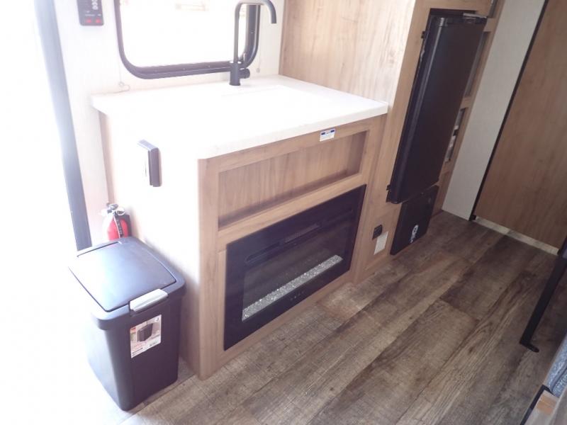 Enjoy family adventures in this all-electric bunk model which features sleeping for four or six depending on size with a queen bed up front, oversized bunks in the rear roadside corner, and you could even convert the booth dinette to sleep more. Inside, you will find ample storage with overhead cabinets and a large shelf above the queen bed, plus four shelves next to the refrigerator and microwave/air fryer that feature decorative storage bins for your things. Use this space for pantry items, towels, or clothing storage. There is even a 5,000 BTU electric fireplace below the counter and sink to bring you a bit of heat on those chilly nights, and you will find TV prep both inside and out if you wish to add TVs for more entertainment. On the outside, you will also find a 12' awning and plenty of outside storage for your camping gear, plus more!