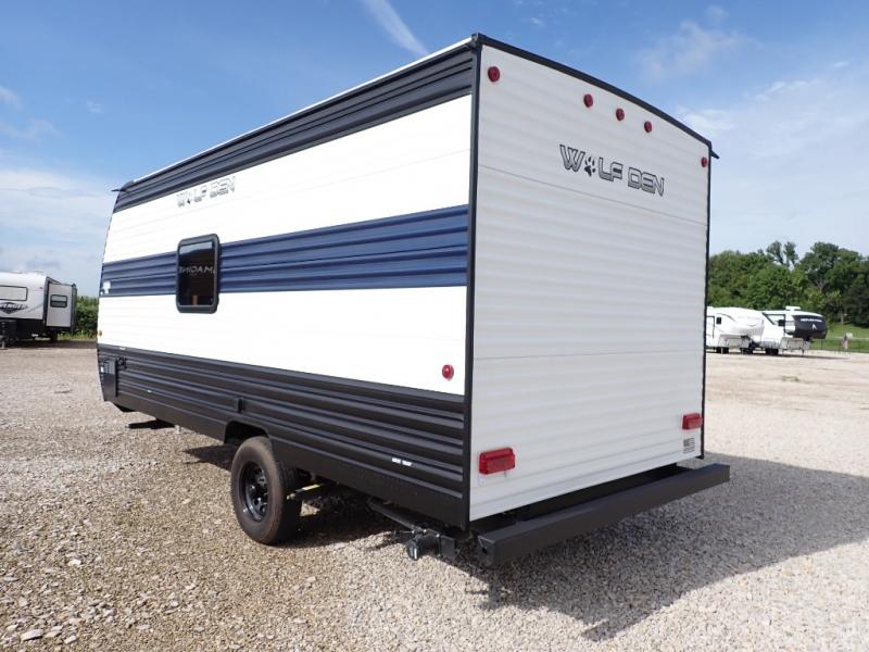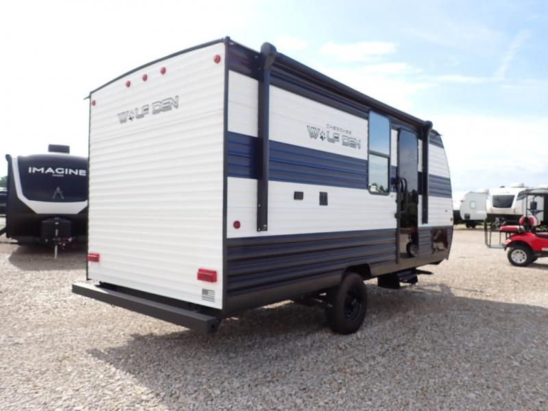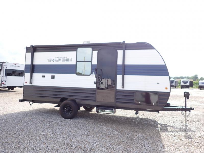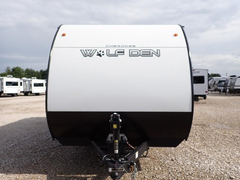 The Cherokee Wolf Den travel trailers by Forest River are lightweight for easy towing, while still including the camping essentials you're looking for! There are a variety of floorplans to choose from, including bunkhouse models, couple's units, and even all-electric floorplans! You'll find a tub/shower in each travel trailer, a comfortable queen bed, seating spaces to relax on, and kitchen amenities that will make your space feel more like home. There are storage spaces inside for your belongings plus outdoor storage for fishing gear, camp chairs, tools, and more! Start a new adventure today in a Cherokee Wolf Den travel trailer today!