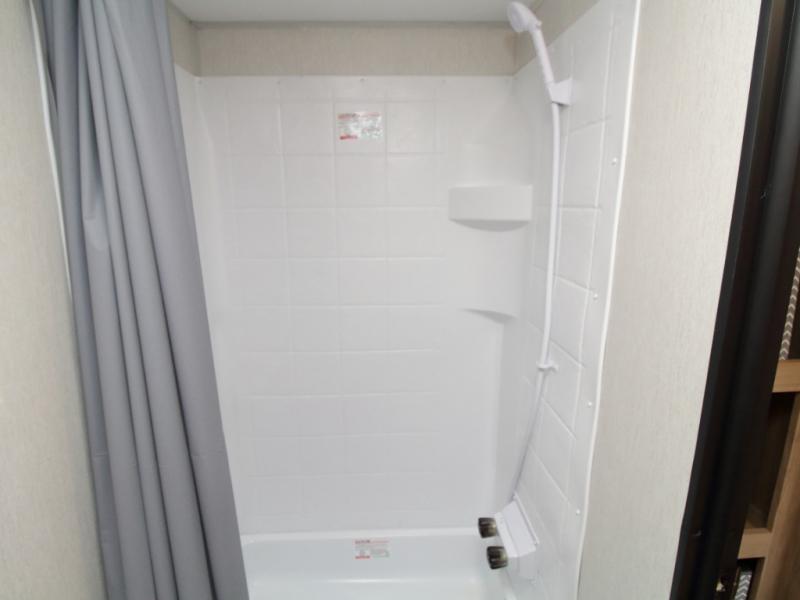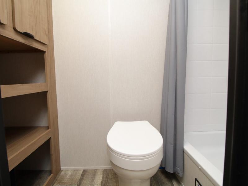 Full Rear Bath with tub/shower combo and a closet with shelves for towels and toiletries.
