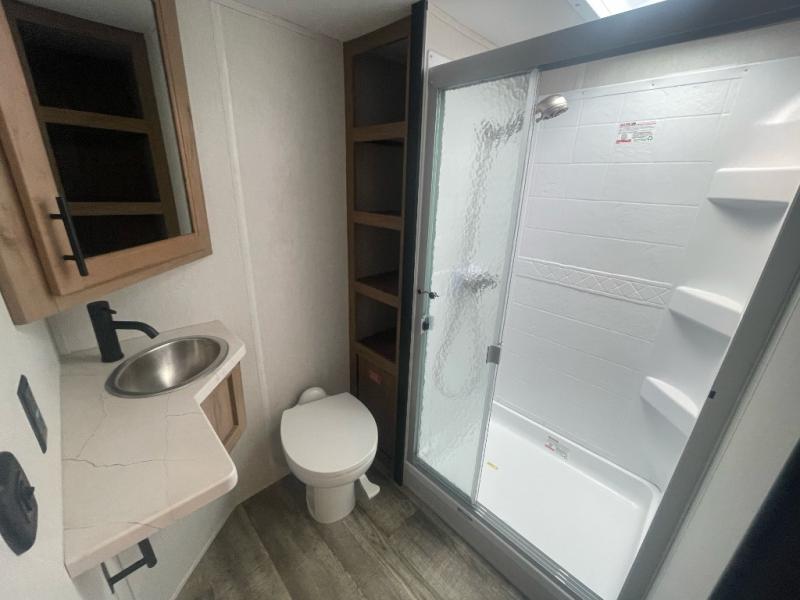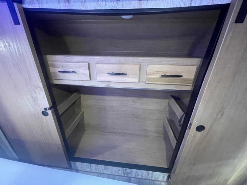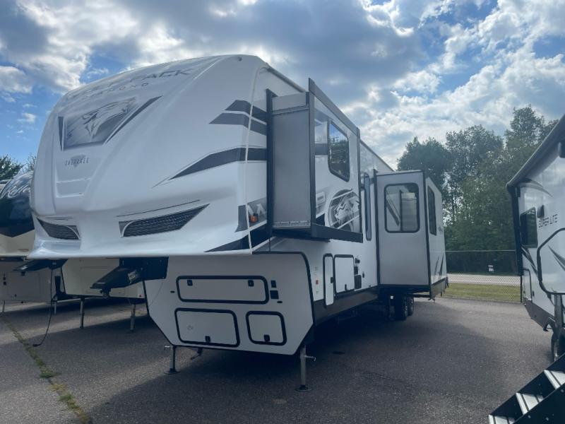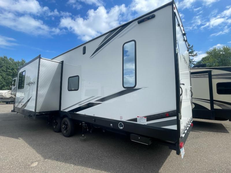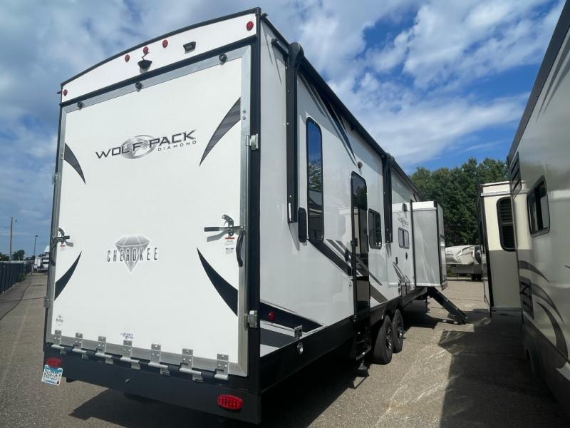 With any Cherokee Wolf Pack by Forest River, you will enjoy the most affordable and versatile toy hauler on the market! These fifth wheels and travel trailers feature an 8' 6" widebody design so you can bring along four-wheelers, kayak's, ATV's, golf carts, and gear galore! There is a forced air heated underbelly and enclosed holding tanks, plus a large 35,000 BTU forced air ducted furnace so you can camp all year around. Inside, you'll find zebra shades in the living room, real wood cabinet doors and drawers, LED lights, and a residential stainless steel farm sink. There is also a power awning with LED accent lighting, a large exterior folding grab handle, and an outside shower with hot and cold water to wash off your riding boots. There are also select features available within the Platinum Package and options that can be added to further customize your Cherokee Wolf Pack!