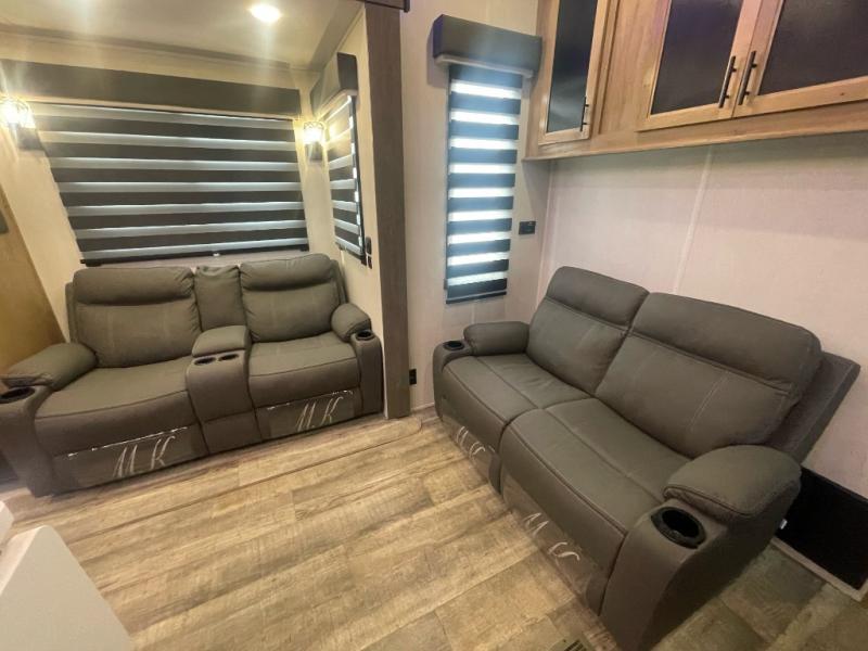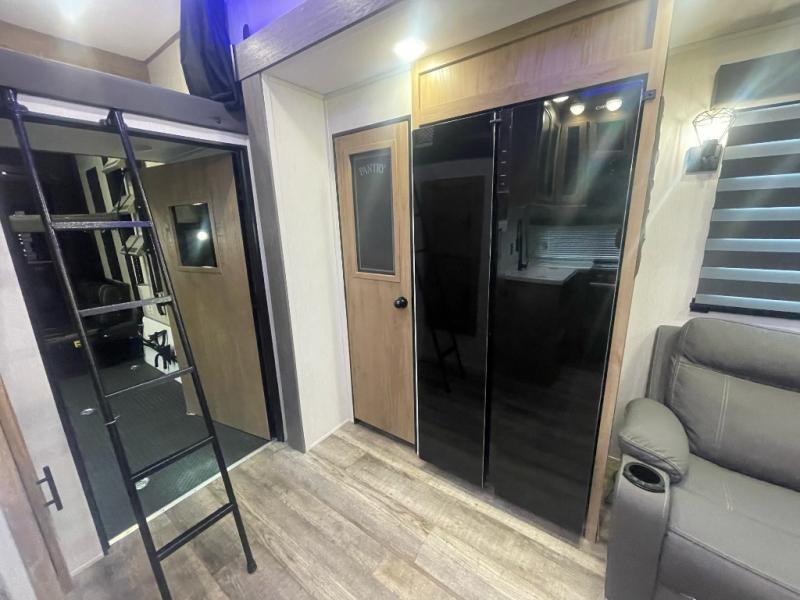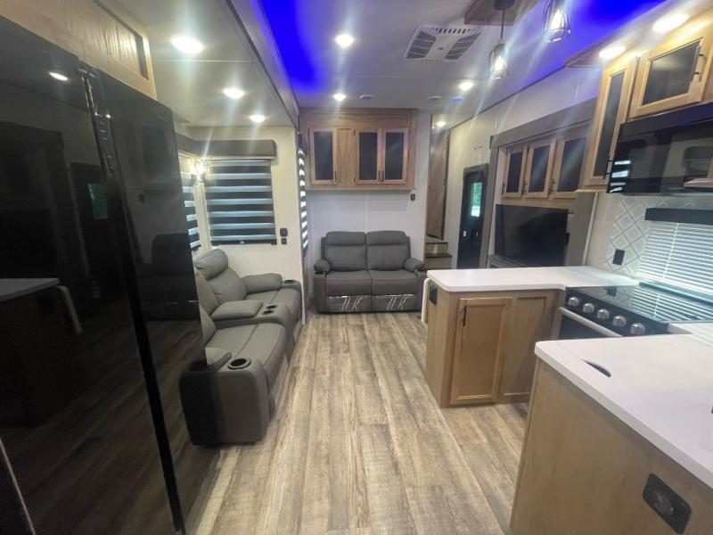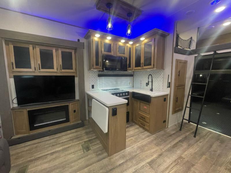This fifth wheel is packed with features you don't want to pass up! The Diamond Package includes a three season garage wall, 6-point auto leveling, slam latch doors, and a TV in the living room for movie nights. You will also find aluminum sidewall construction, solid surface countertops in the kitchen, a 30" residential microwave, and more! The 14' separate garage will not only store your toys, but will double as your guests' bedroom since there is a Happijac power bed above a sofa/bed, a convenient half bath, plus a loft. Everyone can meet in the main living area/kitchen to relax on the theater seating or additional sofa, and the U-shaped kitchen will be a big plus with the chef of your group. There is a flip-up counter for more prep space, a pantry, plus an extra large 16 cu. ft. 12V refrigerator for perishables. And don't overlook the outside kitchen with a refrigerator and an ice maker! The front master suite will feel just like home with its queen bed slide out, full-length wardrobe, and bedroom fireplace!