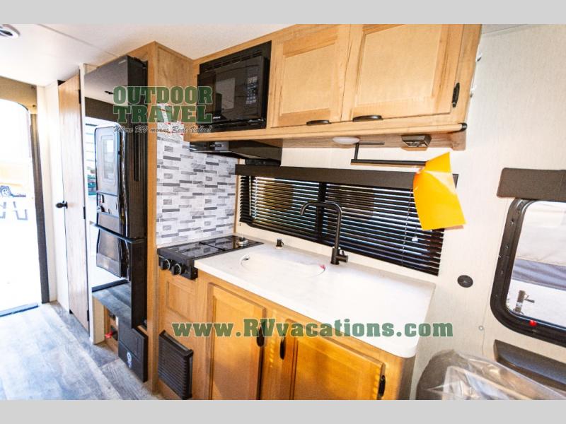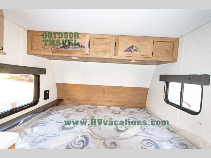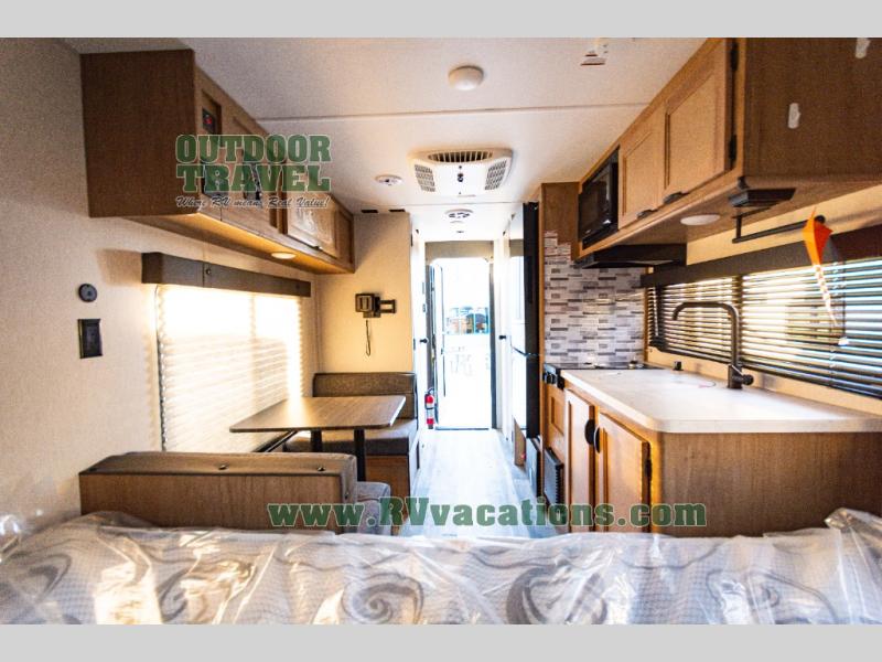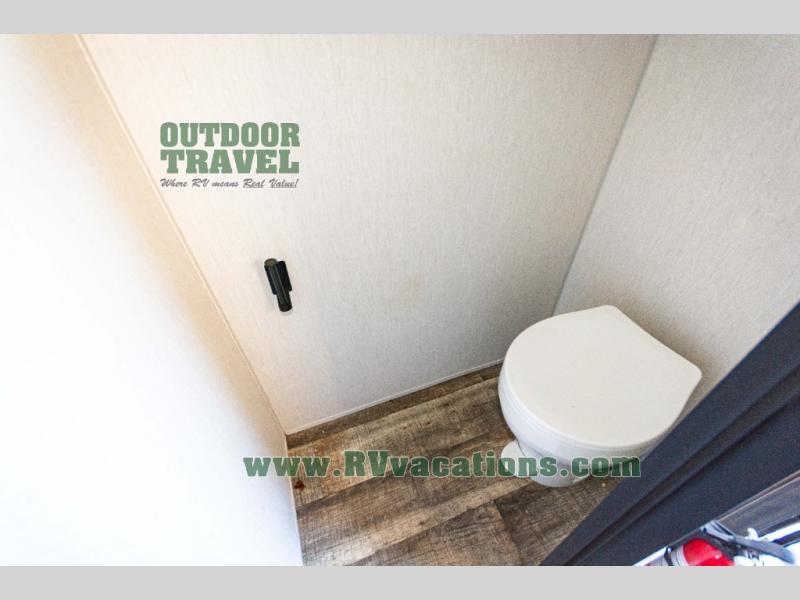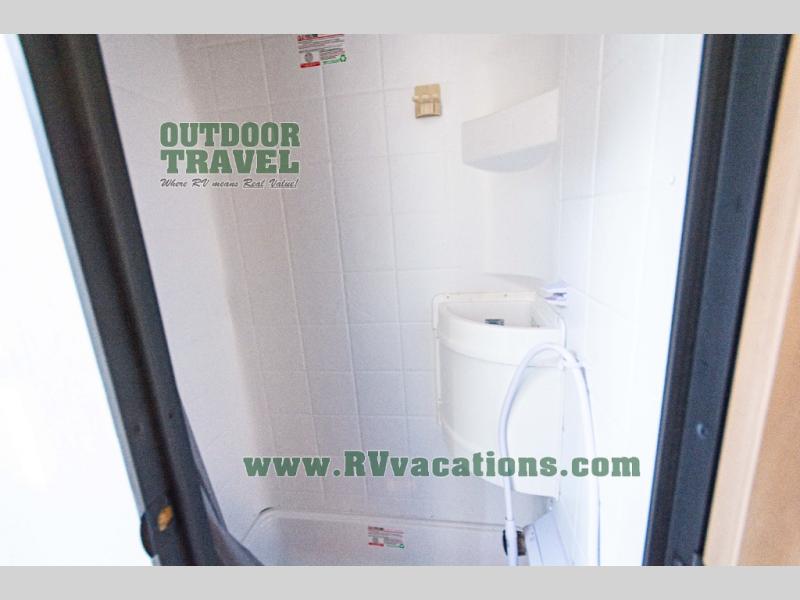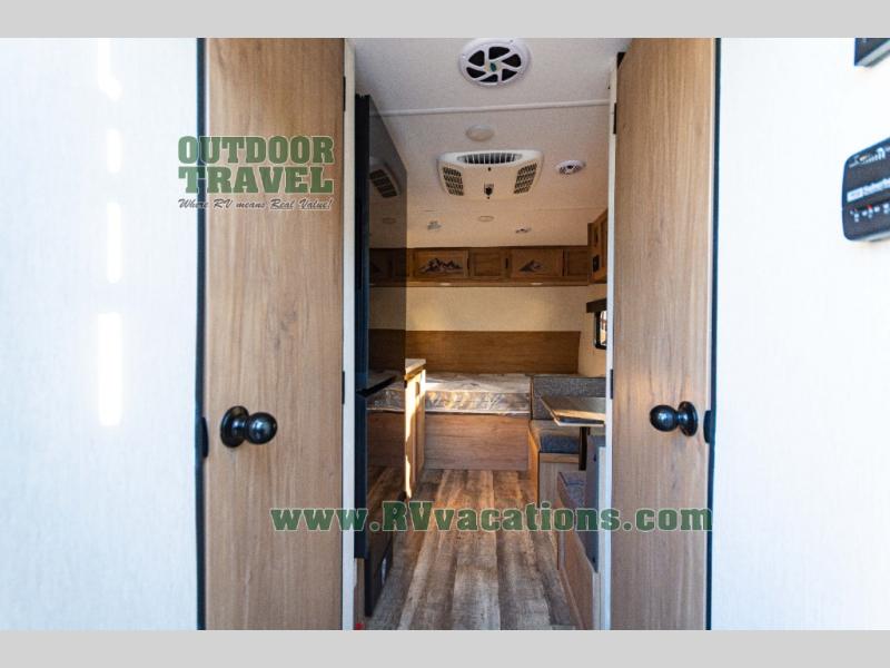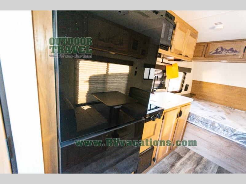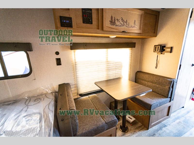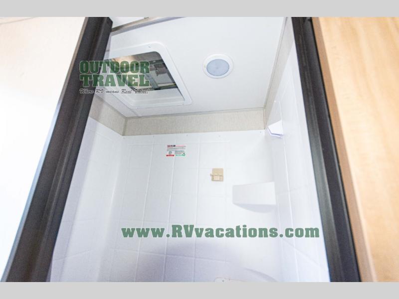There are lots of features packed into this 19' travel trailer! The rear entry design creates a split bathroom for one person to use the private toilet while another freshens up in the private shower. You can prepare your best home cooked meals with the high output cooktop, the 11 cu. ft. 12V high efficiency residential refrigerator, and a sink to make clean up easier, plus you can comfortably enjoy your meals at the booth dinette with a TV mount location. The front queen bed provides a comfortable place to lay your head at night. Store your outdoor gear in the outside storage area, rinse the mud off your feet with the outside shower, and watch the big game outdoors with the outside TV mount!