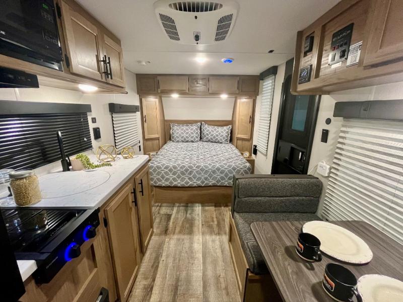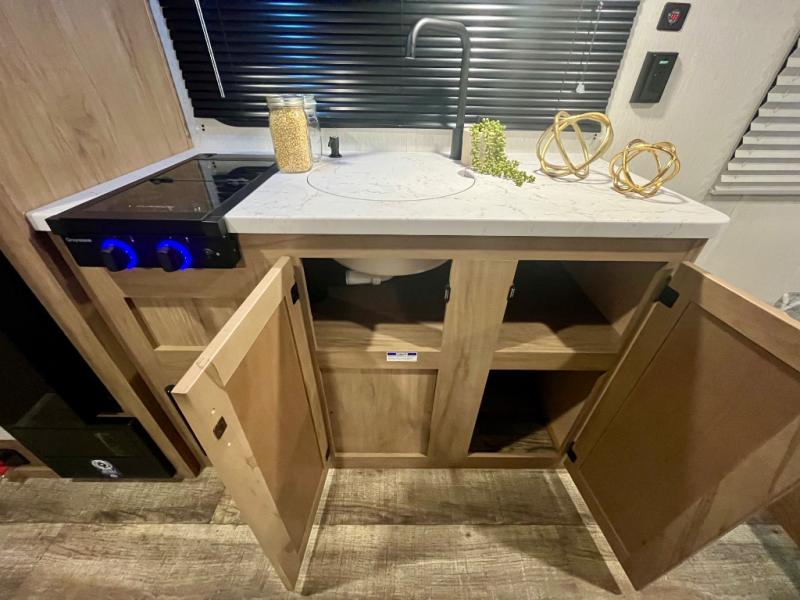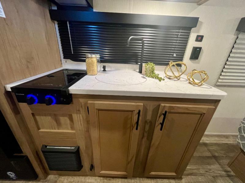 You will love camping in this travel trailer with a front queen bed. Freshen up each morning in the full rear bathroom with the tub/shower, a toilet, and sink. Fill your bellies with the perishables stored in the 11 cu. ft. 12V high efficiency residential refrigerator and cook them on the high output cooktop then enjoy them at the booth dinette. You could even prepare a meal while breathing in some fresh air at the outside mini kitchen while staying protected by the 12' power awning. Easily store all of your outdoor gear in the outside storage area too!