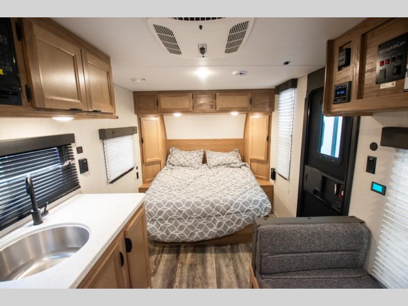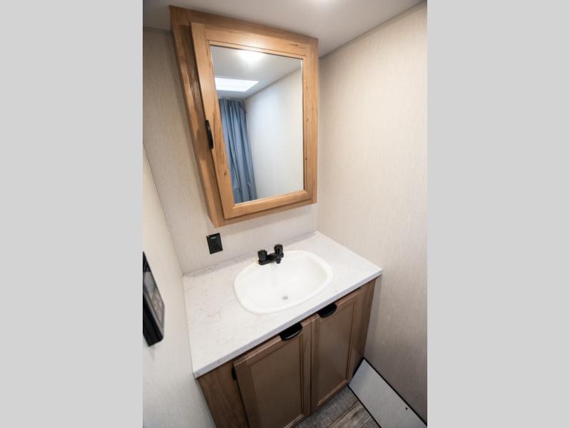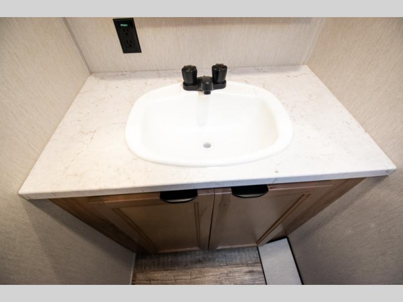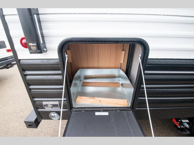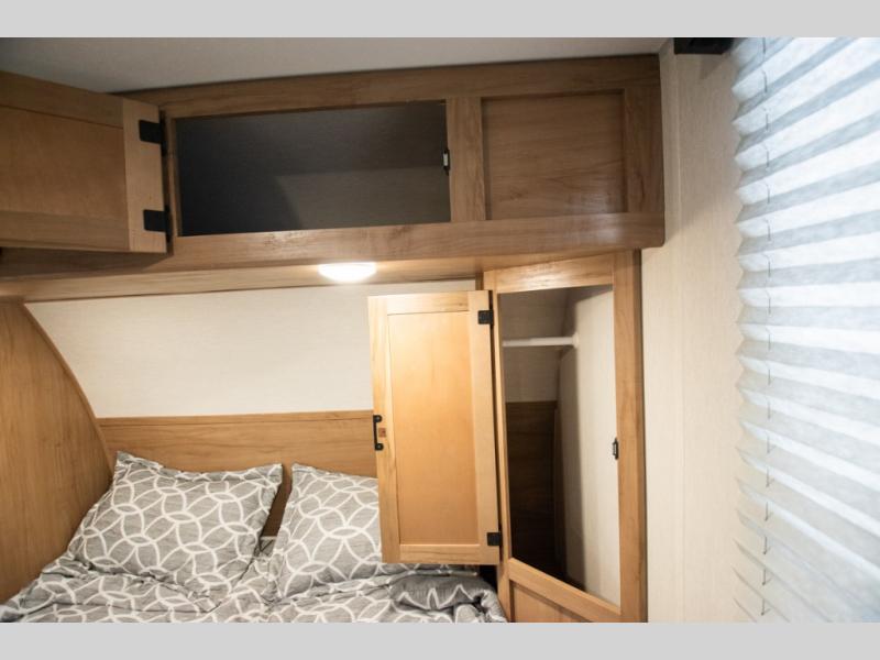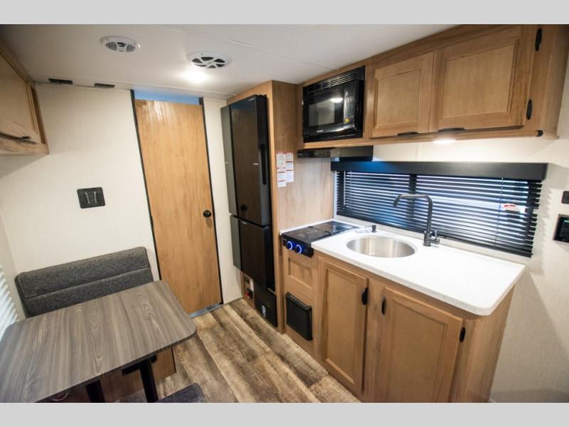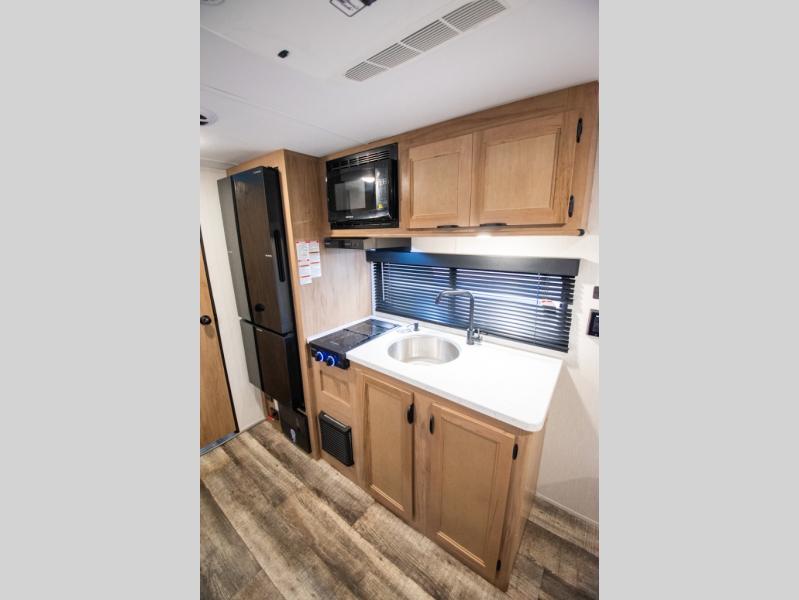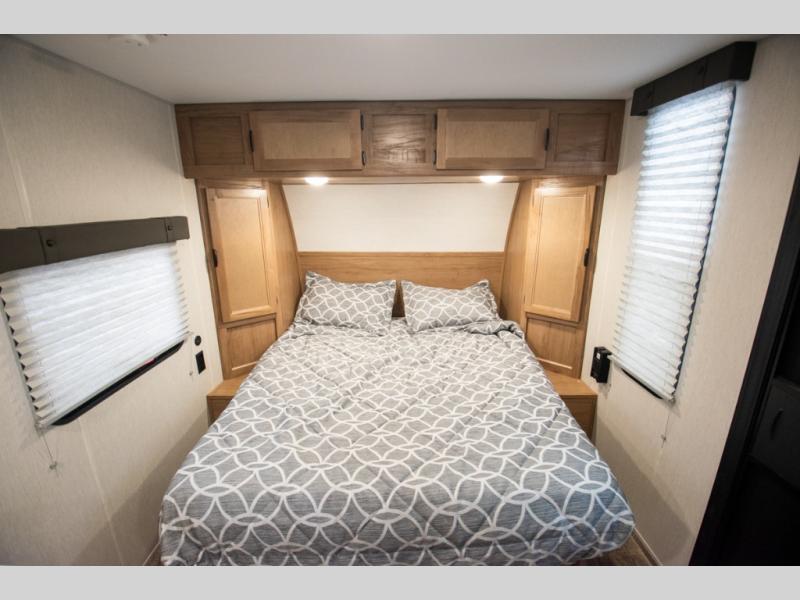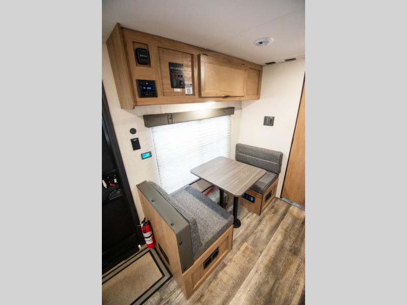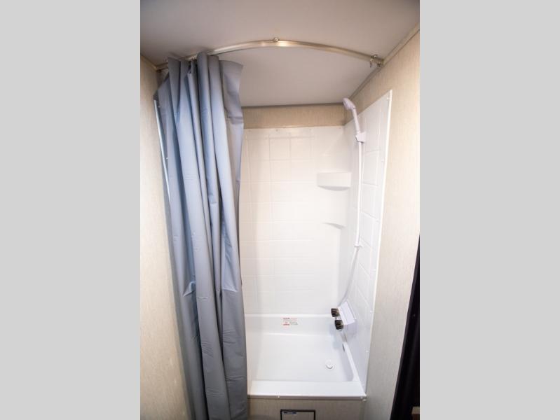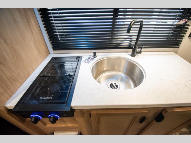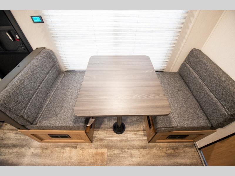 You will love camping in this travel trailer with a front queen bed. Freshen up each morning in the full rear bathroom with the tub/shower, a toilet, and sink. Fill your bellies with the perishables stored in the 11 cu. ft. 12V high efficiency residential refrigerator and cook them on the high output cooktop then enjoy them at the booth dinette. You could even prepare a meal while breathing in some fresh air at the outside mini kitchen while staying protected by the 12' power awning. Easily store all of your outdoor gear in the outside storage area too!