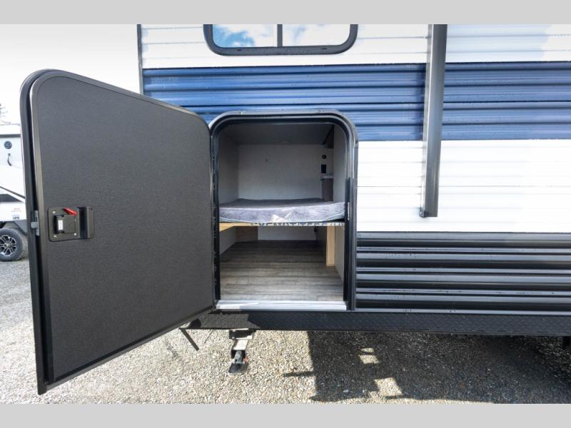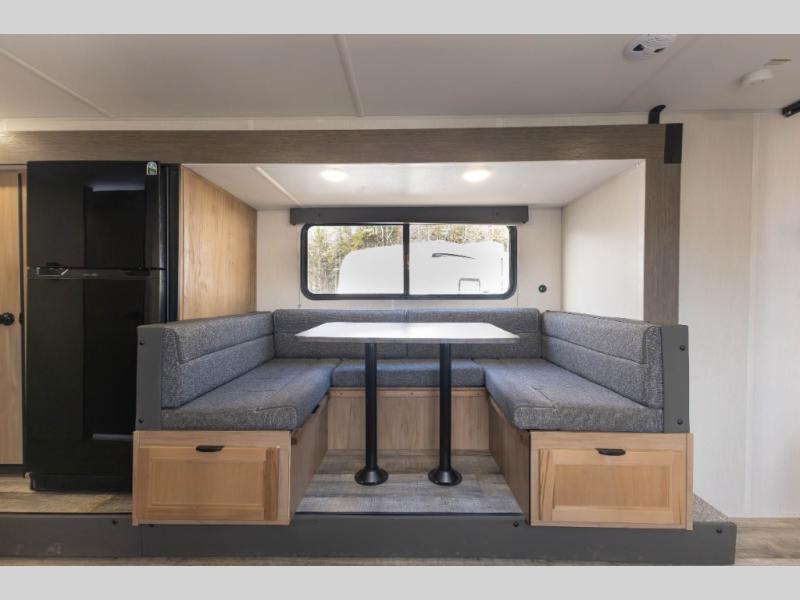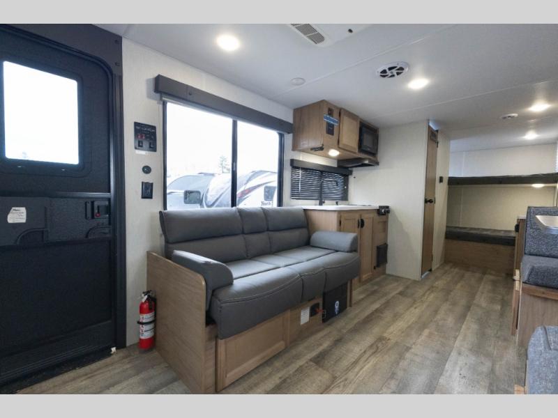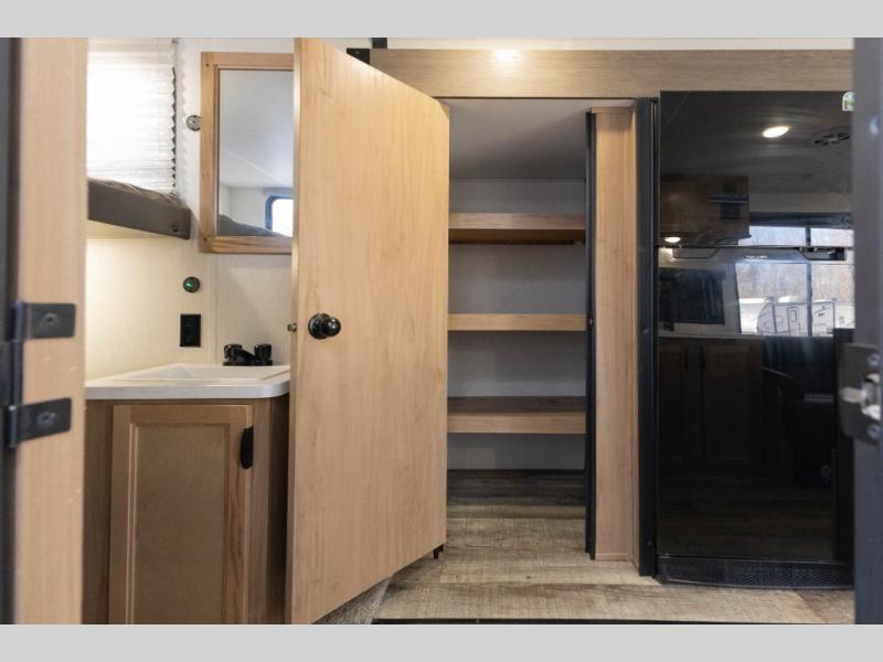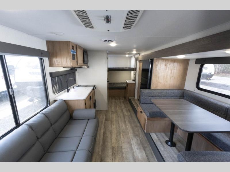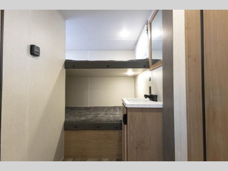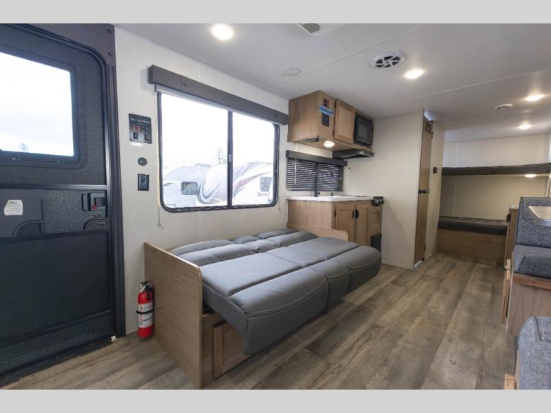 Sleeping for nine or ten is made easy in this Wolf Pup model with double-size bunks in the rear of the unit, a queen bed up front in the private bedroom with dual sliding entry doors, as well as when using the furniture once converted. The U-shaped dinette allows you to dine comfortably for meals, play games when indoors hanging out, and even use as a bed for two. Storage is in abundance in this Wolf Pup model with a storage plus door that allows you to pack in gear directly under the bunks. More outside storage can be found up front, and on the inside you will find a large pantry, overhead cabinets, plus wardrobes in the front bedroom for your clothing.