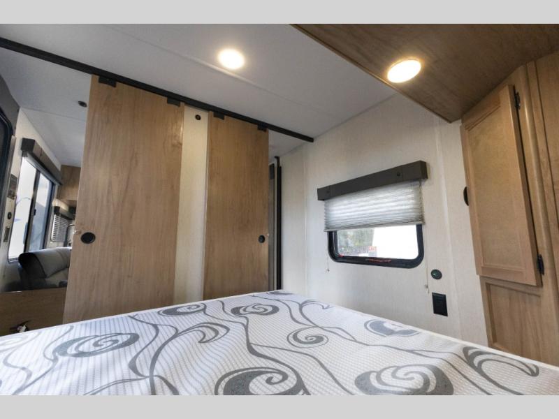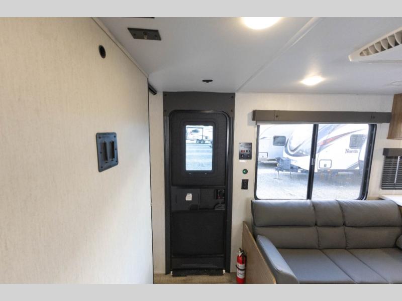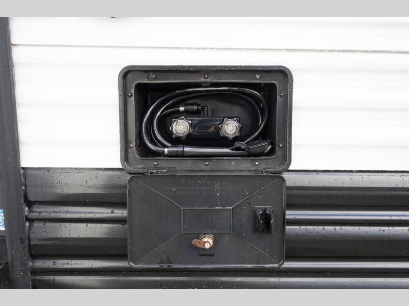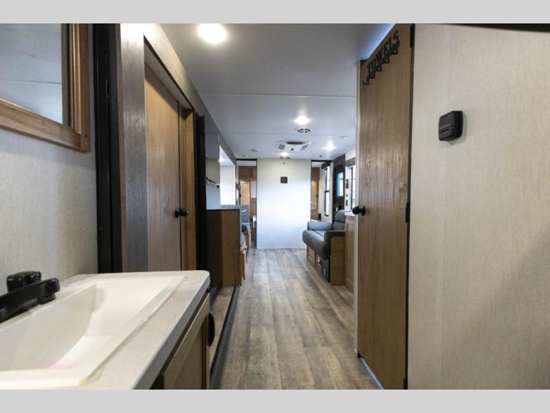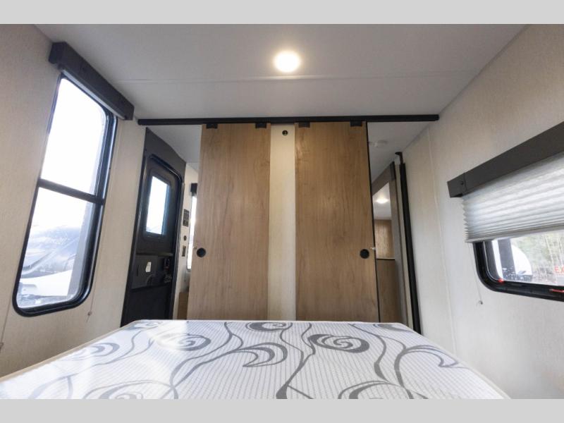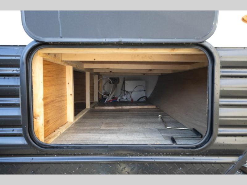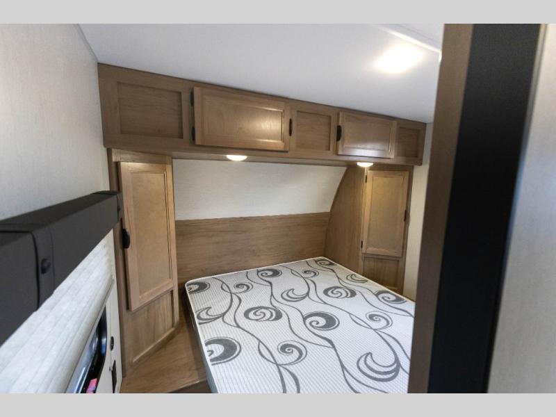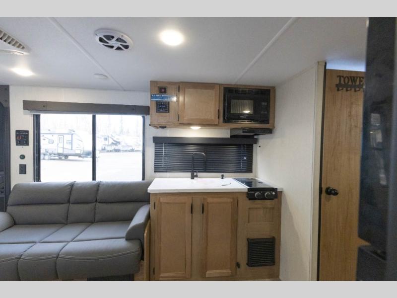 Sleeping for nine or ten is made easy in this Wolf Pup model with double-size bunks in the rear of the unit, a queen bed up front in the private bedroom with dual sliding entry doors, as well as when using the furniture once converted. The U-shaped dinette allows you to dine comfortably for meals, play games when indoors hanging out, and even use as a bed for two. Storage is in abundance in this Wolf Pup model with a storage plus door that allows you to pack in gear directly under the bunks. More outside storage can be found up front, and on the inside you will find a large pantry, overhead cabinets, plus wardrobes in the front bedroom for your clothing.