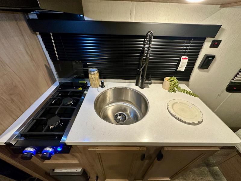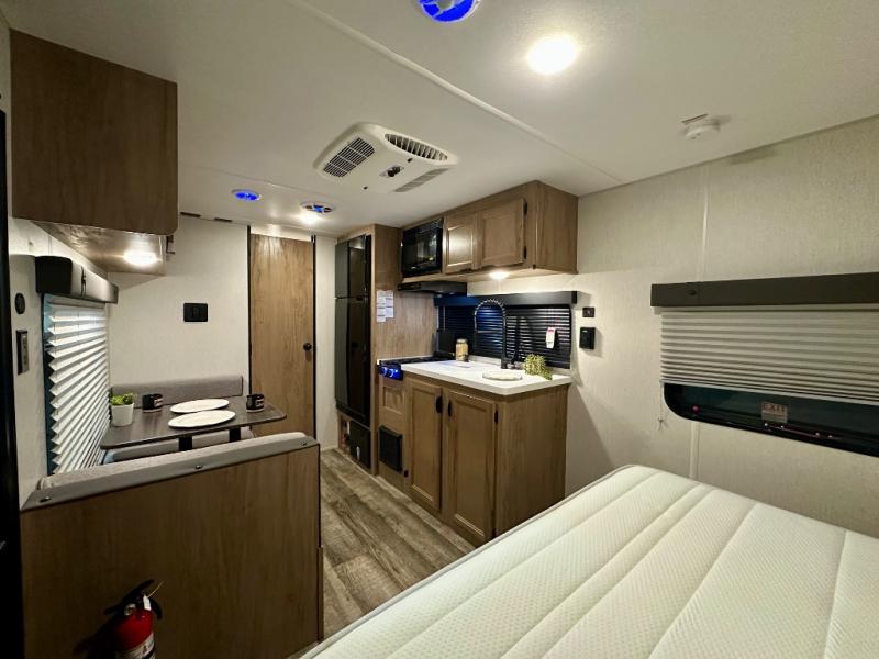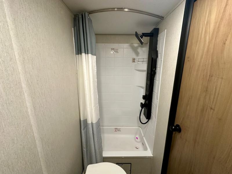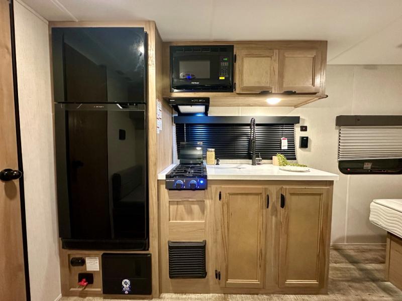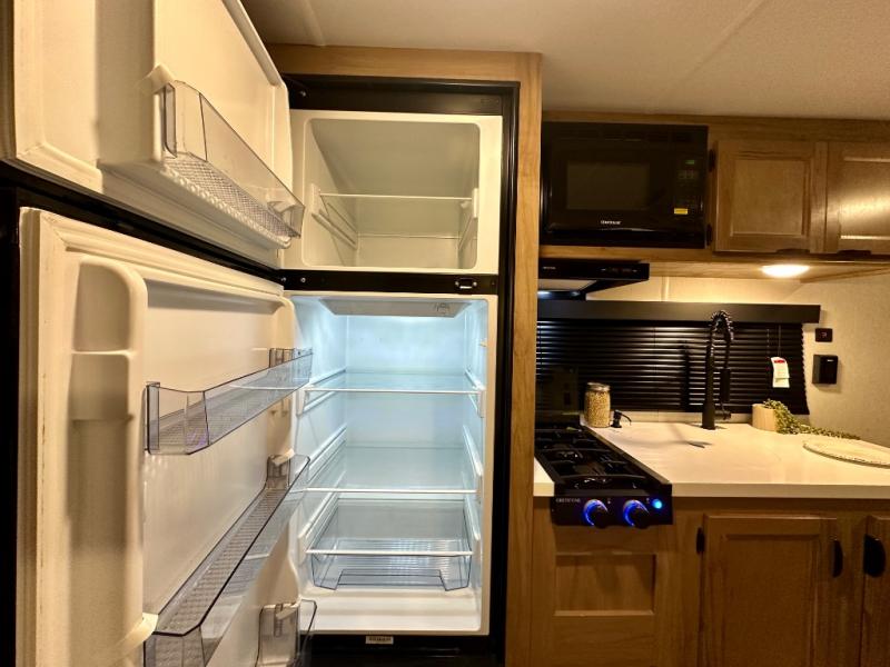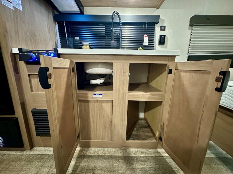 You will love camping in this travel trailer with your own queen bed up front! Freshen up each morning in the full rear bathroom with the tub/shower, toilet, and sink. Fill your bellies with the perishables stored in the 11 cu. ft. 12V high efficiency residential refrigerator and cook them on the high output cooktop. You could even prepare a meal while breathing in some fresh air at the outside mini kitchen while staying protected by the 12' power awning. Easily store all of your outdoor gear in the outside storage area too!