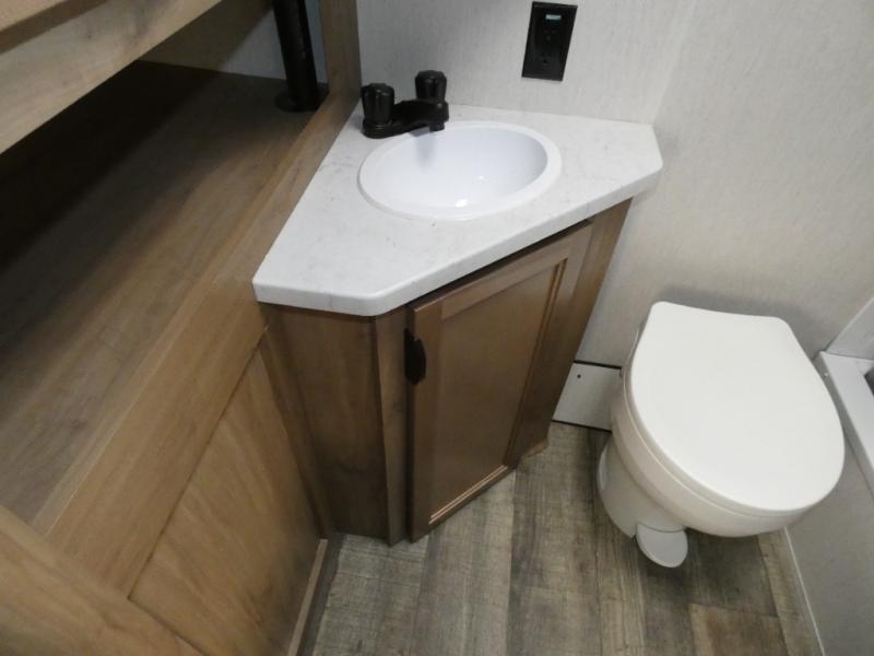 Comfortable and cozy is how to describe this couples coach featuring a rear bath and front kitchen layout! The front kitchen offers a large pantry, a round sink for cleaning up, and a flushmount range plus a microwave oven. The refrigerator is just to the left of the entry door and opposite a large slide for added space that includes a bed and booth dinette. You also have an outdoor mini kitchen so when the weather is nice you can enjoy cooking and dining while enjoying your camp surroundings. With a 12' awning and outside TV mount, you could easily make this an enjoyable space to hang out with family and friends in the campground.