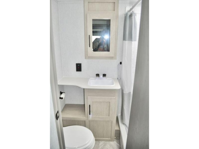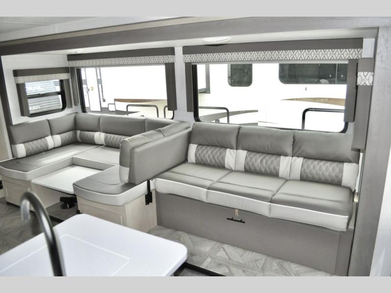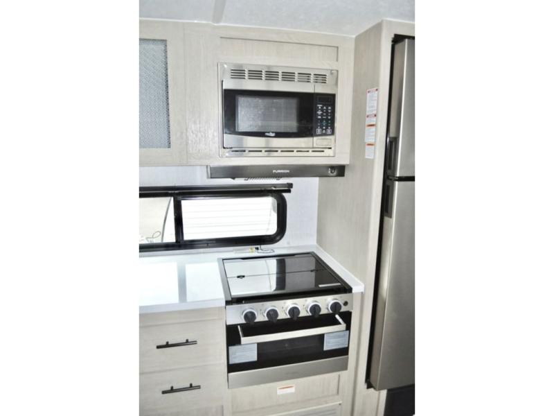 With any EVO Lite travel trailer or toy hauler by Forest River, there are features that provide function and convenience such as the power tongue jack, the stabilizer jacks, and the exterior Convenience package with a friction hinge entry door and magnetic latches on baggage doors, plus the SolidStep double step entrance. Inside you will love the look and durability of the solid surface countertops, the upgraded appliance package, and the extra large panoramic window package in the main slide that brings the outside in offering amazing views of your surroundings. Choose an EVO Lite today!