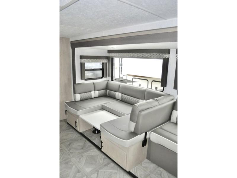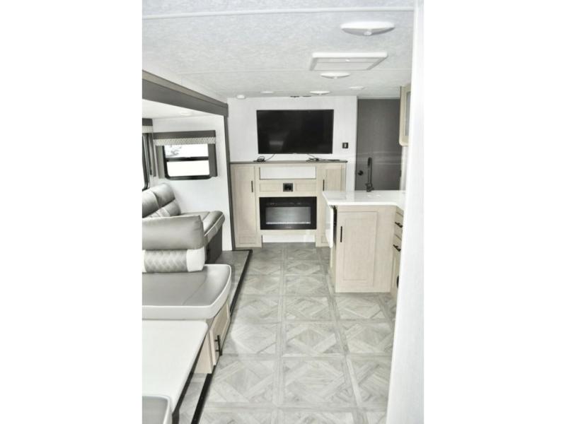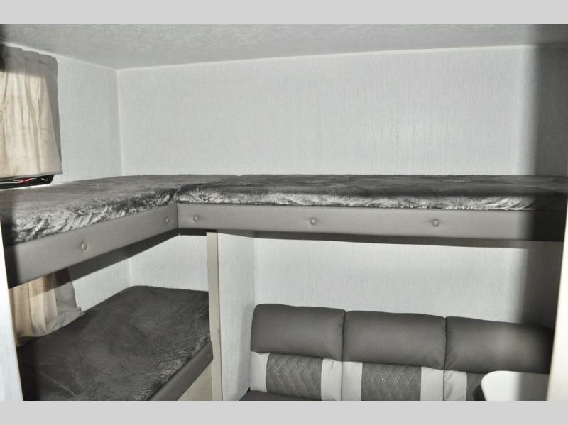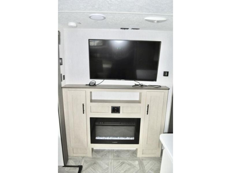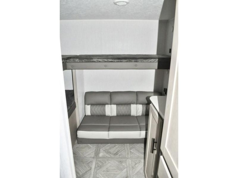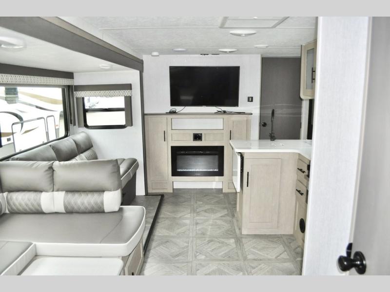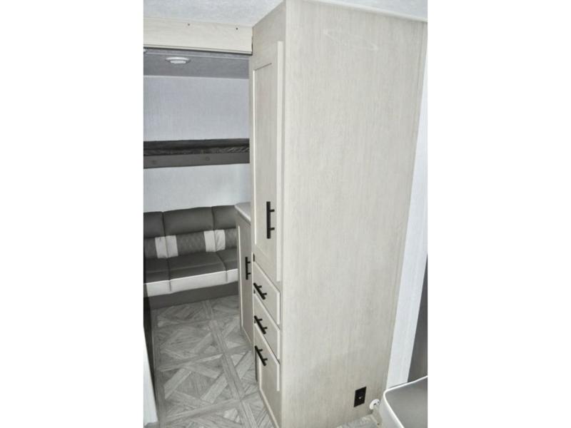 When you have a private bunkhouse in your trailer, you can allow the kids to have their own space or offer friends an overnight place to call their own! The rear bunkhouse includes a space saving sliding door for privacy, a jiffy sofa to relax on and two bunk beds, plus a wardrobe and entertainment center. The full bathroom is nearby, and the main living and kitchen area is spacious with a slide out U-shaped dinette and sofa. There are full amenities in the galley kitchen, a pantry for dry goods, plus a fireplace for all to enjoy. And the front bedroom allows you to sleep like a queen and keep everything tidy thanks to all the storage. And you might like to add the camp kitchen option if you enjoy cooking in the outdoors.