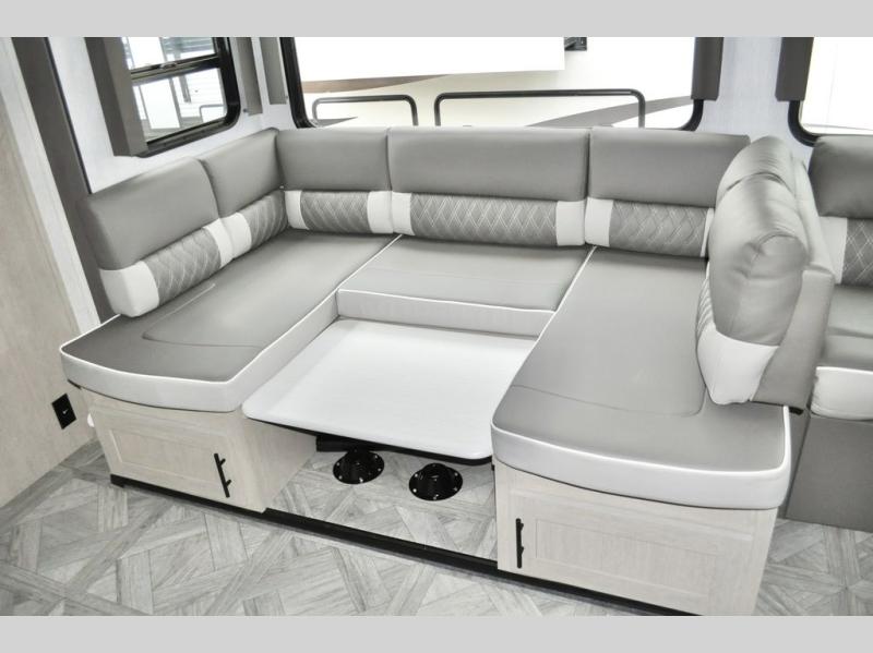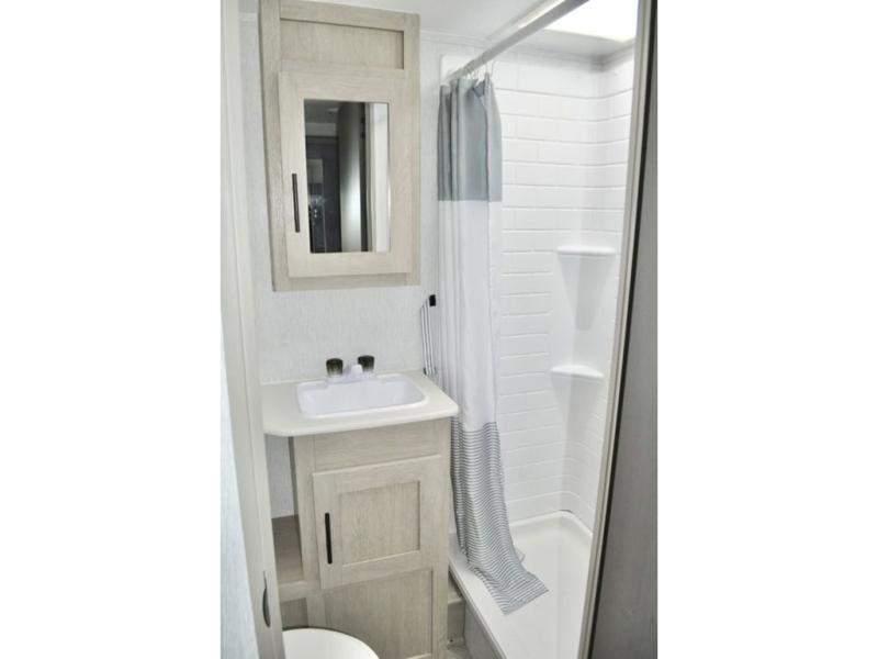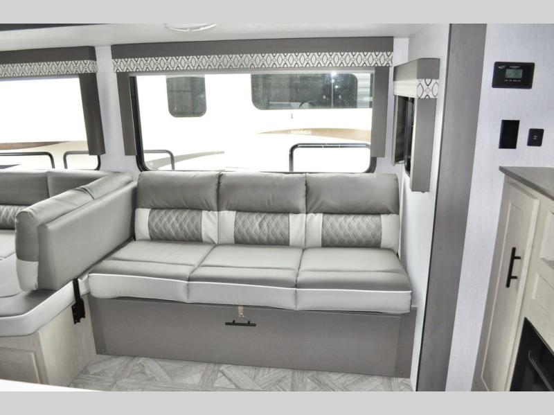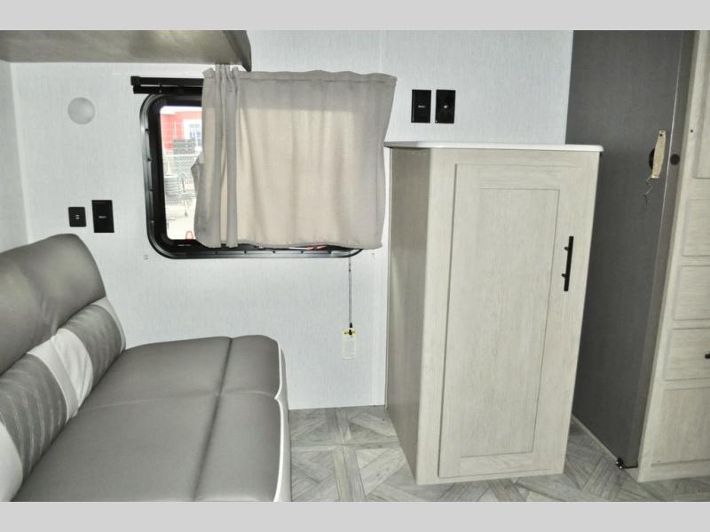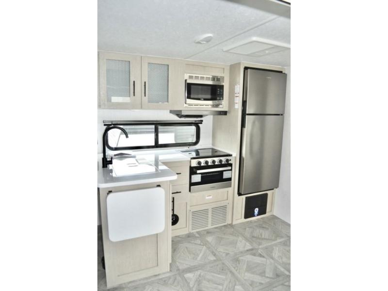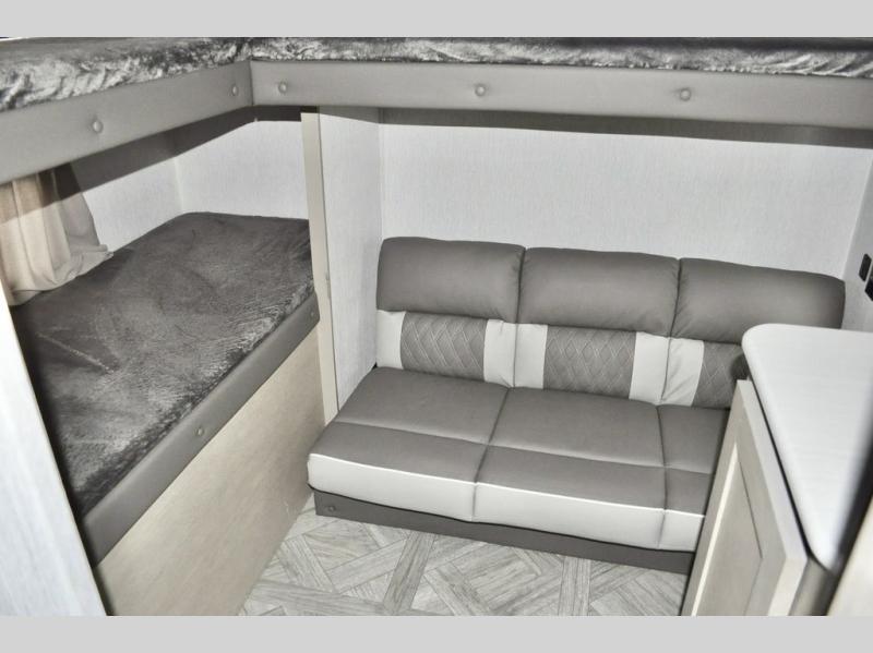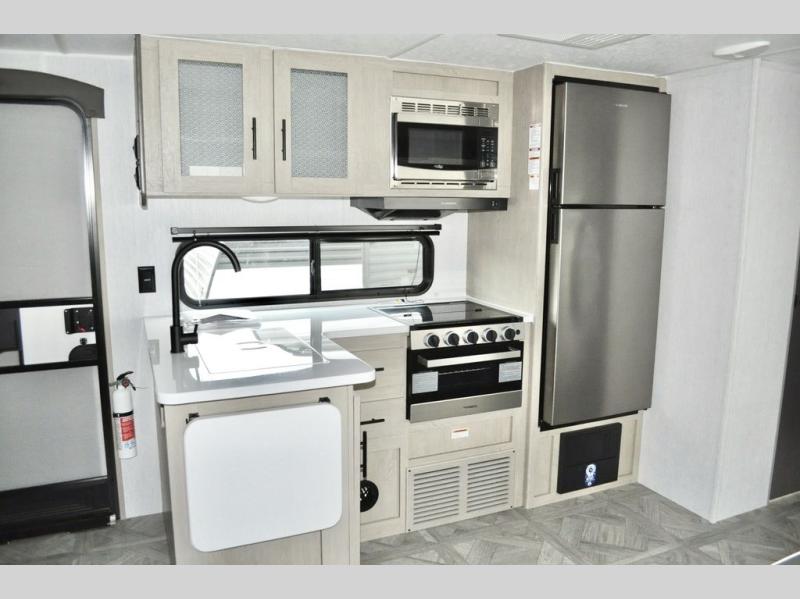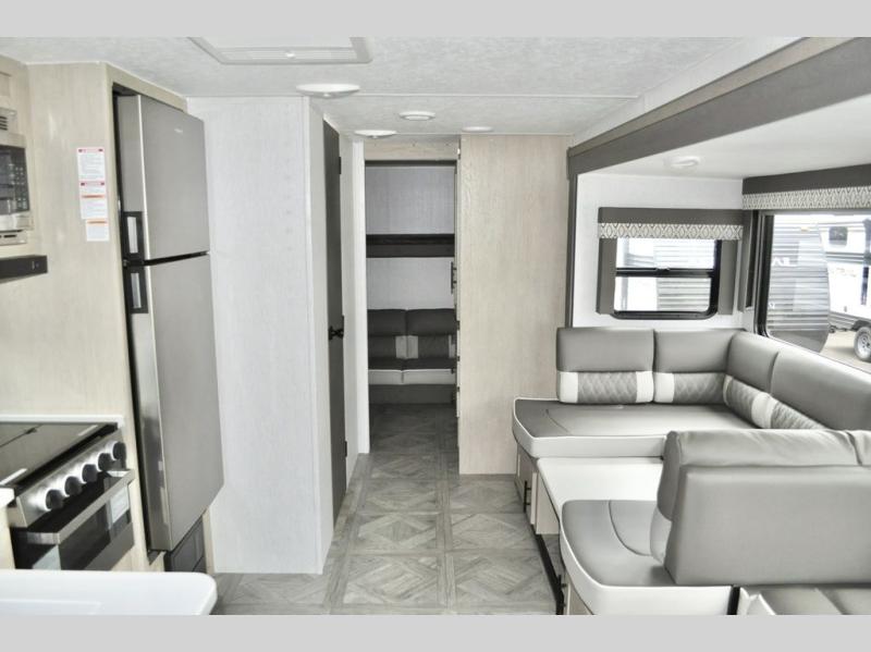 When you have a private bunkhouse in your trailer, you can allow the kids to have their own space or offer friends an overnight place to call their own! The rear bunkhouse includes a space saving sliding door for privacy, a jiffy sofa to relax on and two bunk beds, plus a wardrobe and entertainment center. The full bathroom is nearby, and the main living and kitchen area is spacious with a slide out U-shaped dinette and sofa. There are full amenities in the galley kitchen, a pantry for dry goods, plus a fireplace for all to enjoy. And the front bedroom allows you to sleep like a queen and keep everything tidy thanks to all the storage. And you might like to add the camp kitchen option if you enjoy cooking in the outdoors.