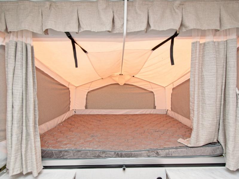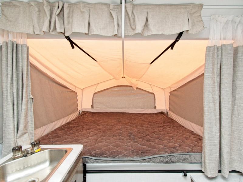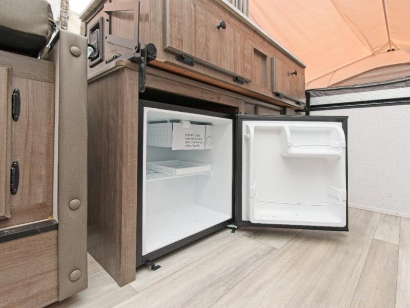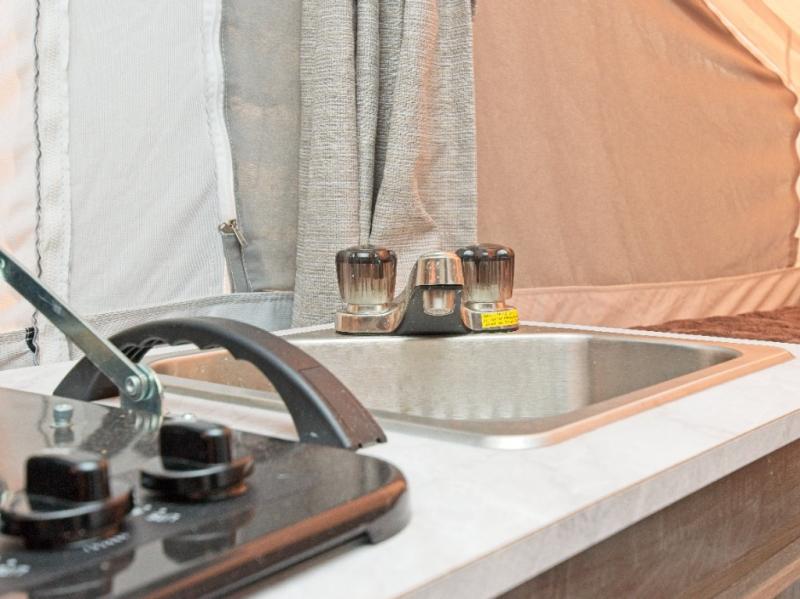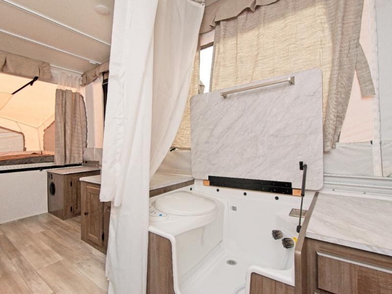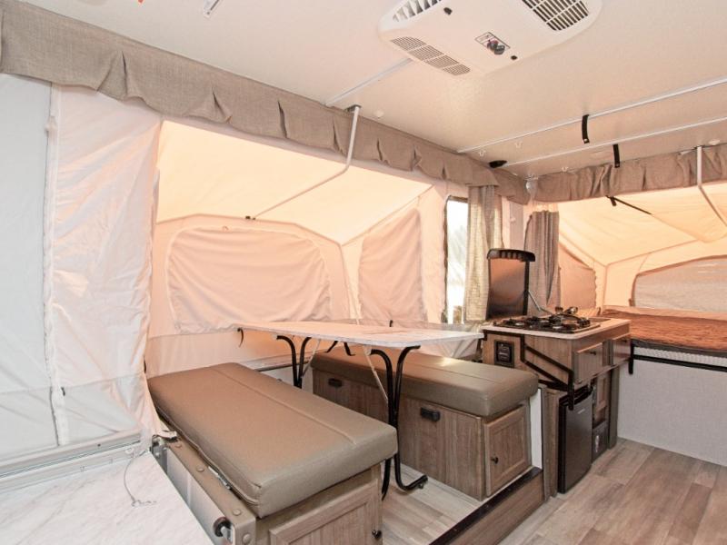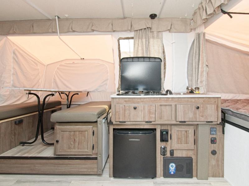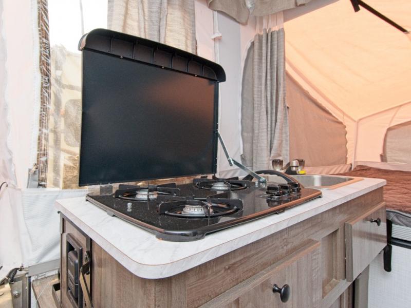 Inside, you’ll find four storage cabinets, a slide-out dinette for added room to move, and tent beds at both ends for cozy sleeping. Cook meals indoors with the three-burner range, or take the experience outside with the exterior griddle. The booth dinette doubles as a sleeping area, and the cassette toilet with shower lets you freshen up without leaving the campsite.